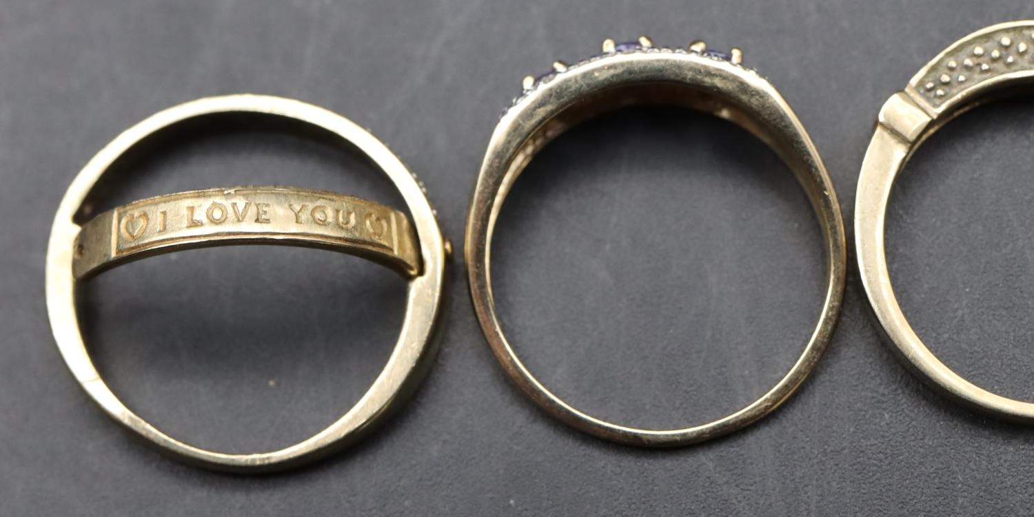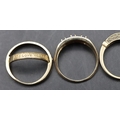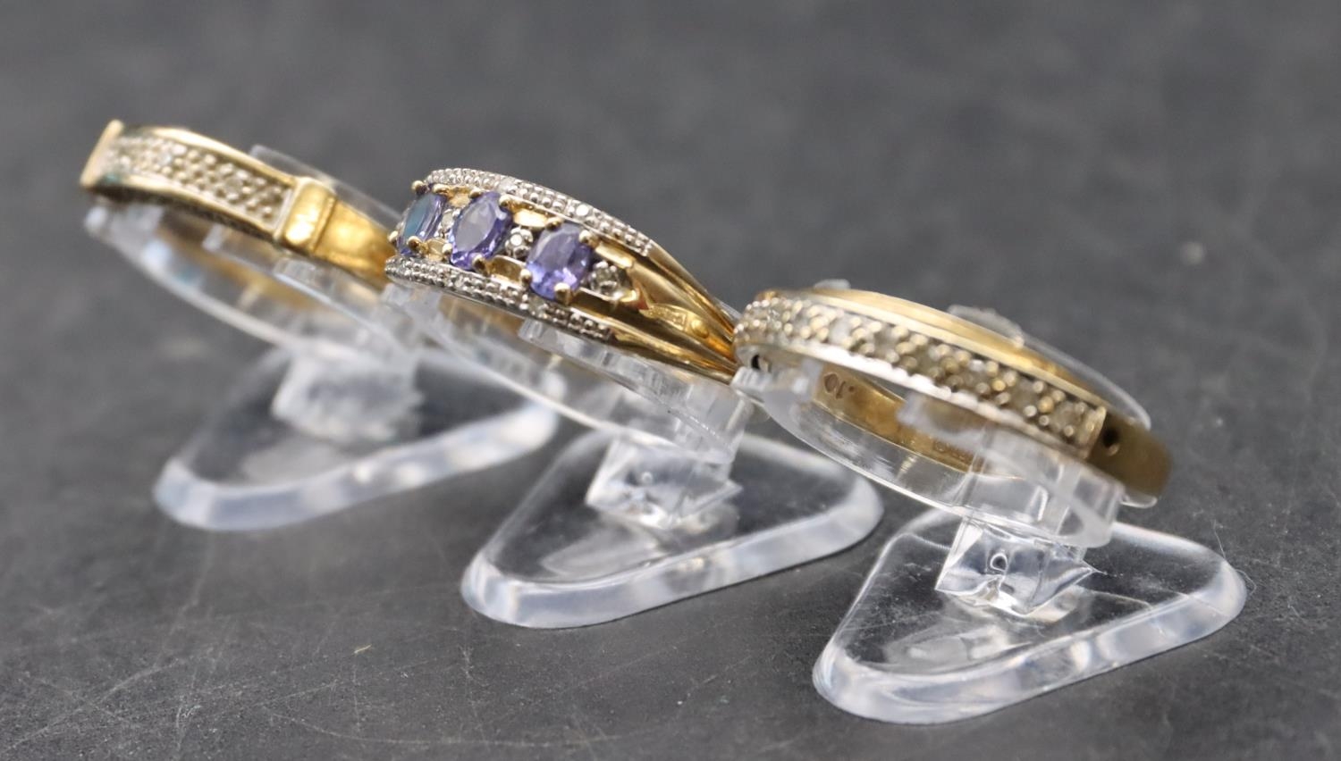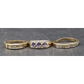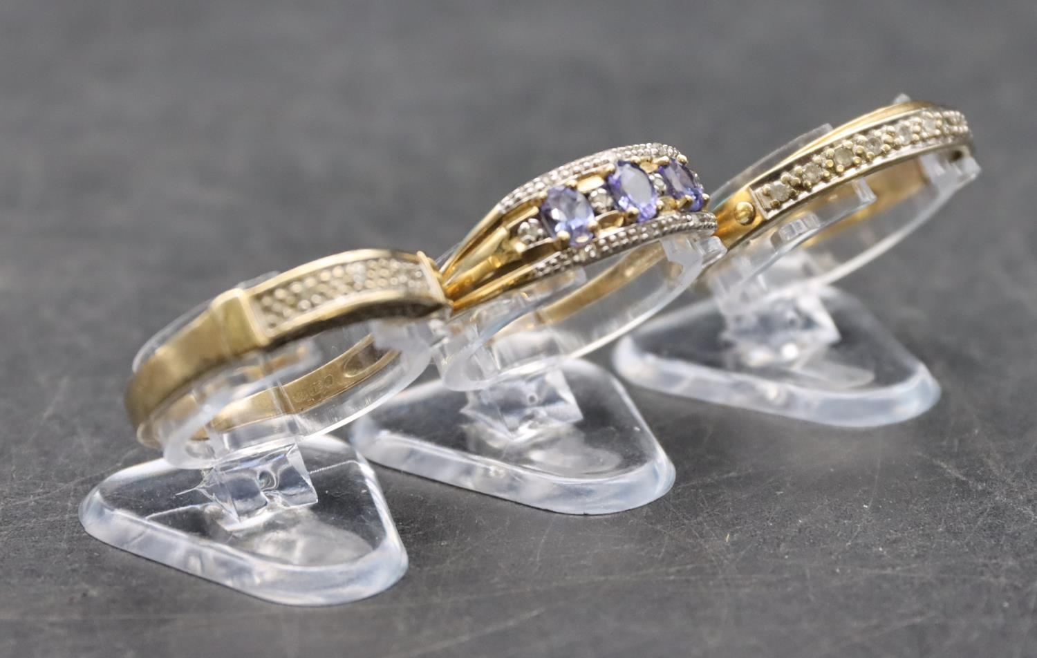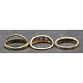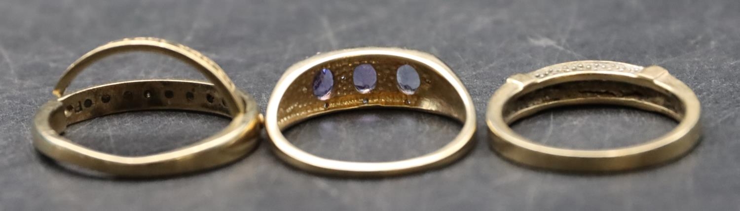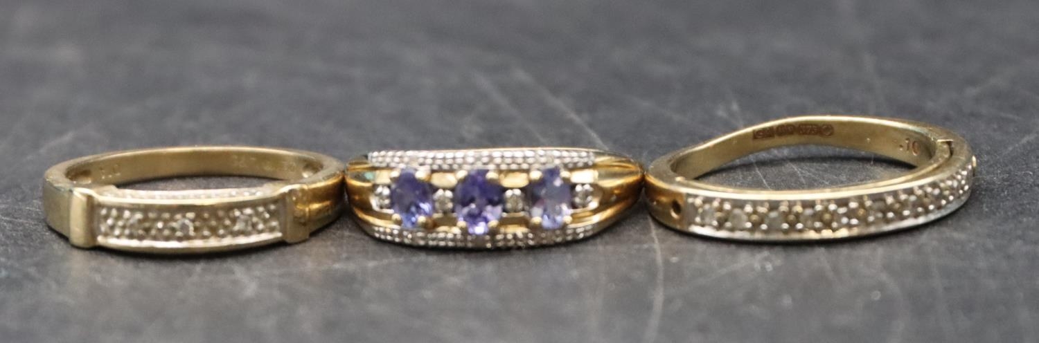 A ladies' 9ct gold ring set with 3 blue stones interspersed by small diamond chips, Size P/Q and 2 9ct gold half eternity style rings set with small diamond chips, Size O and P, 8.1 grams gross (3)