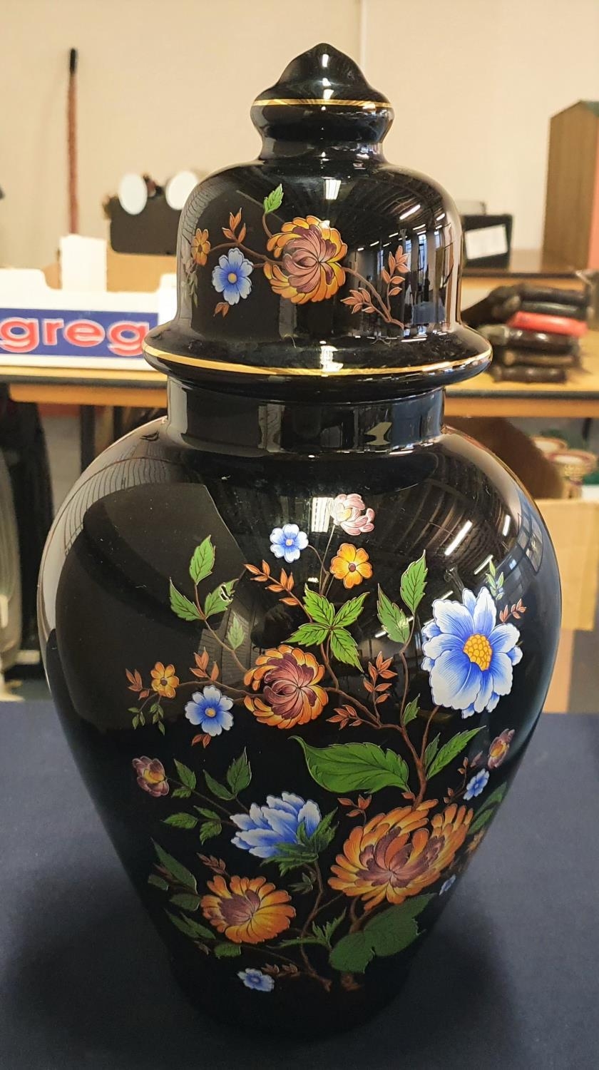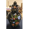 Fine quality, unmarked black porcelain lidded vase with floral decoration,