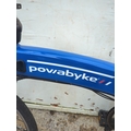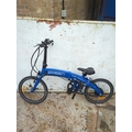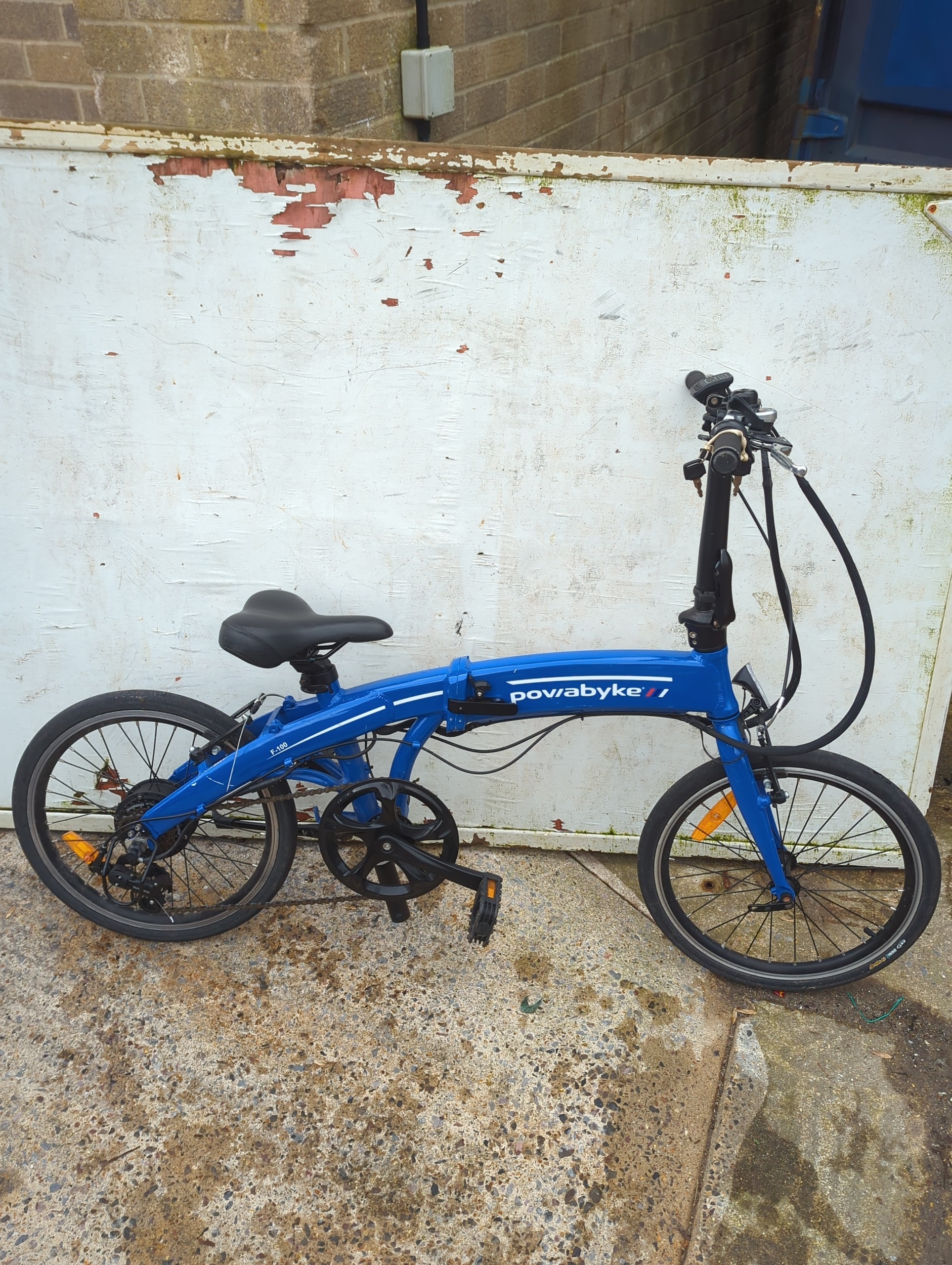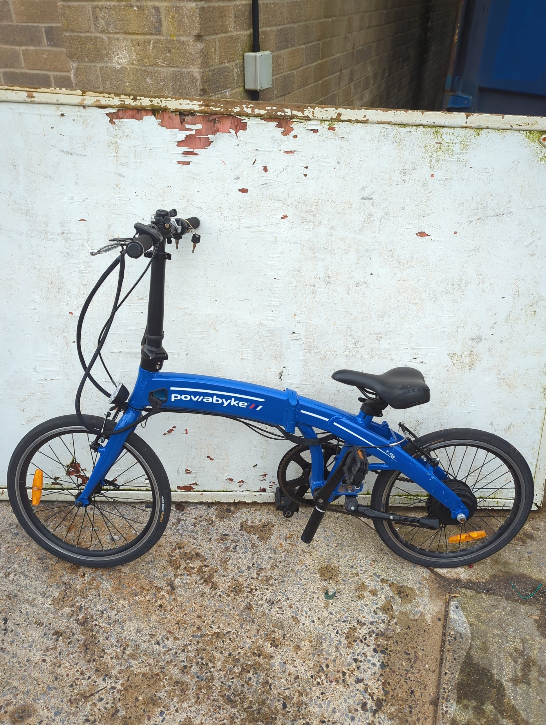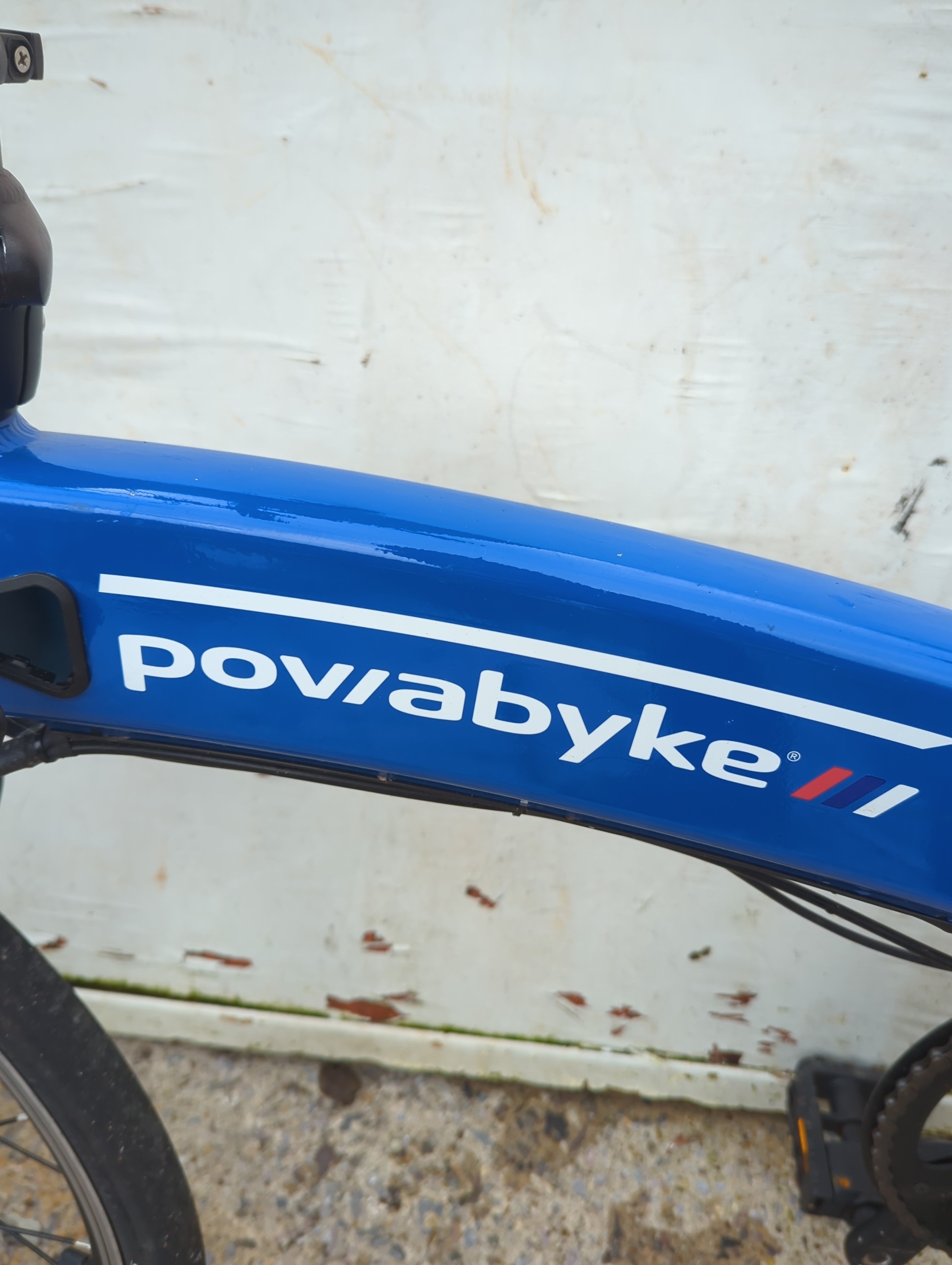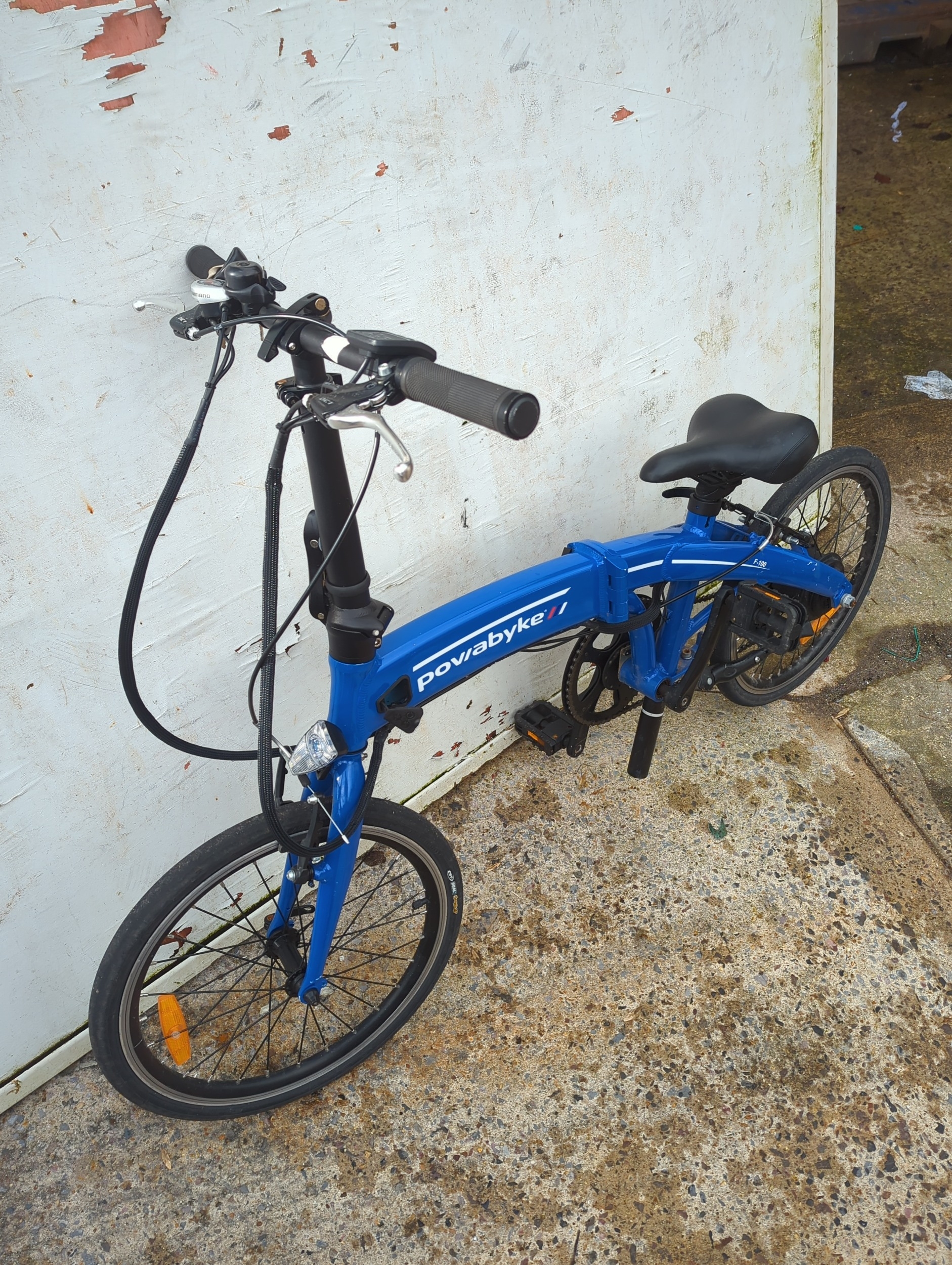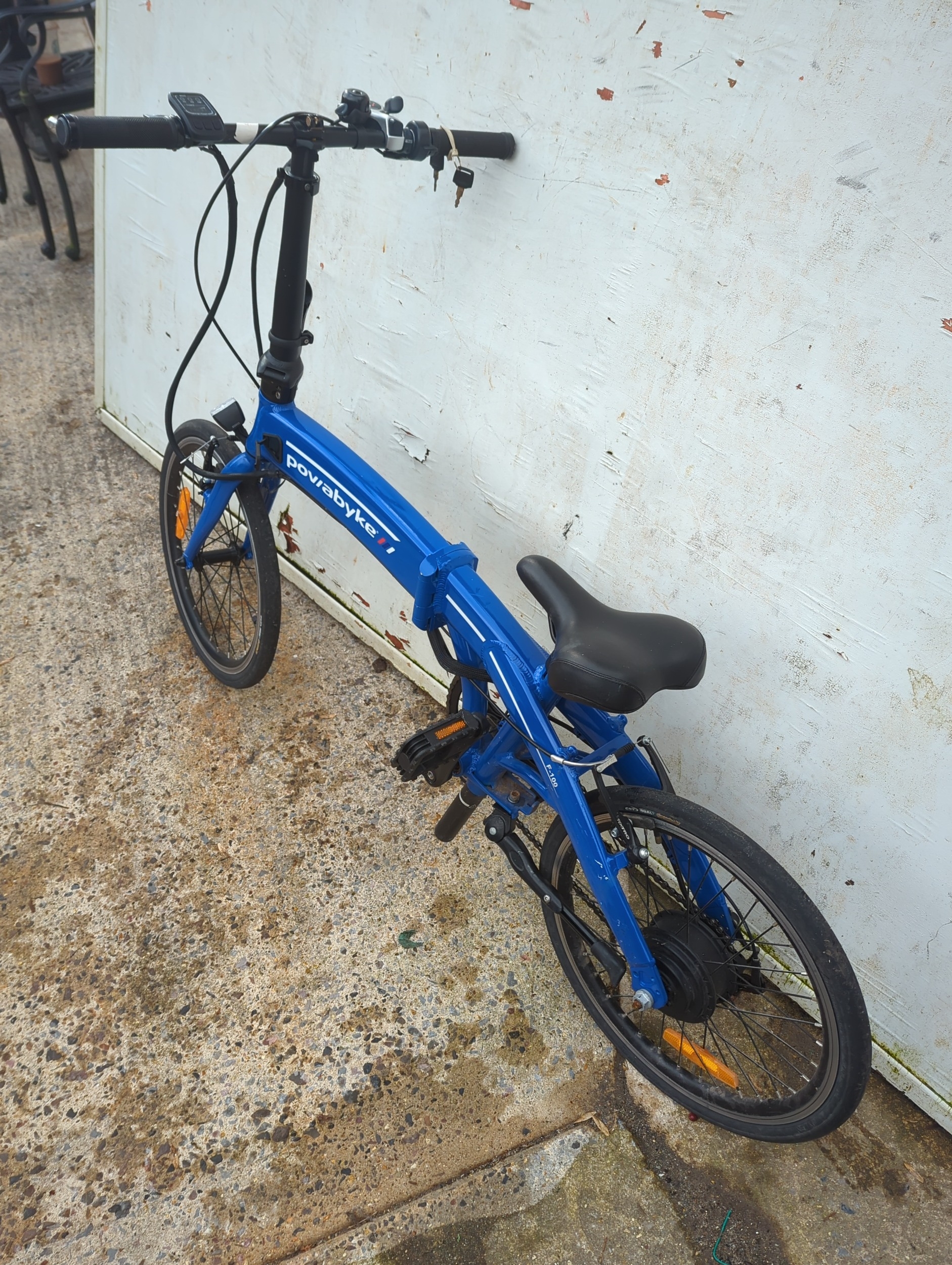 This is a blue Powabyke E-610 folding bicycle, designed for convenient transport and storage. The bicycle features a folding frame and standard handlebar and seat setup. It is equipped with two wheels and a simplistic design, suitable for urban commuting and recreational use.