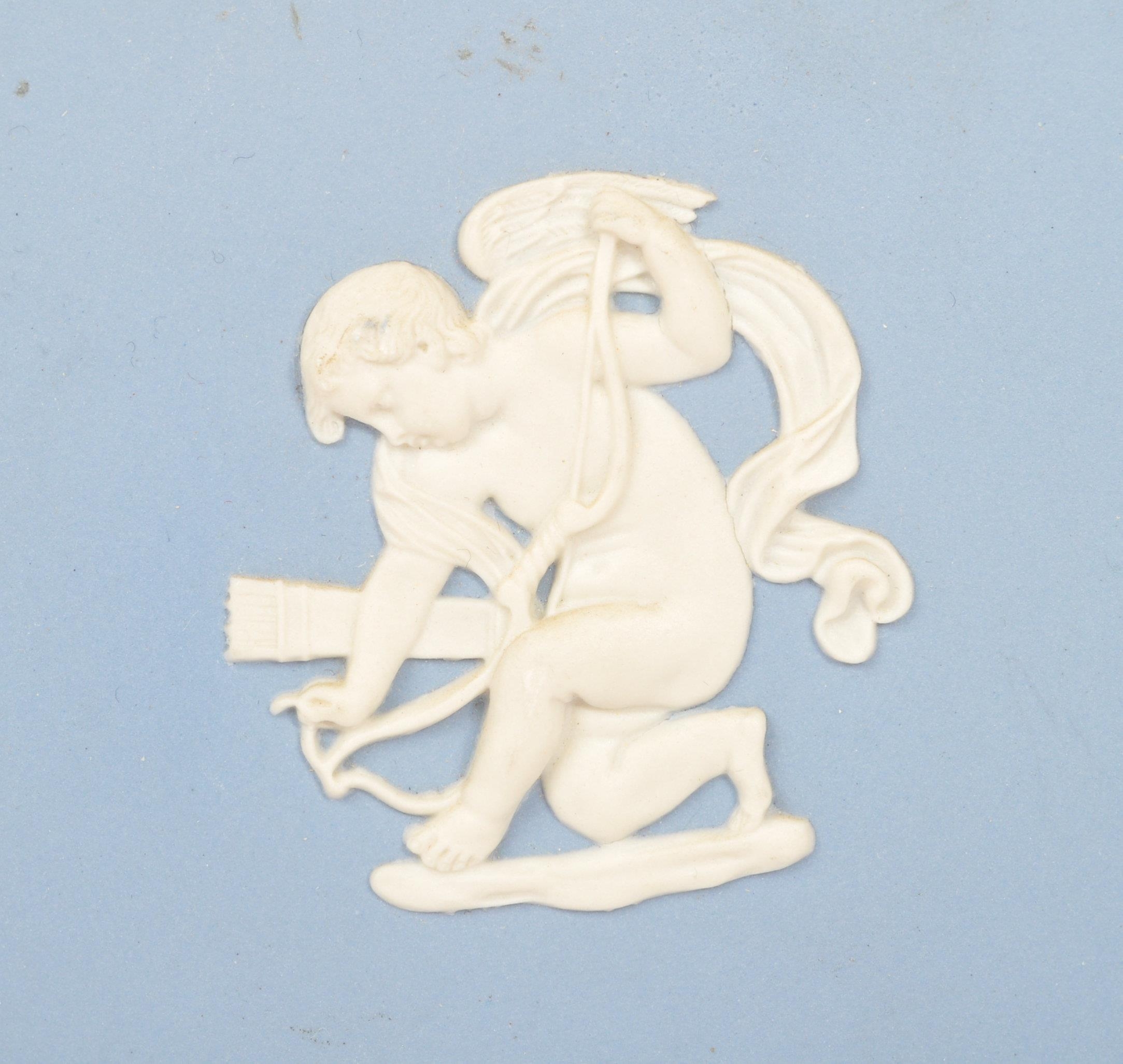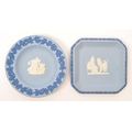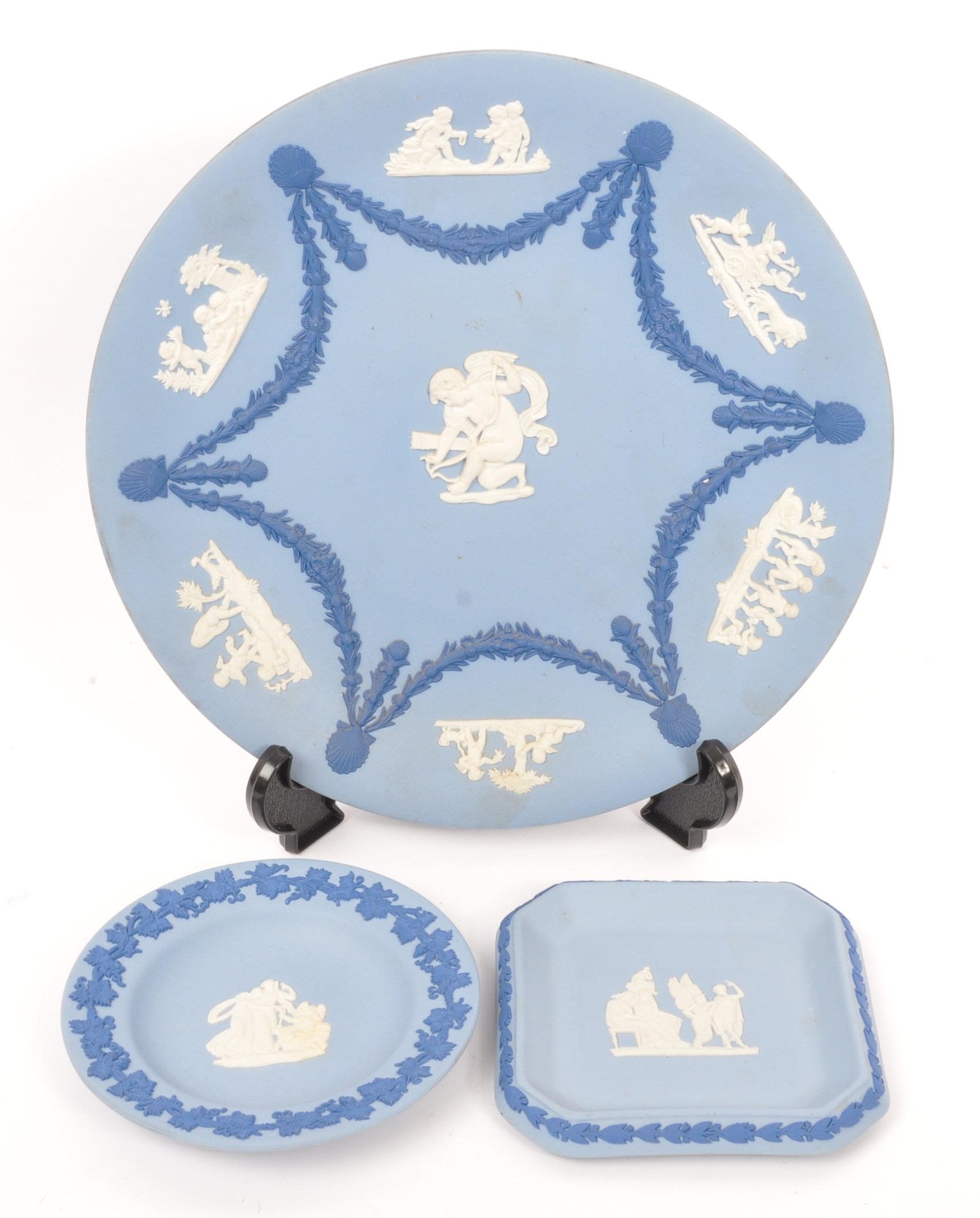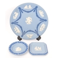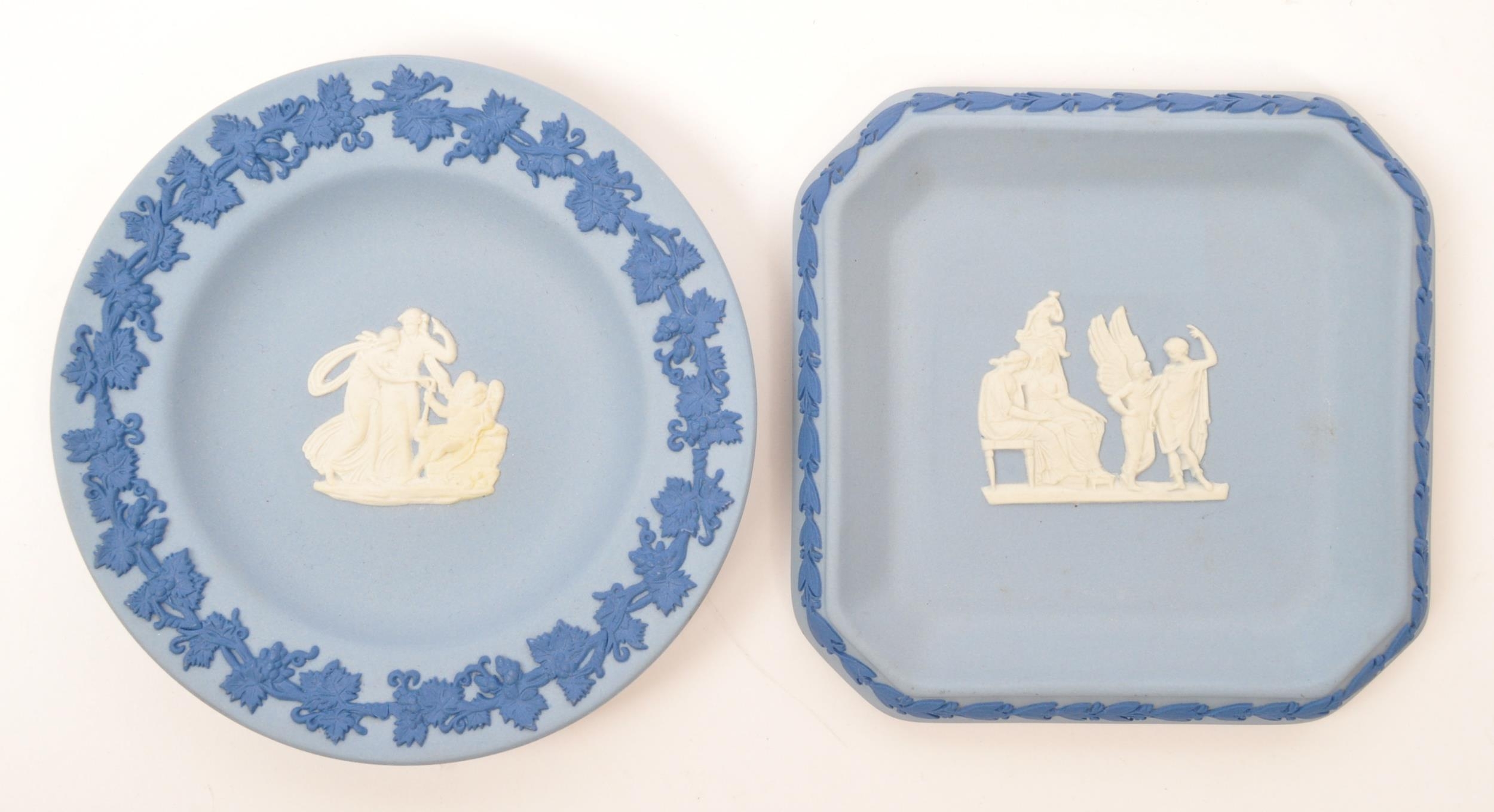 Wedgwood - Three pieces of 20th century Wedgwood jasperware tricolour pieces to include a square dish featuring relief of Icarus and Daedalus, a circular dish featuring Cupid Asleep and a cabinet plate having central and side relief works of cupid. Each having jasper ground, Portland blue sprigs and white figural work. Stamped to base.