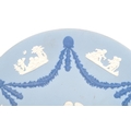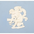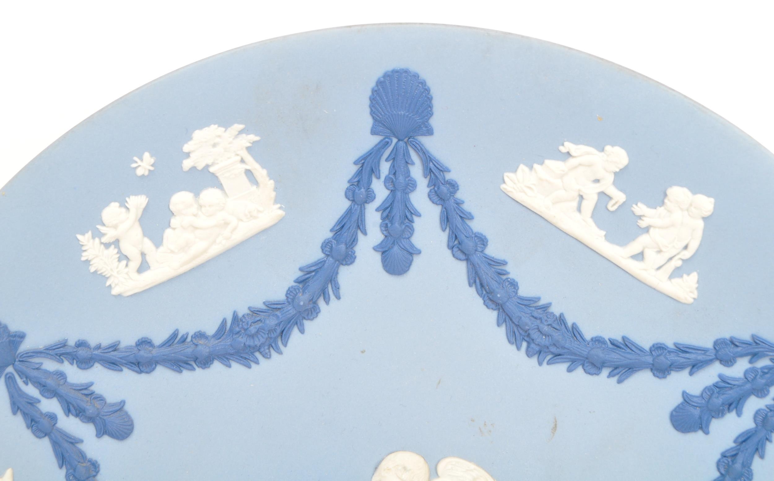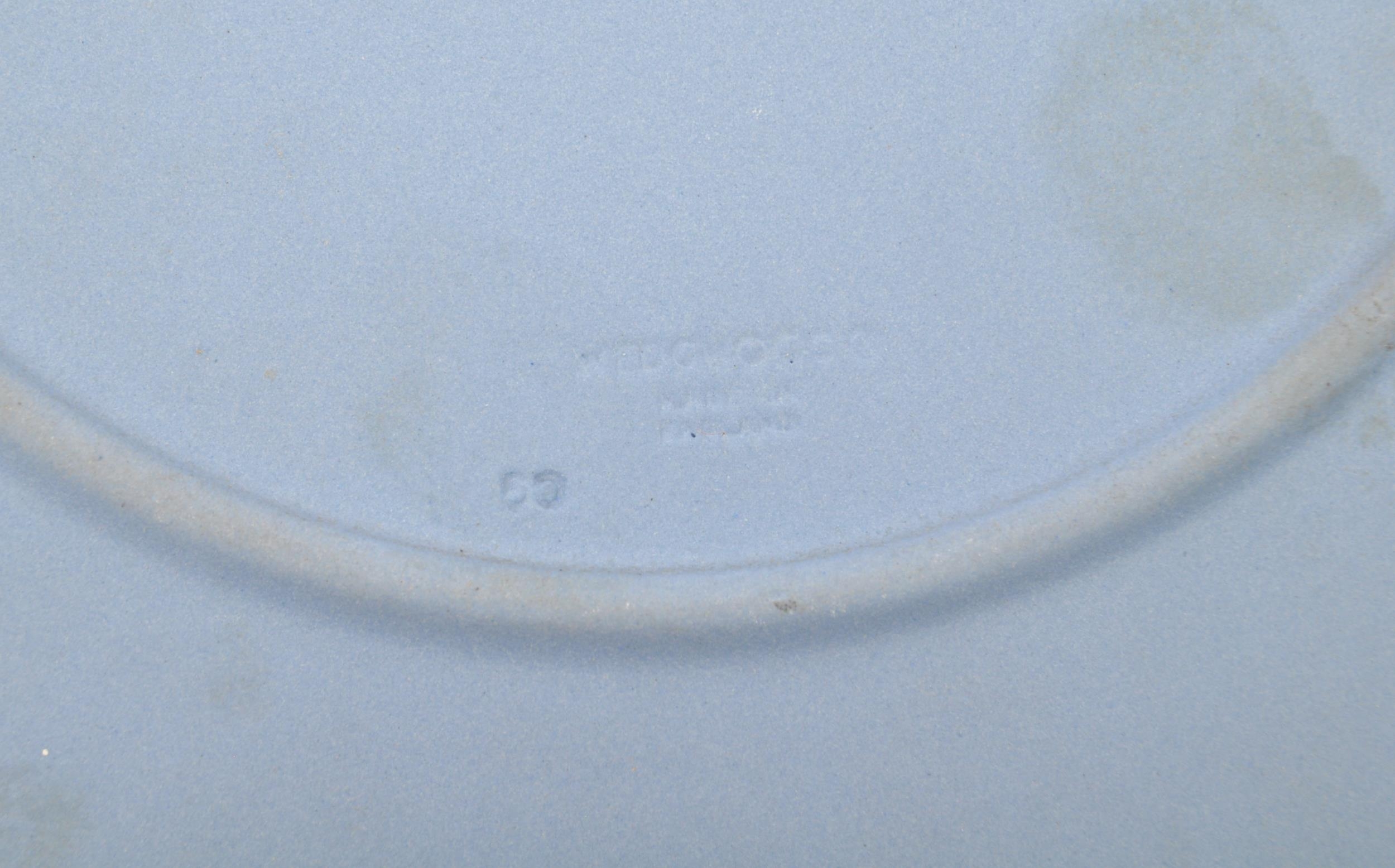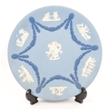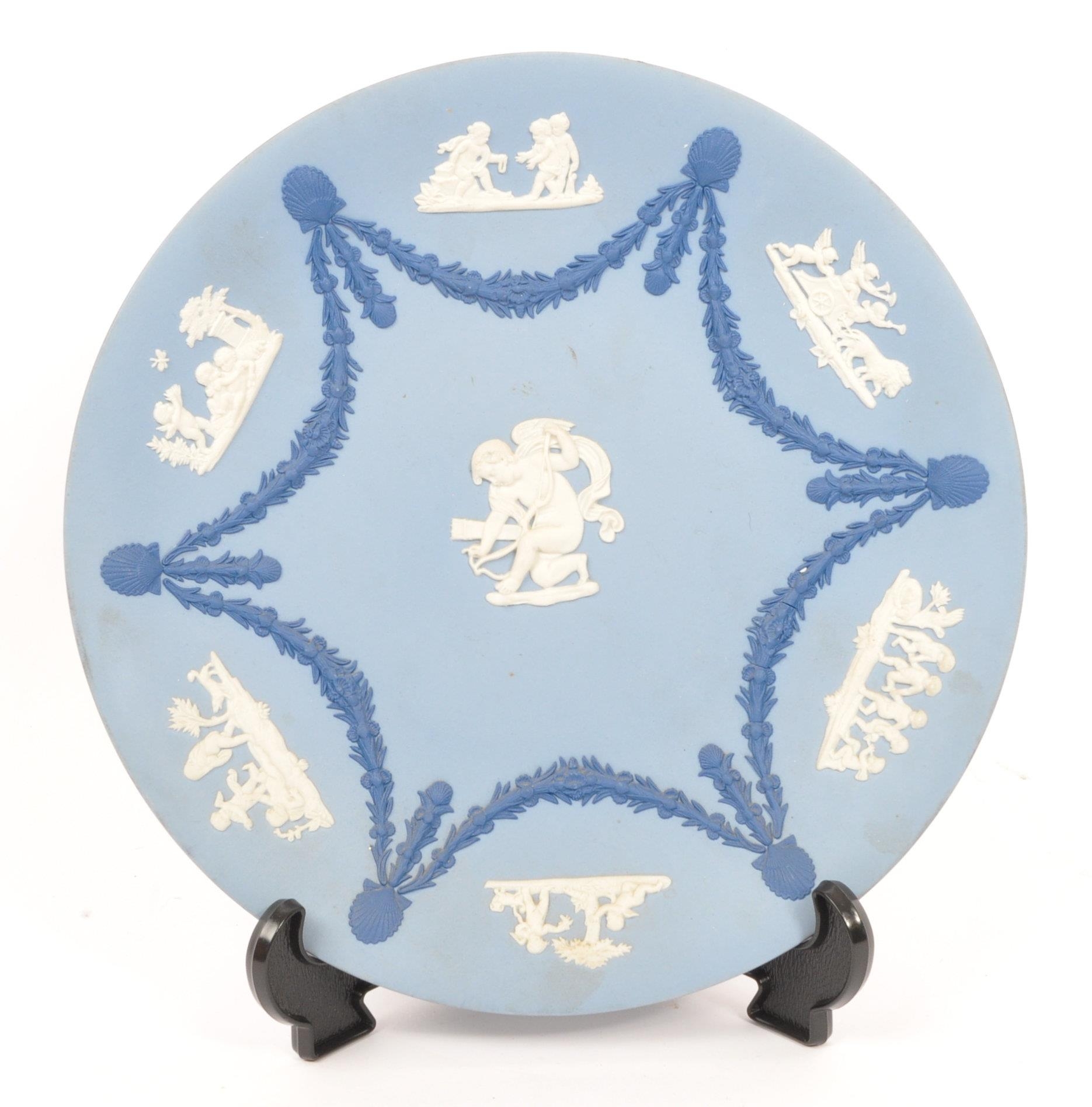 Wedgwood - Three pieces of 20th century Wedgwood jasperware tricolour pieces to include a square dish featuring relief of Icarus and Daedalus, a circular dish featuring Cupid Asleep and a cabinet plate having central and side relief works of cupid. Each having jasper ground, Portland blue sprigs and white figural work. Stamped to base.