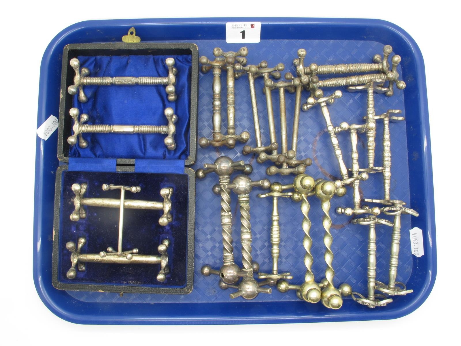 A Collection of Assorted Plated Knife Rests, including a dainty single hallmarked silver knife rest, a pair of plated knife rests in a fitted case etc :- One Tray