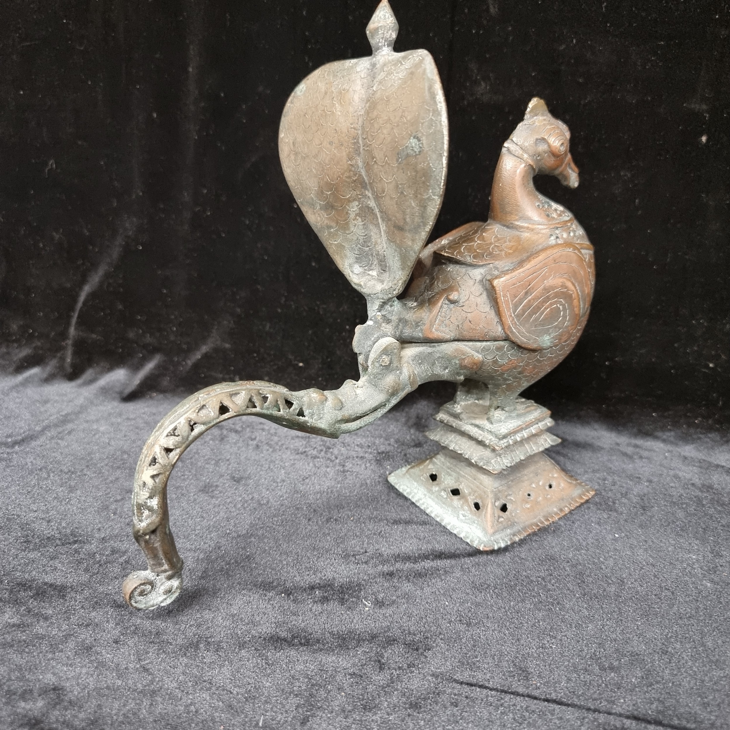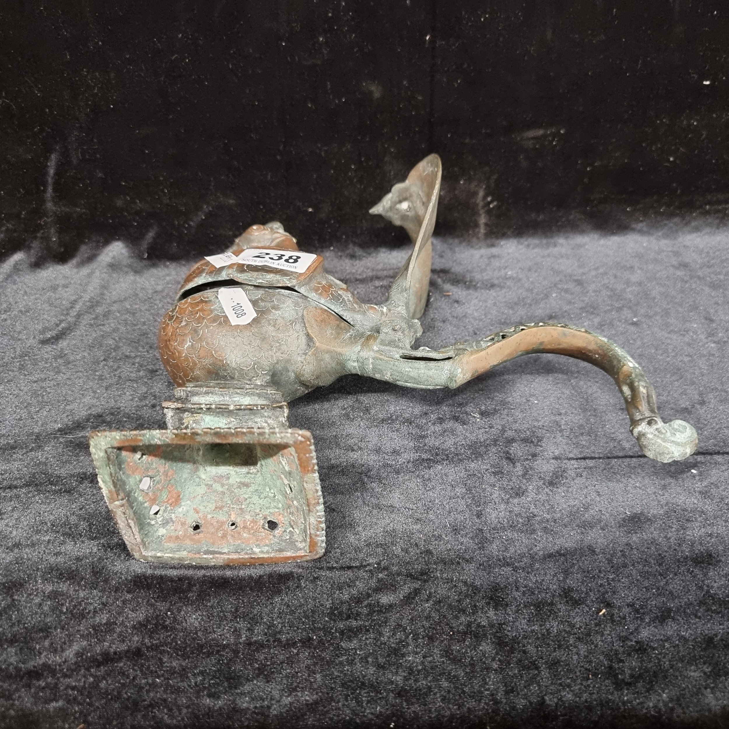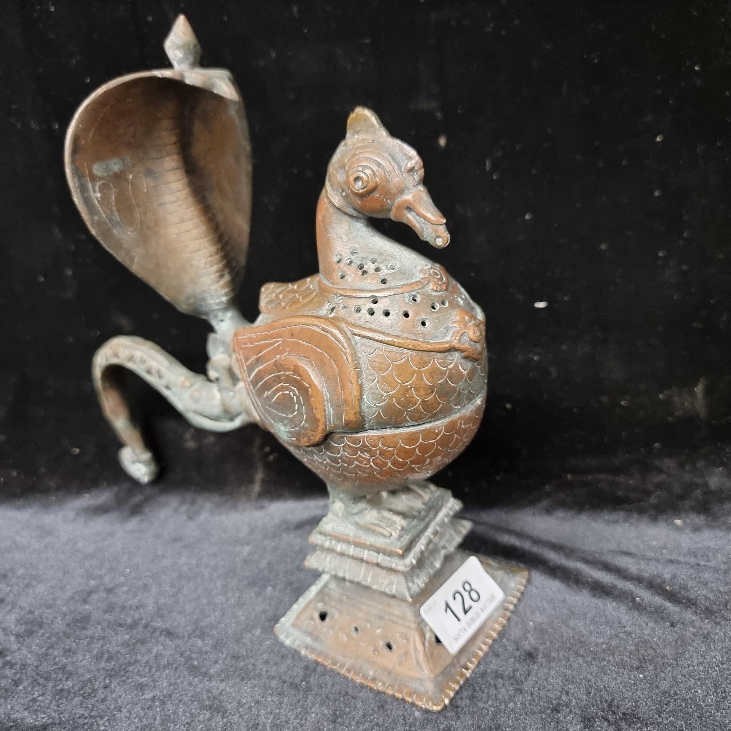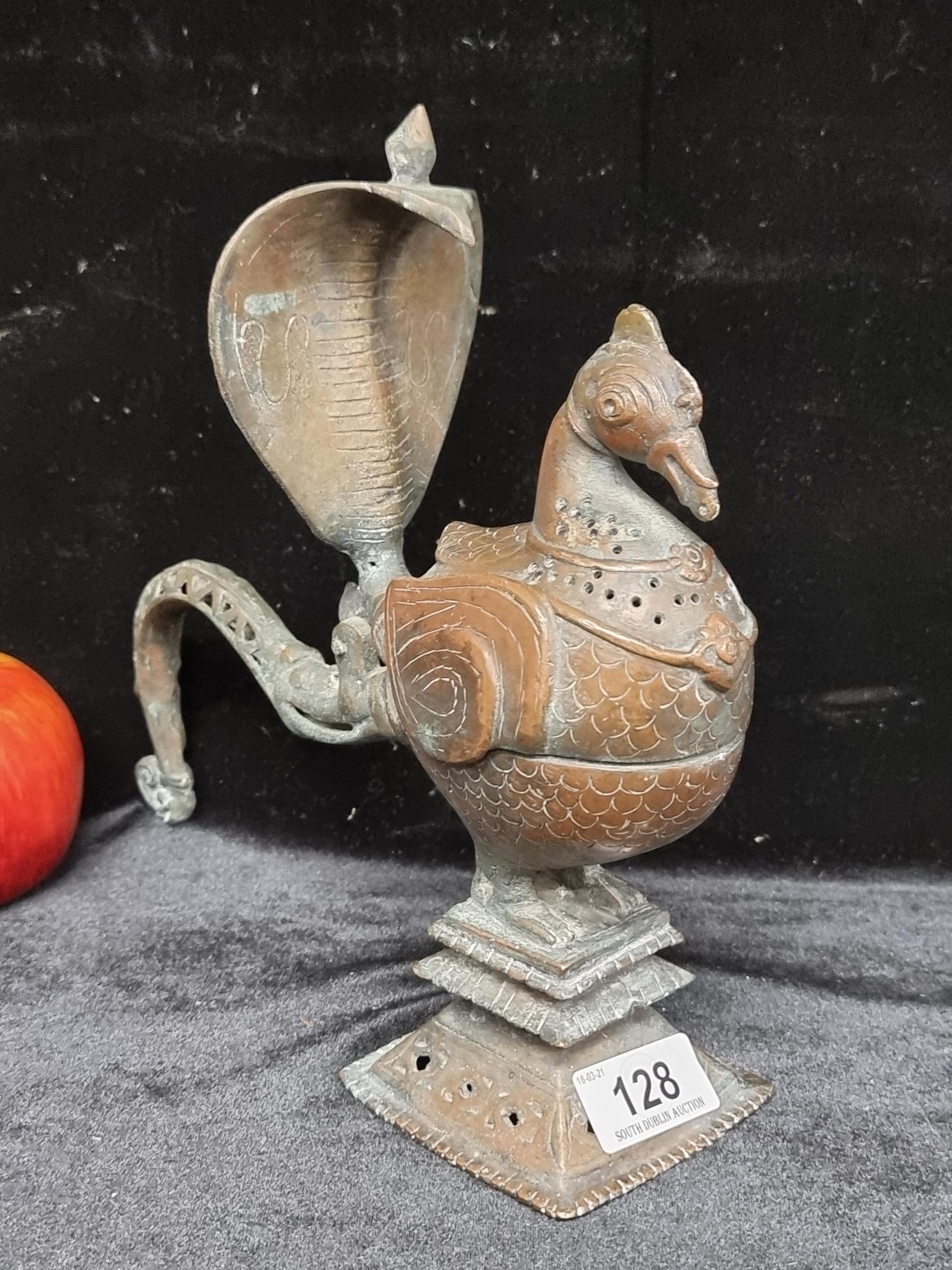 Star Lot : Very Rare 18th century Indo Persian Incense burner with a bird in Jeopardy due to an impending attack by a Cobra. Amazing piece. From an Excellent private collection.