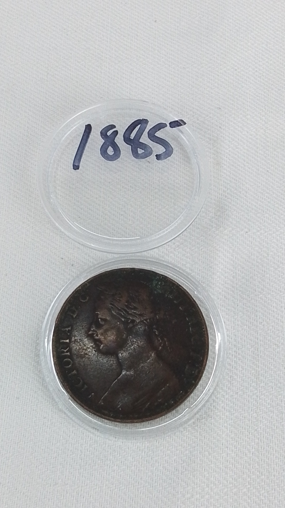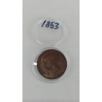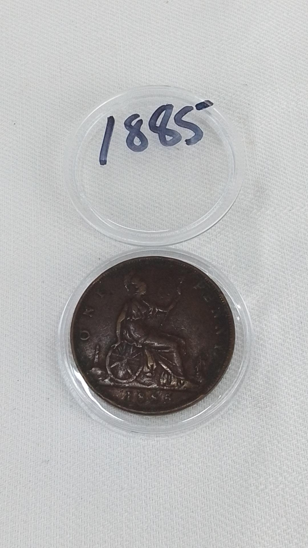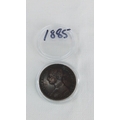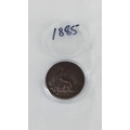 A cased Queen Victoria copper one penny dated 1885.