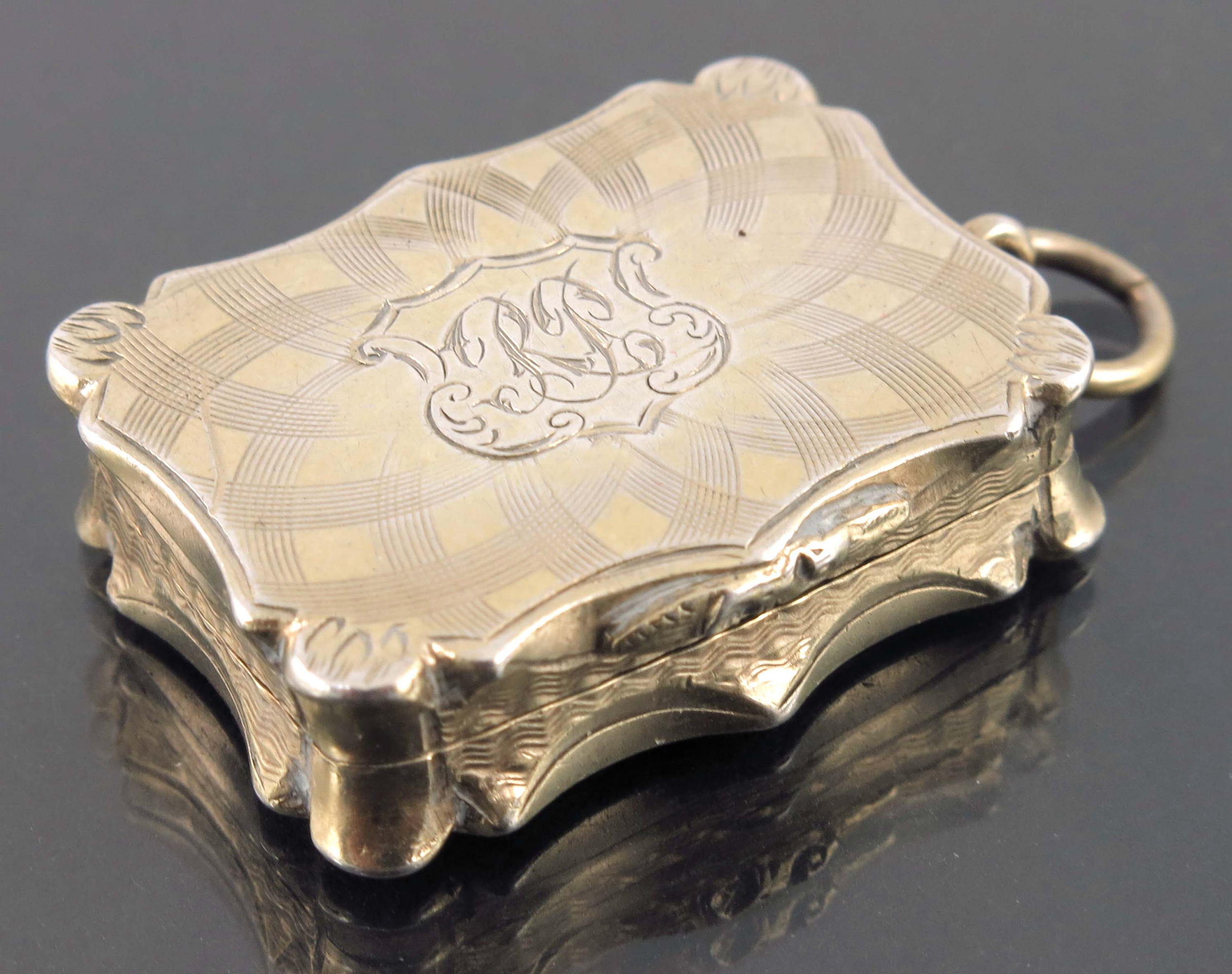 A Victorian silver gilt vinaigrette, Nathaniel Mills, Birmingham 1844, ogee border, engraved with a lattice of radiating spiral sections, pierced foliate scroll grille, on fob suspension, 3cm x 2cm, 0.33ozt