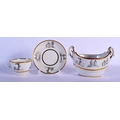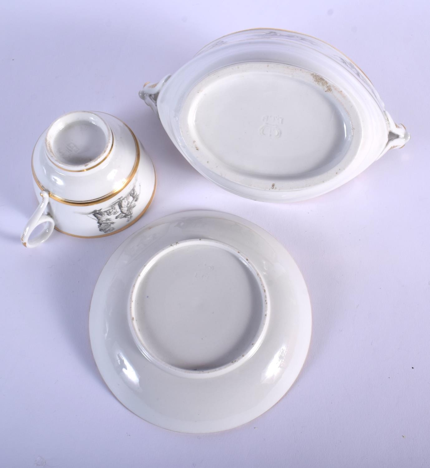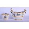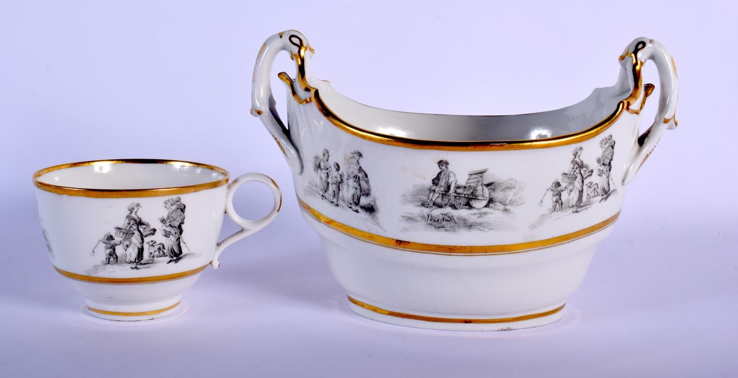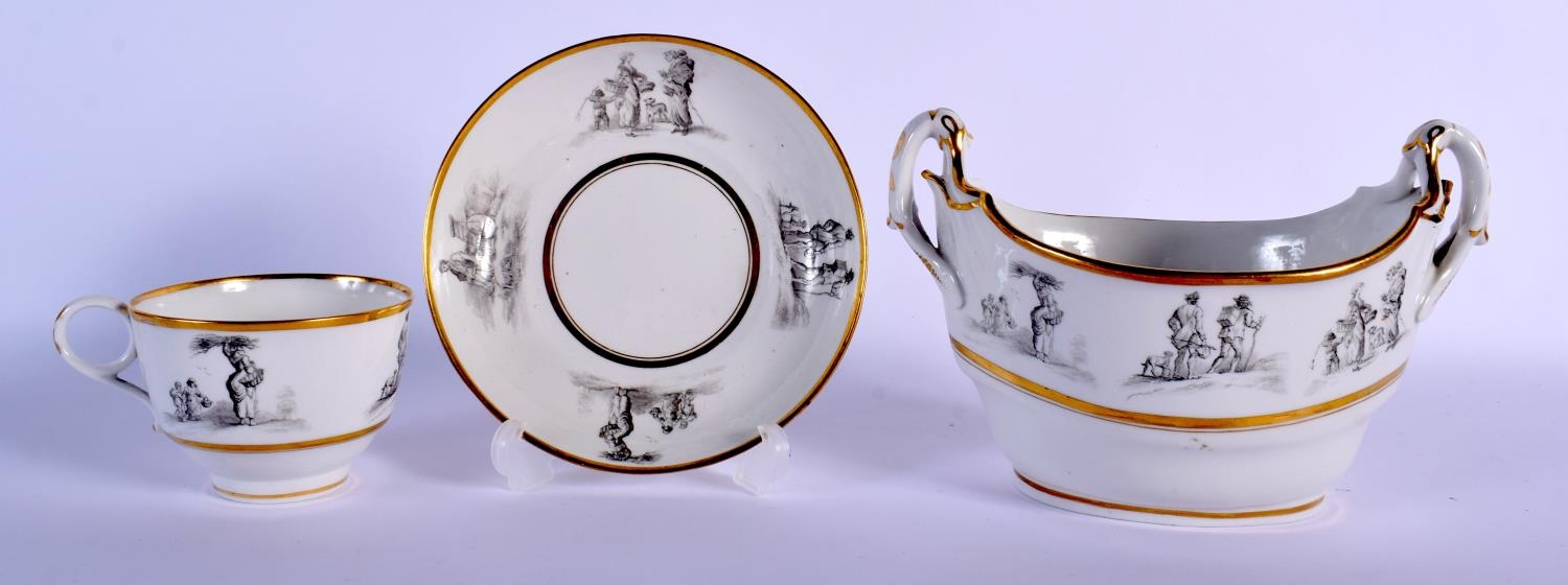 19TH C. BARR FLIGHT AND BARR WORCESTER TEACUP AND SAUCER BAT PRINTED WITH COUNTRY FOLK AND A BOAT-SHAPED SUCRIER WITH THE SAME DECORATION. Cup 6cm high, Saucer 14cm diameter, sucrier 12.5cm high (3)