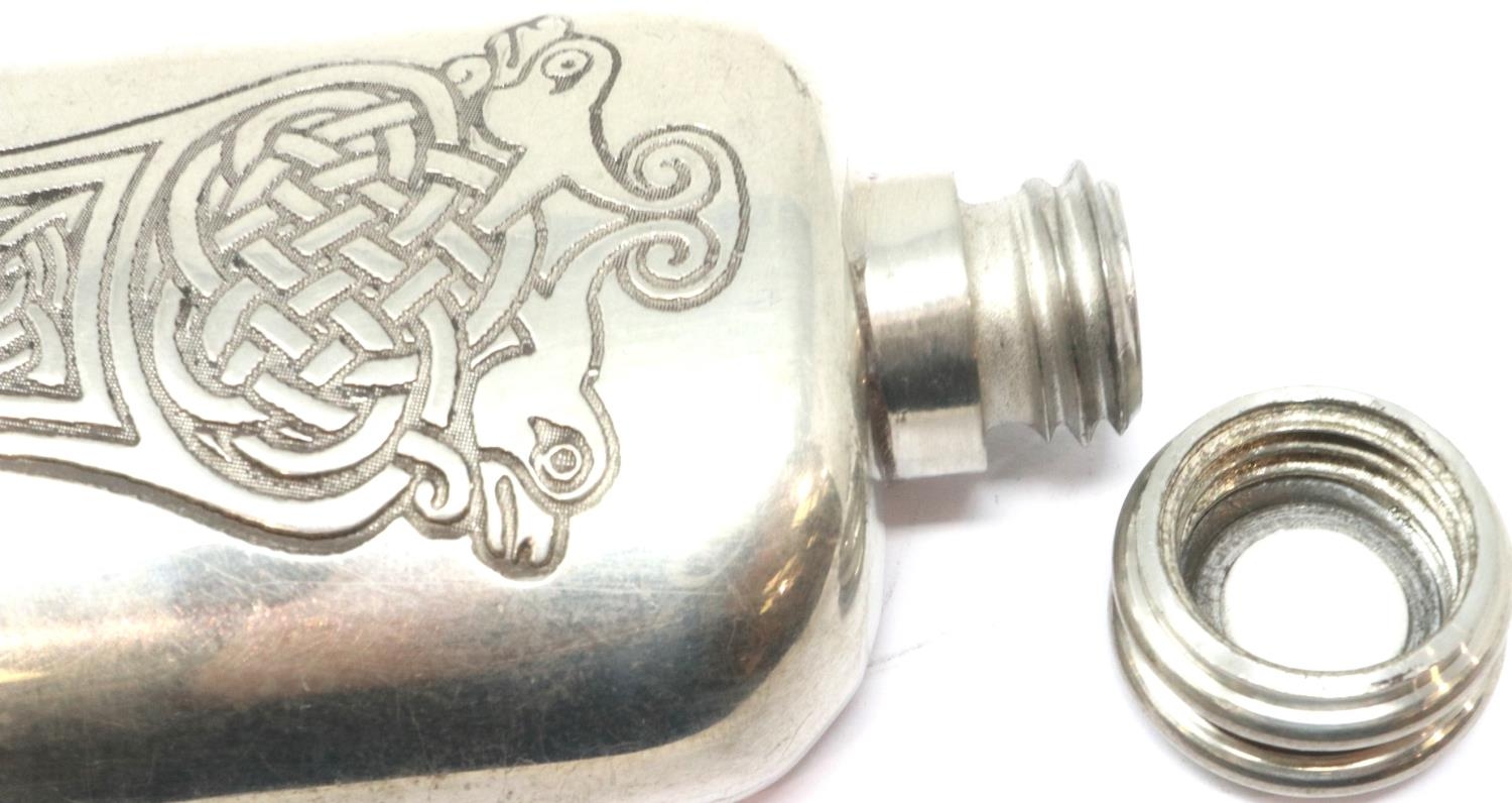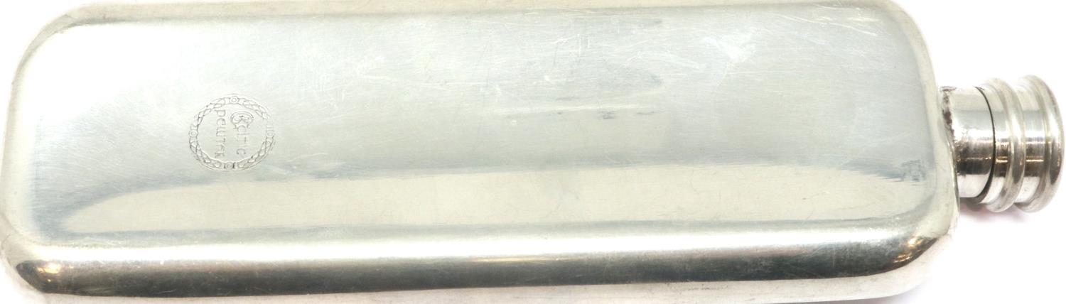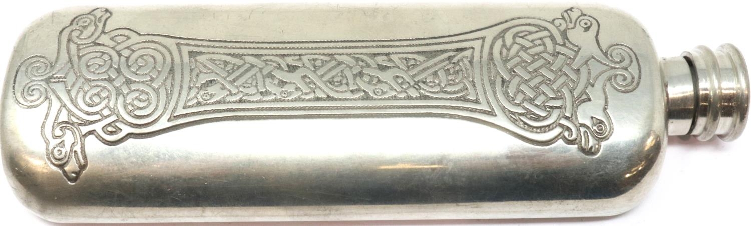 Celtic Pewter hip flask, L: 15 cm. P&P Group 1 (£14+VAT for the first lot and £1+VAT for subsequent lots)