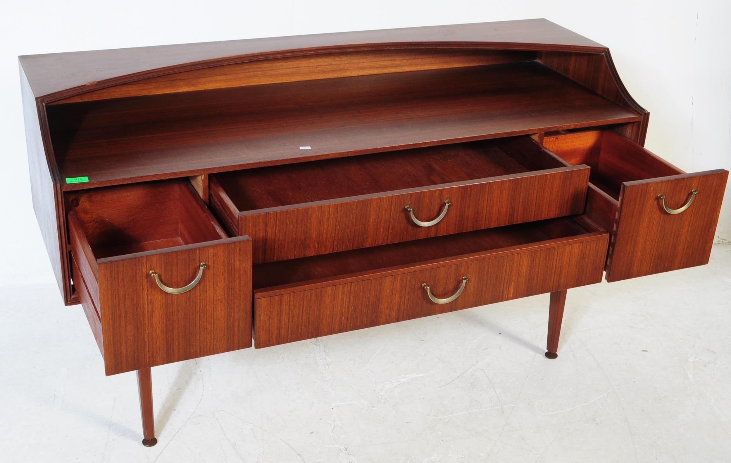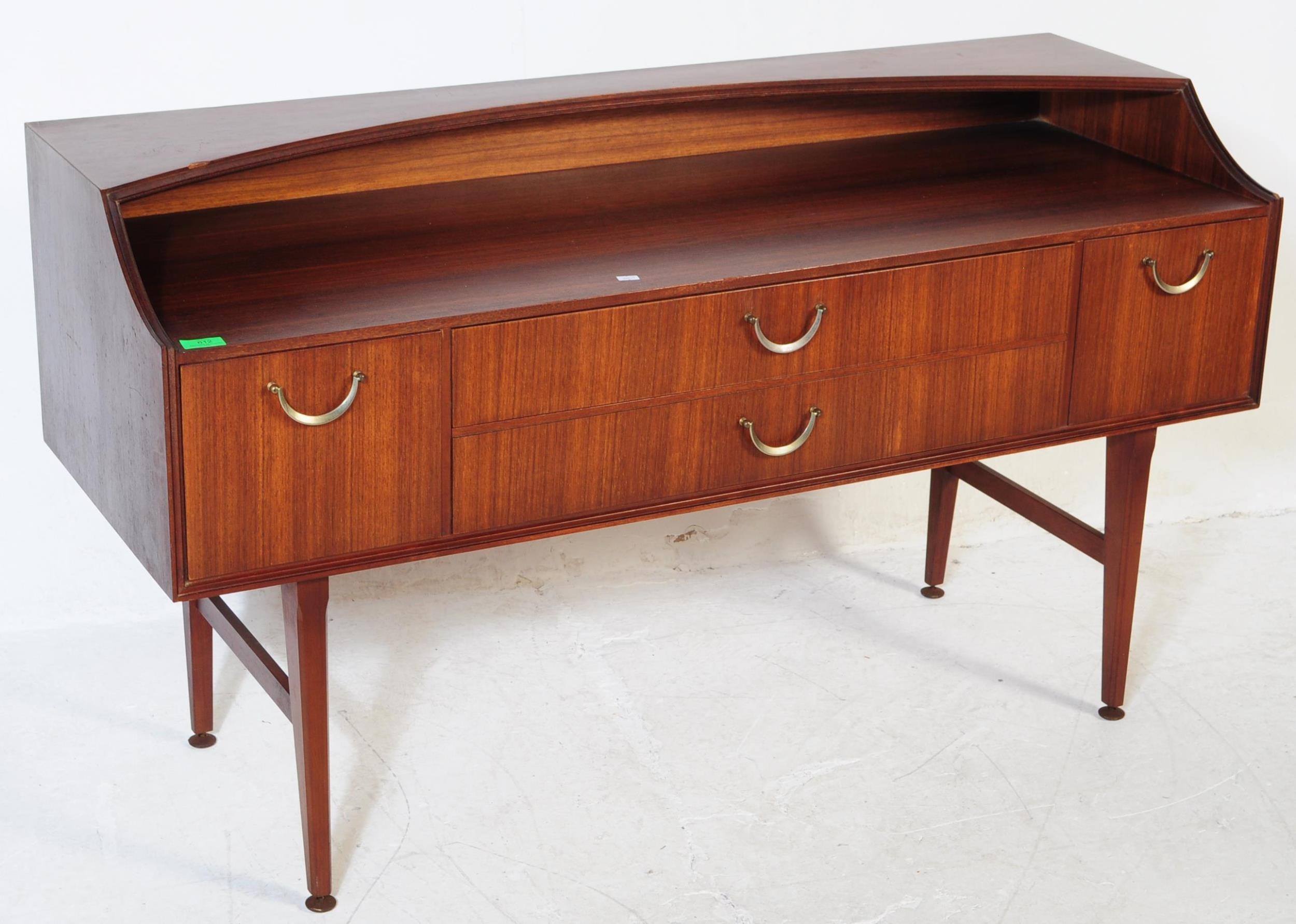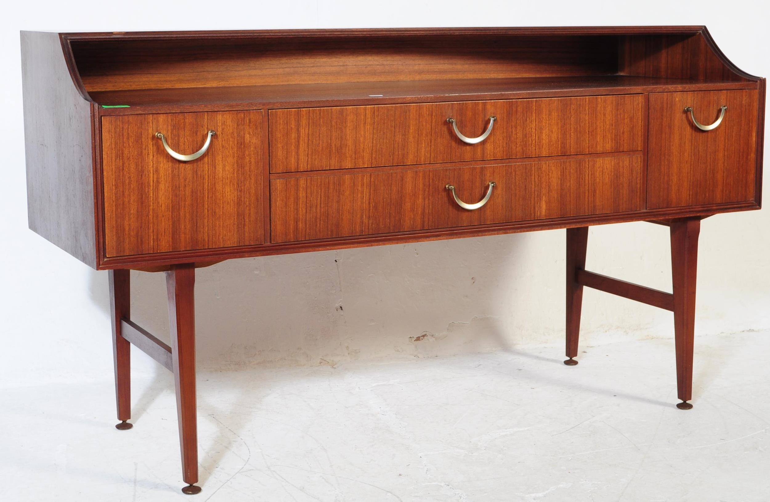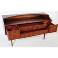 Meredew - A retro mid 20th century circa 1970s afromosia teak sideboard. The credenza having shelved top over a central bank of twin drawers flanked by cupboards to either side, each with half hoop metal handles, raised over tapering supports united by stretchers. Measures approx: 73x130x54cm
