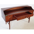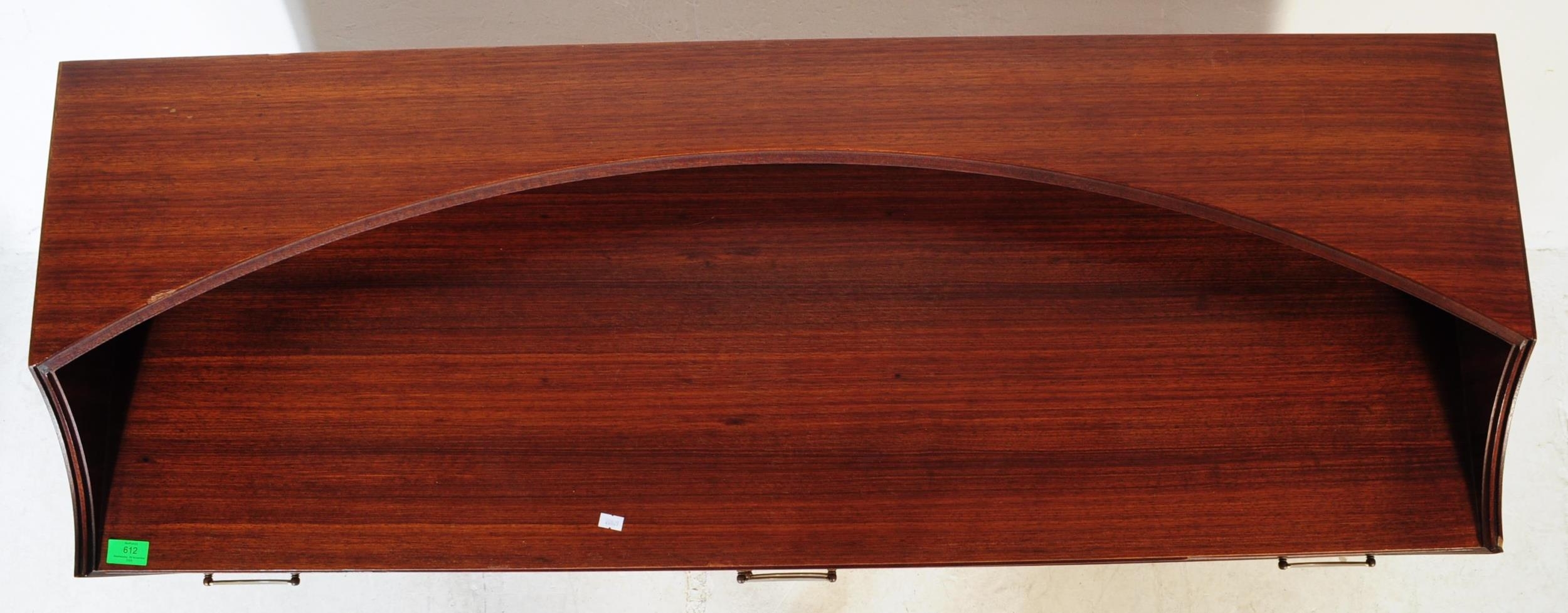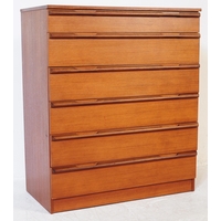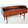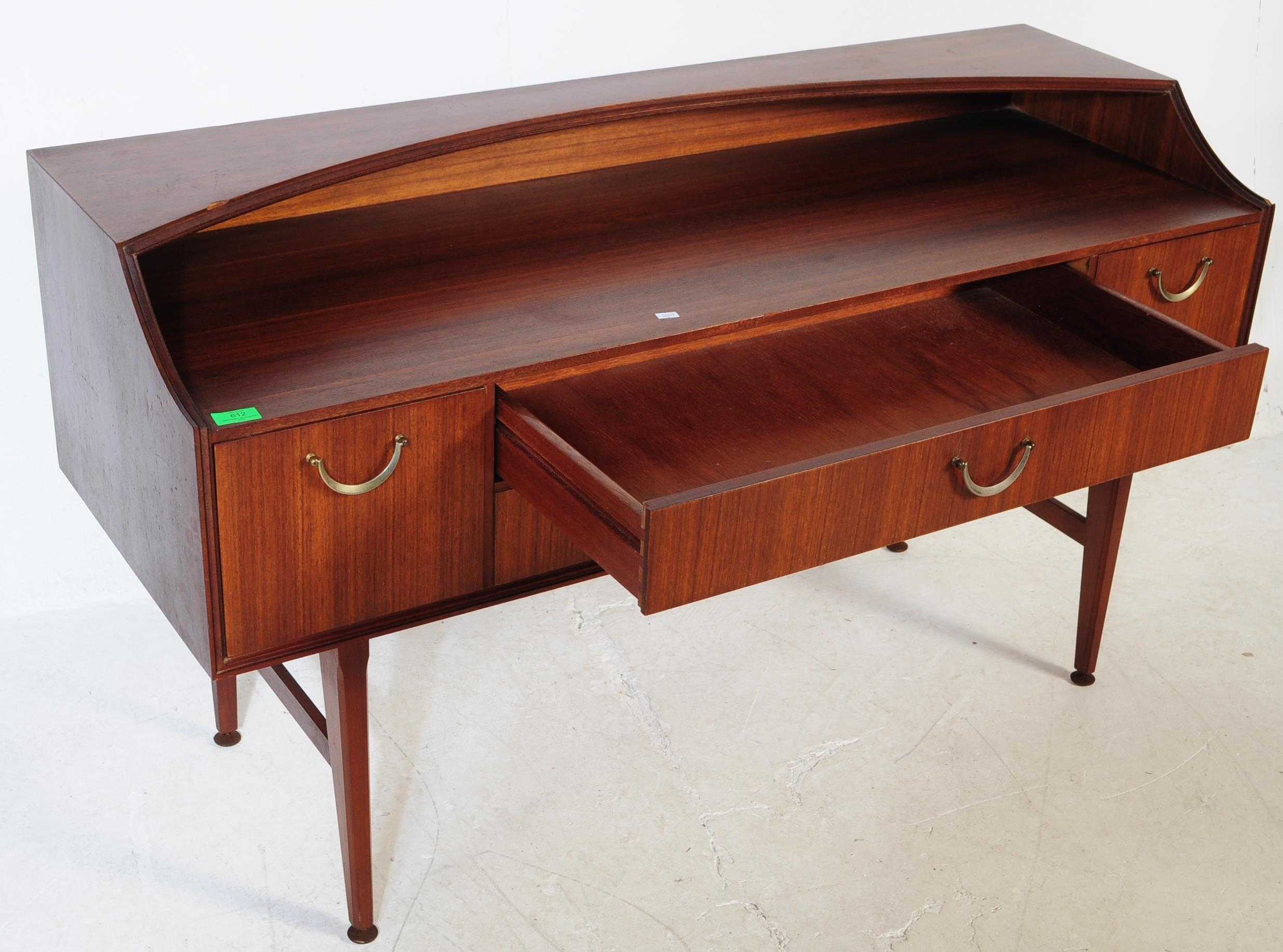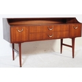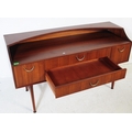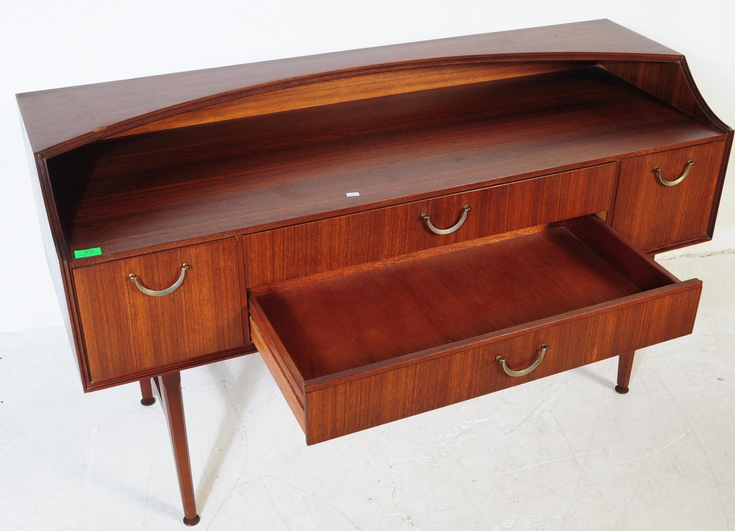Meredew - A retro mid 20th century circa 1970s afromosia teak sideboard. The credenza having shelved top over a central bank of twin drawers flanked by cupboards to either side, each with half hoop metal handles, raised over tapering supports united by stretchers. Measures approx: 73x130x54cm