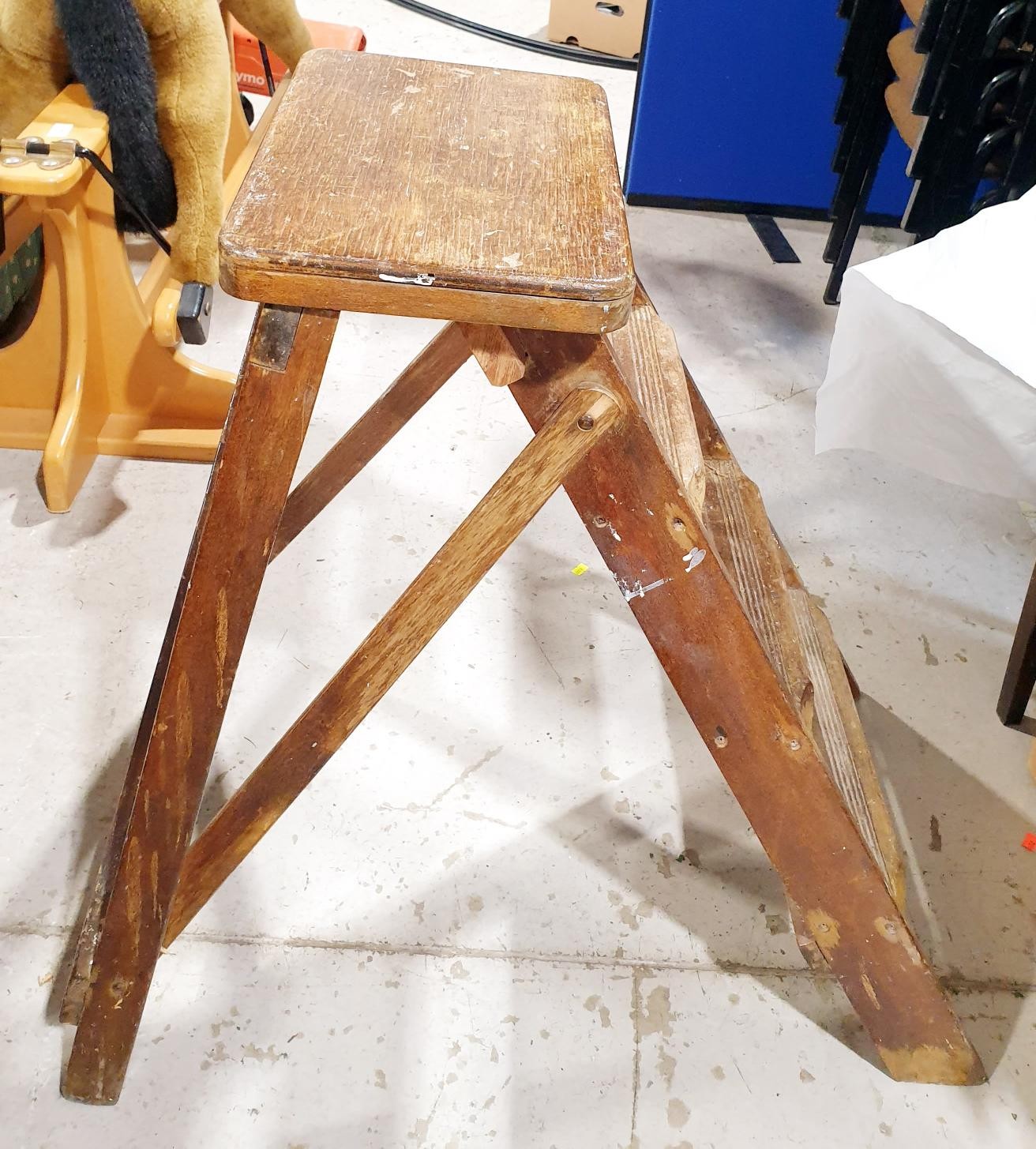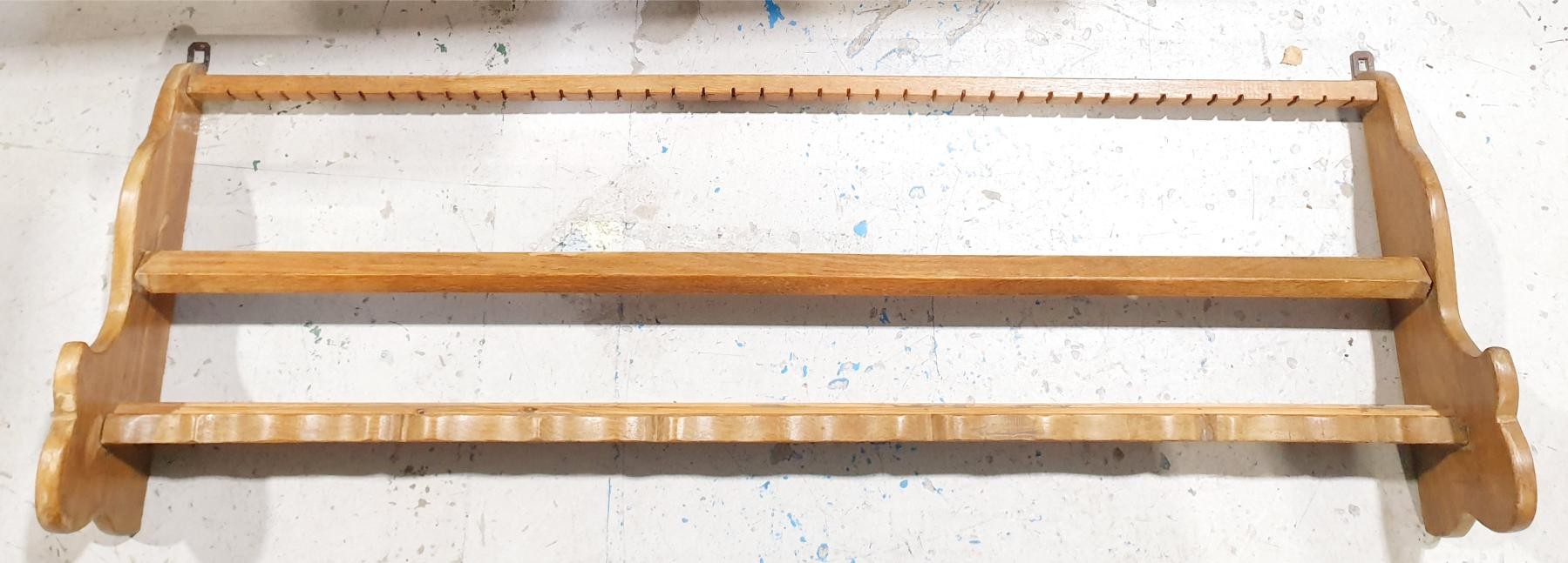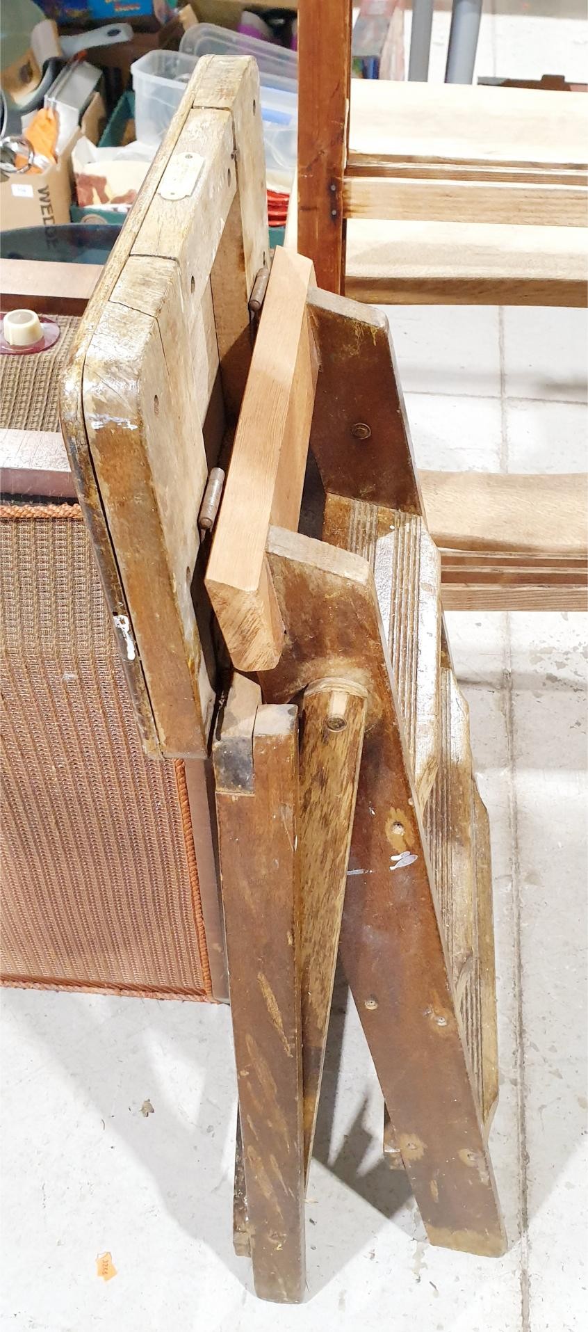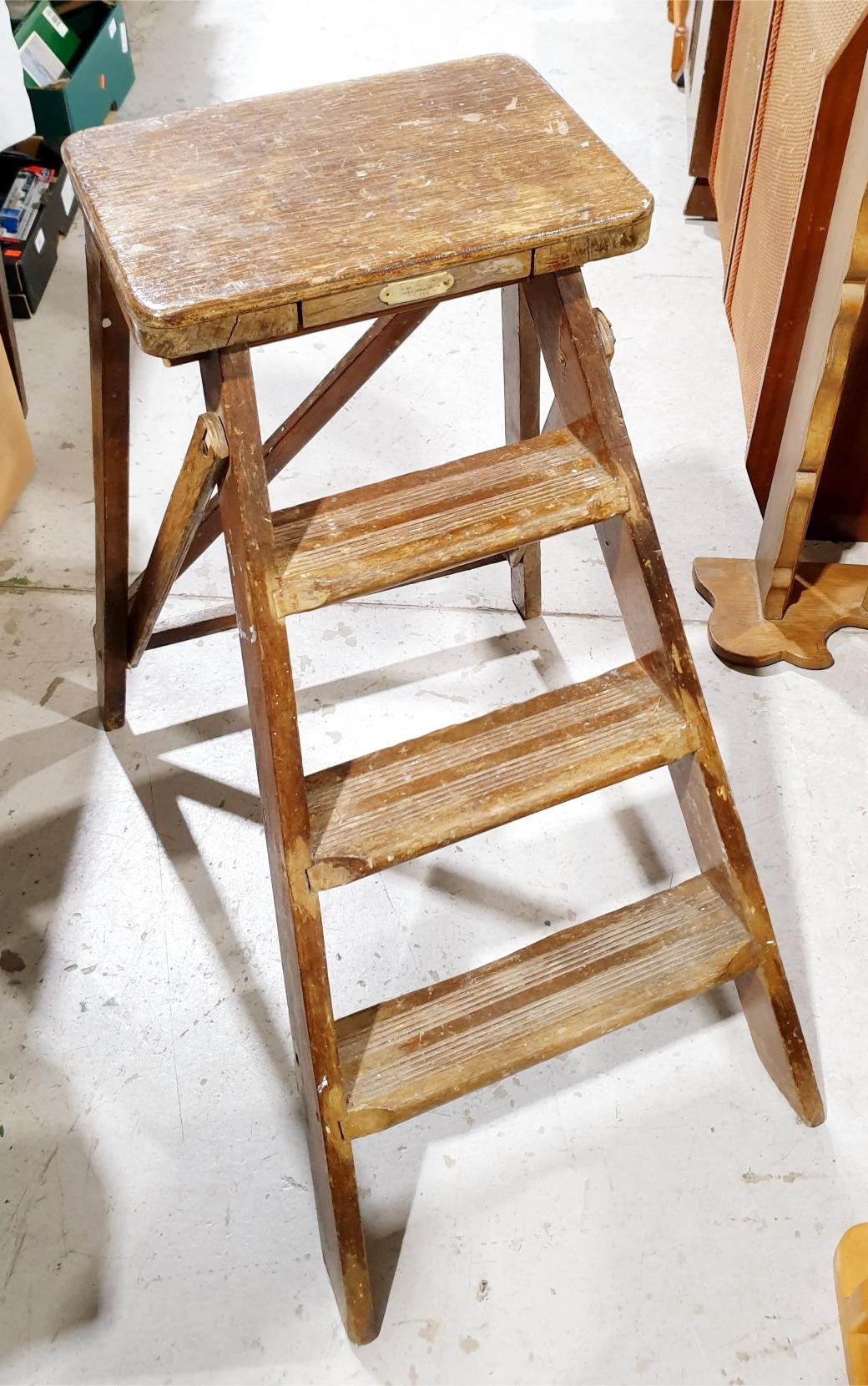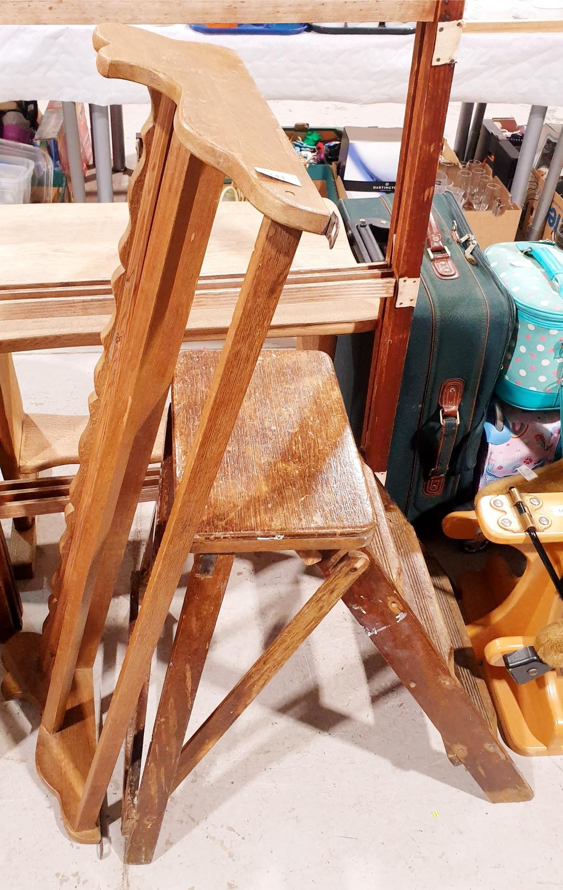 A vintage set of oak folding steps, height 71cm together with a wall hanging plate rack, width 116cm. No shipping. Arrange collection or your own packer and shipper, please. Electricals are sold as scrap.