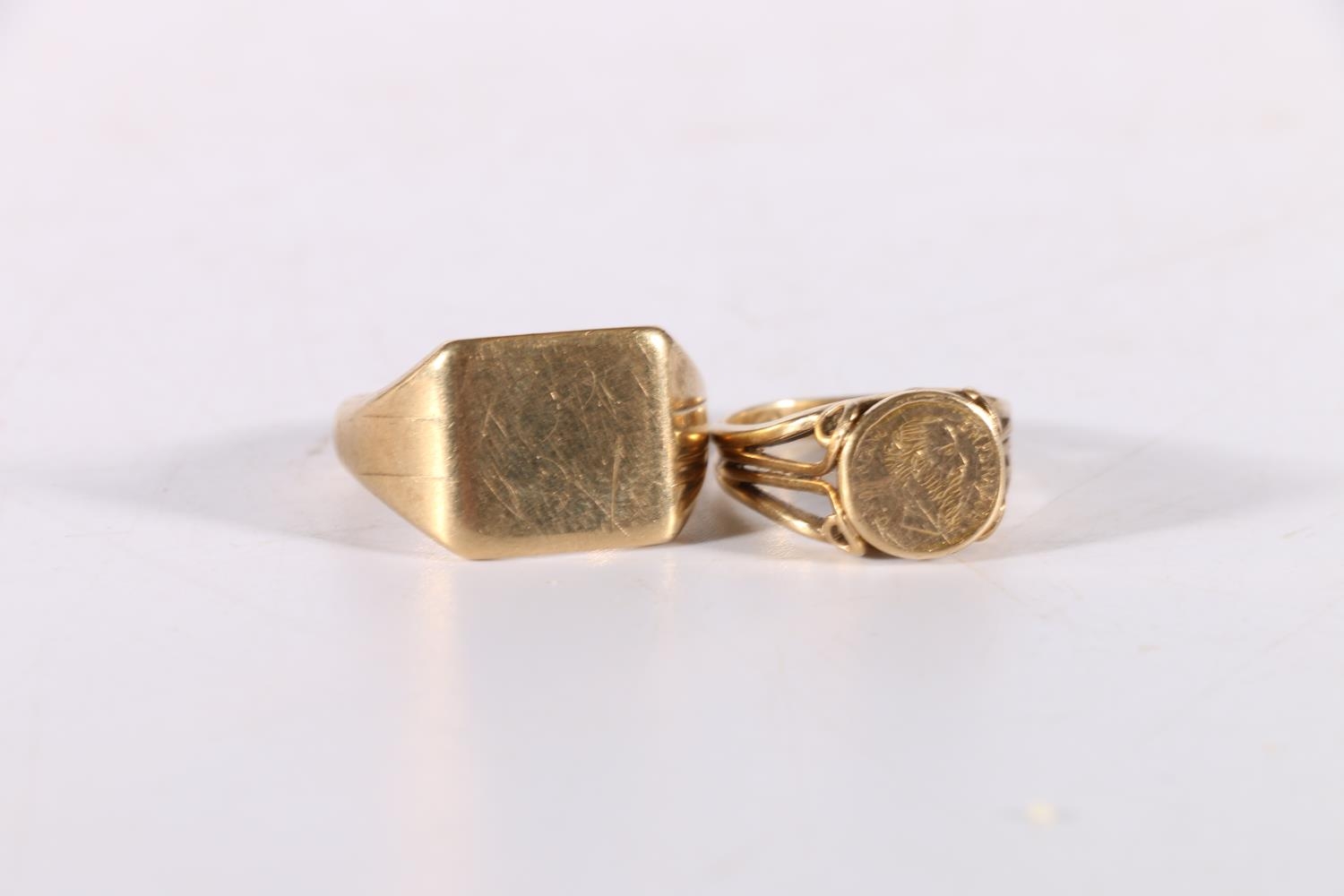 Gents 9ct yellow gold signet ring, ring size X 7.5g and a 9ct gold ring with French coin inset, ring size M 3.8g, (3)