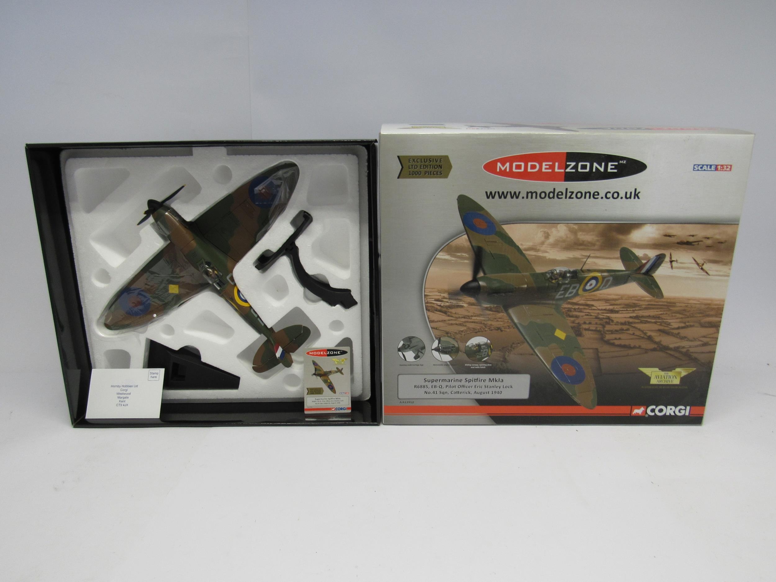 A boxed limited edition Corgi Aviation Archive 1:32 scale diecast AA33910 Supermarine Spitfire Mk1a R6885, EB-Q, Pilot Officer Eric Stanley Lock No. 41 Sqn, Catterick, August 1940