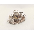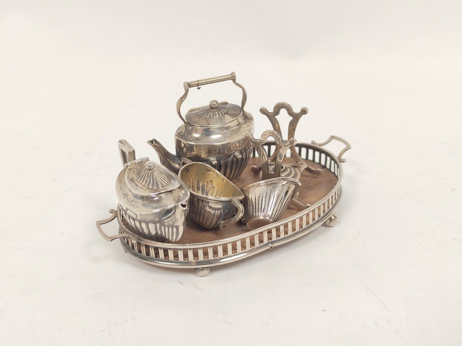 Edwardian miniature four piece silver teaset, oval part fluted including a kettle on stand with tiny lamp on 10cm tray by Levi and Salaman Birmingham 1906. 8.1 grms