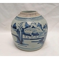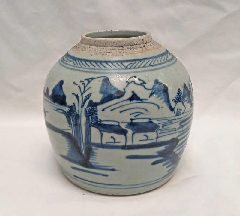 19TH CENTURY CHINESE BLUE & WHITE JAR WITH RURAL SCENE DECORATION - 16 CM TALL