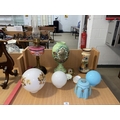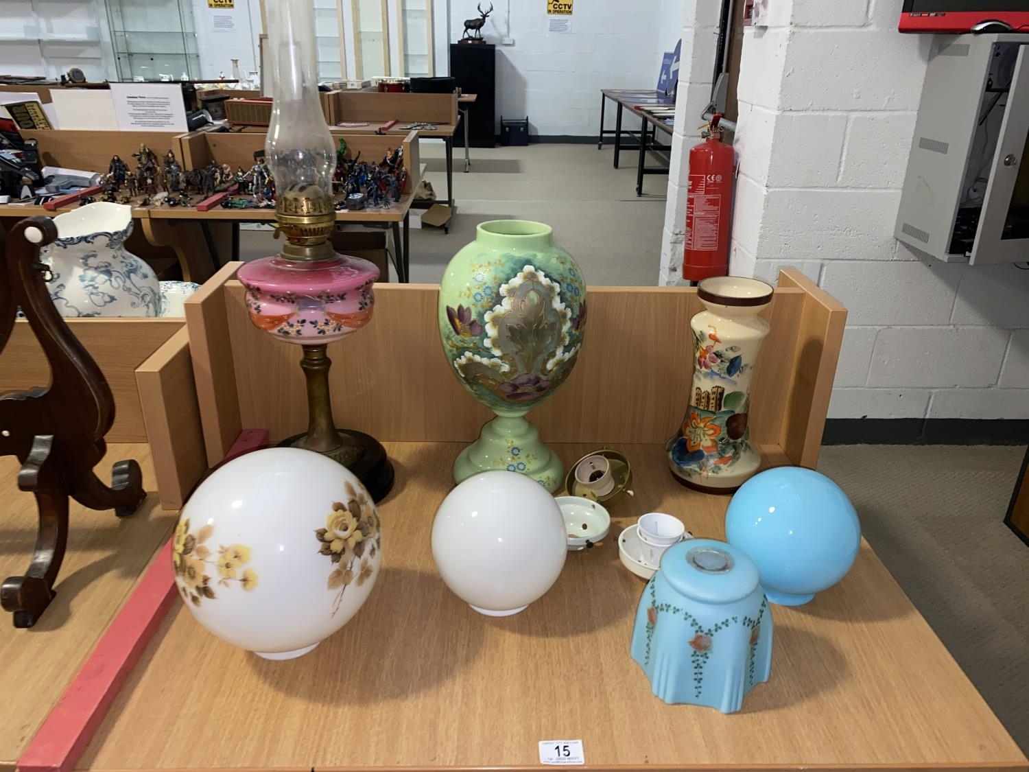 Painted glass, vases, glass lightshades, oil lamp etc.