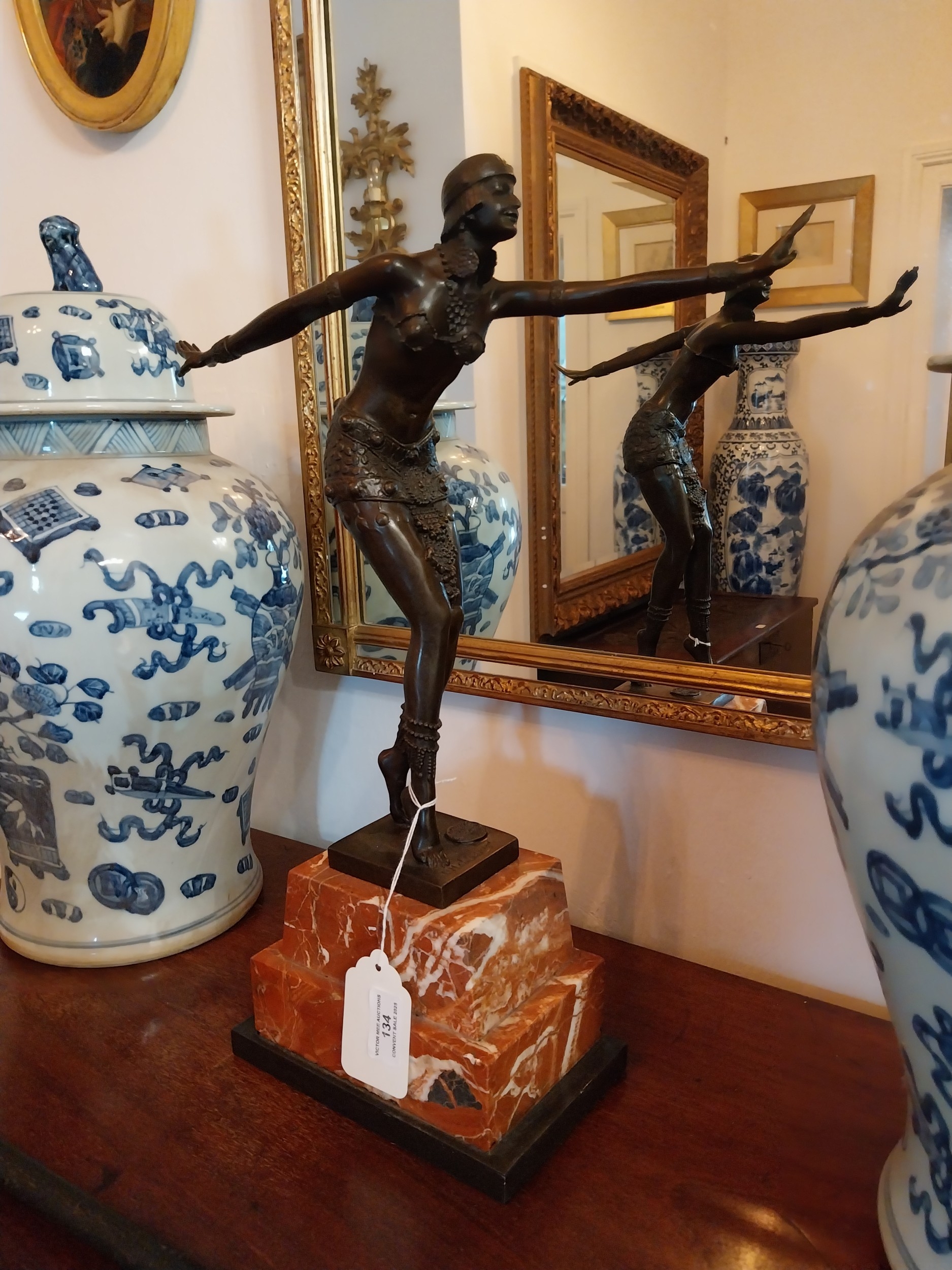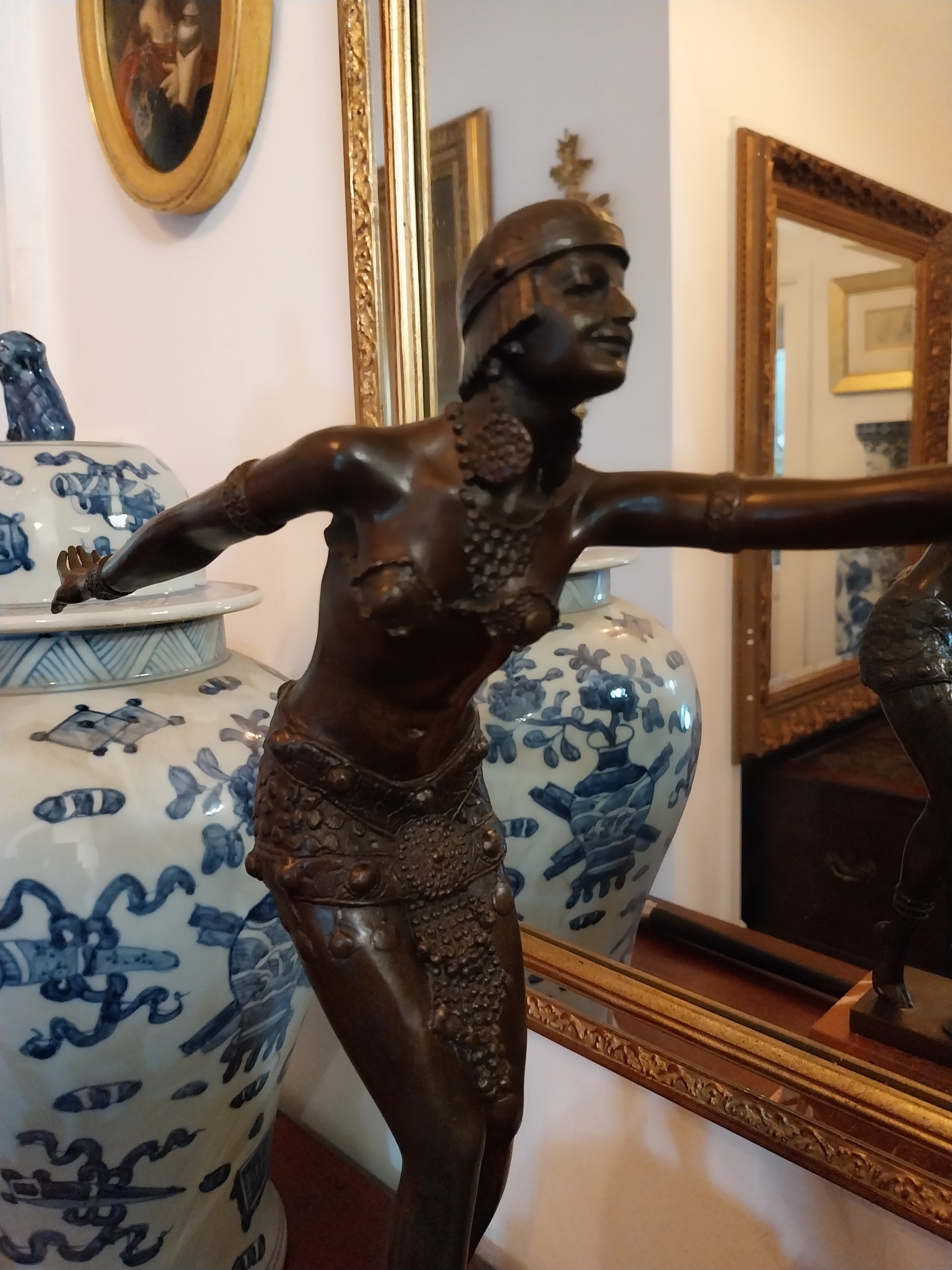 Bronze figure of a Dancer, mounted on a marble base, in the Art Deco style. { 50cm H X 35cm W X 12cm D }.