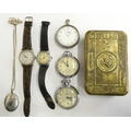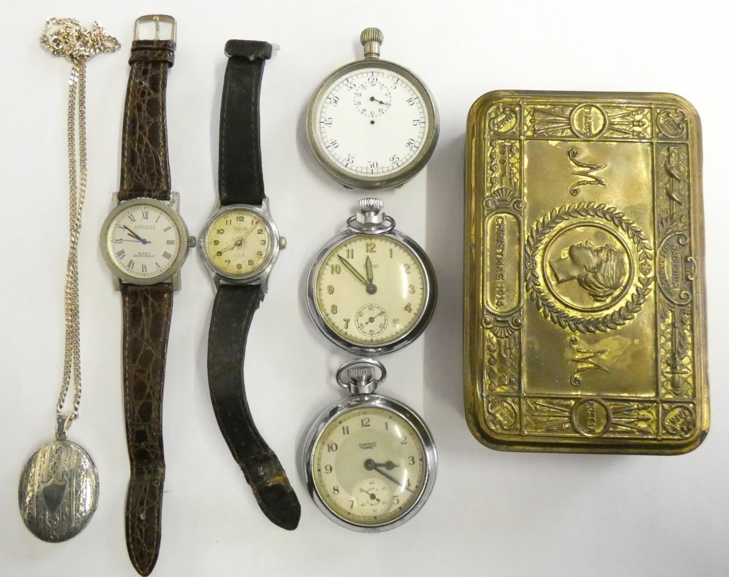 A stop watch in a metal case, two other pocket watches, two wristwatches and a Christmas 1914 tin