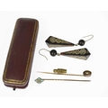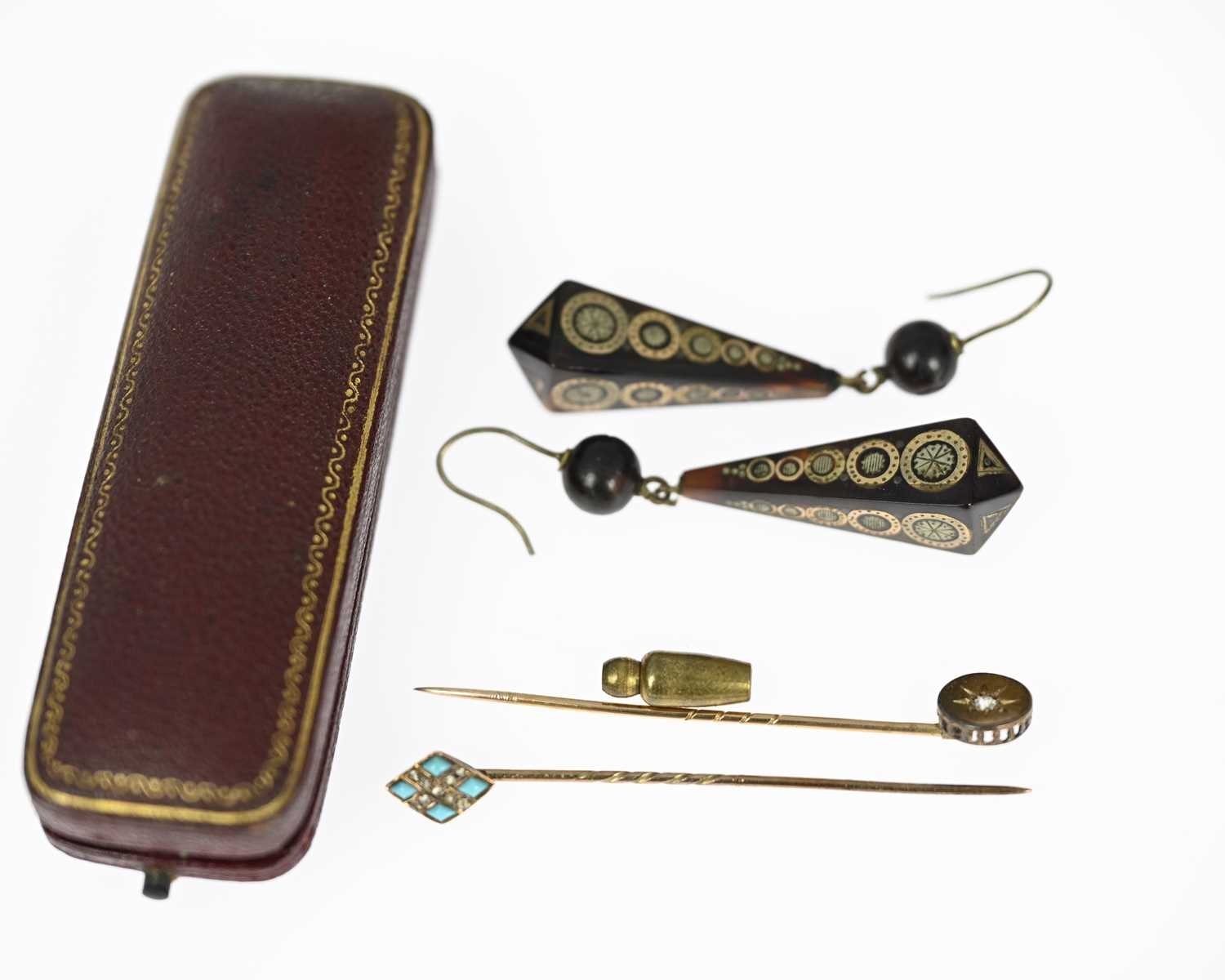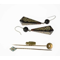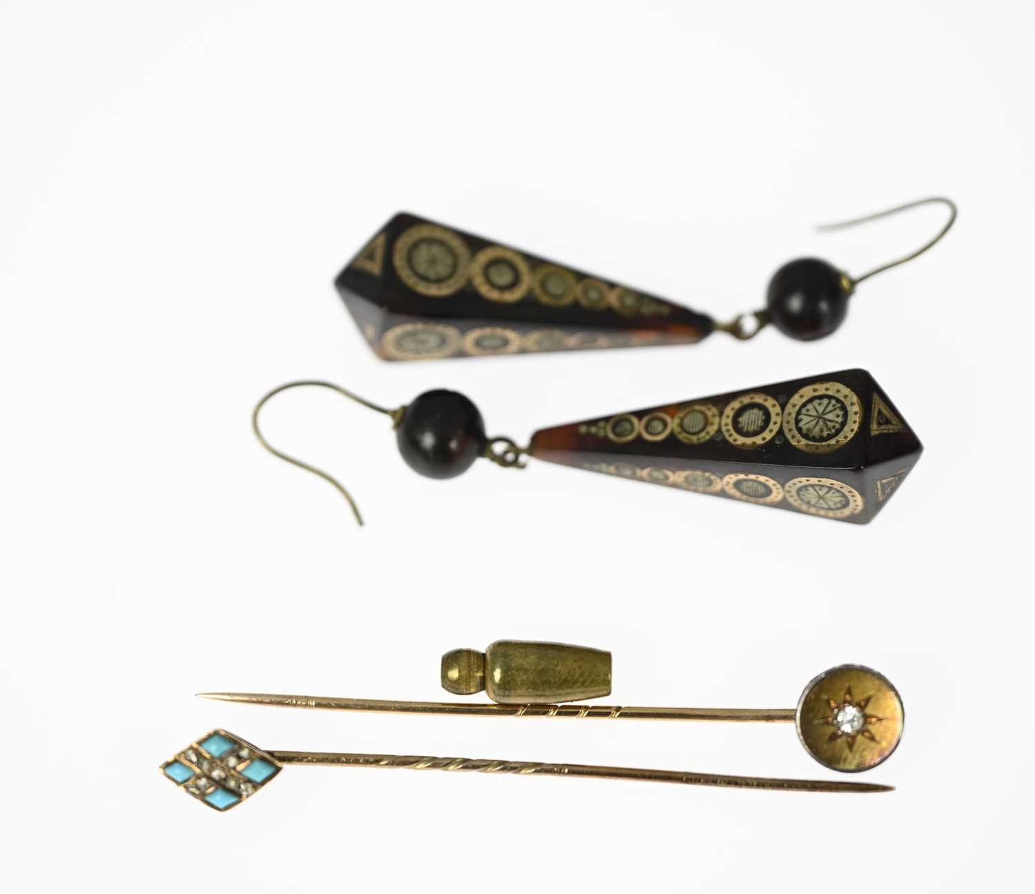 Two diamond and gem-set stickpins and a pair of tortoiseshell drop earrings