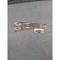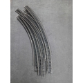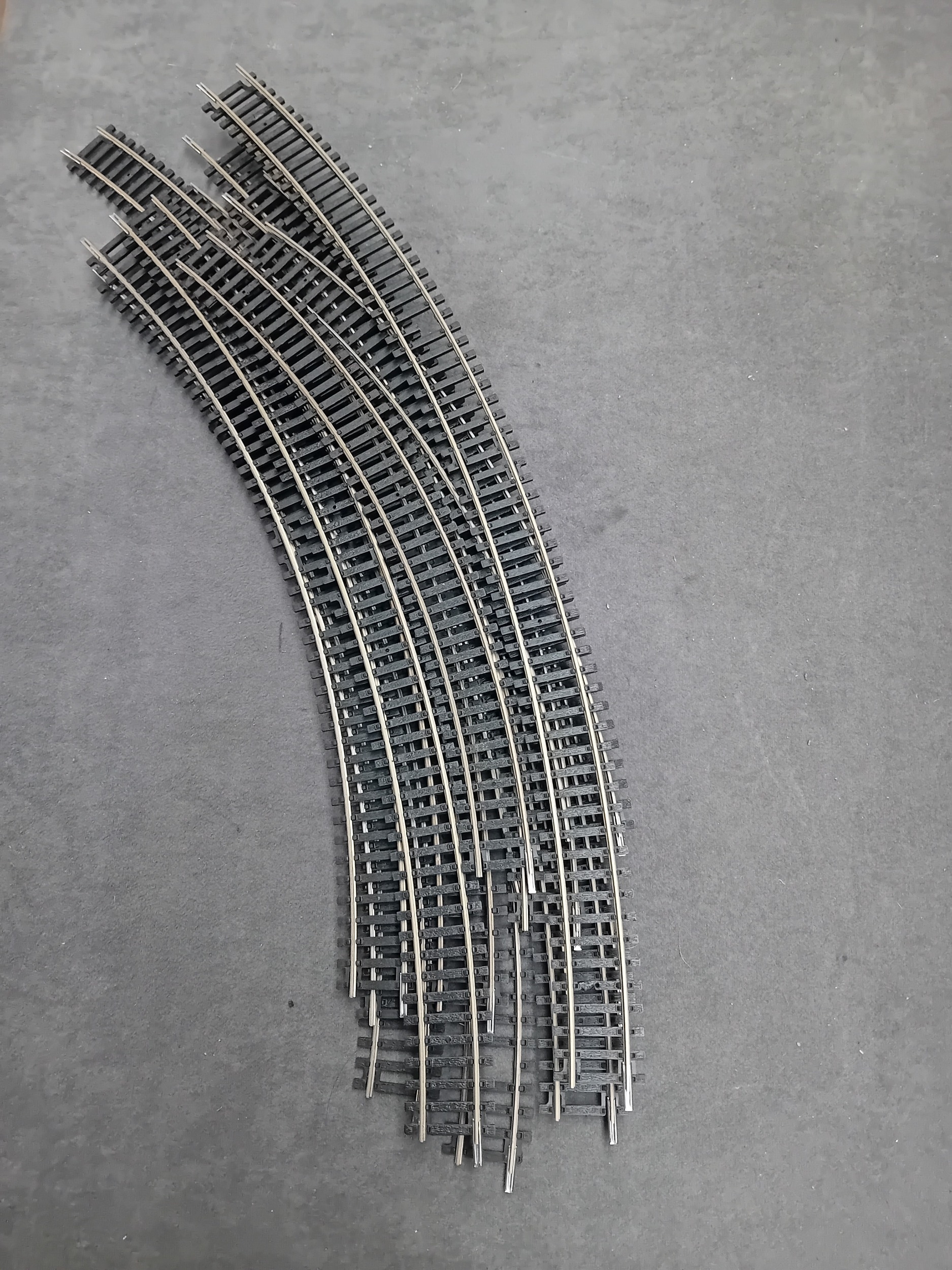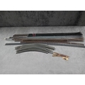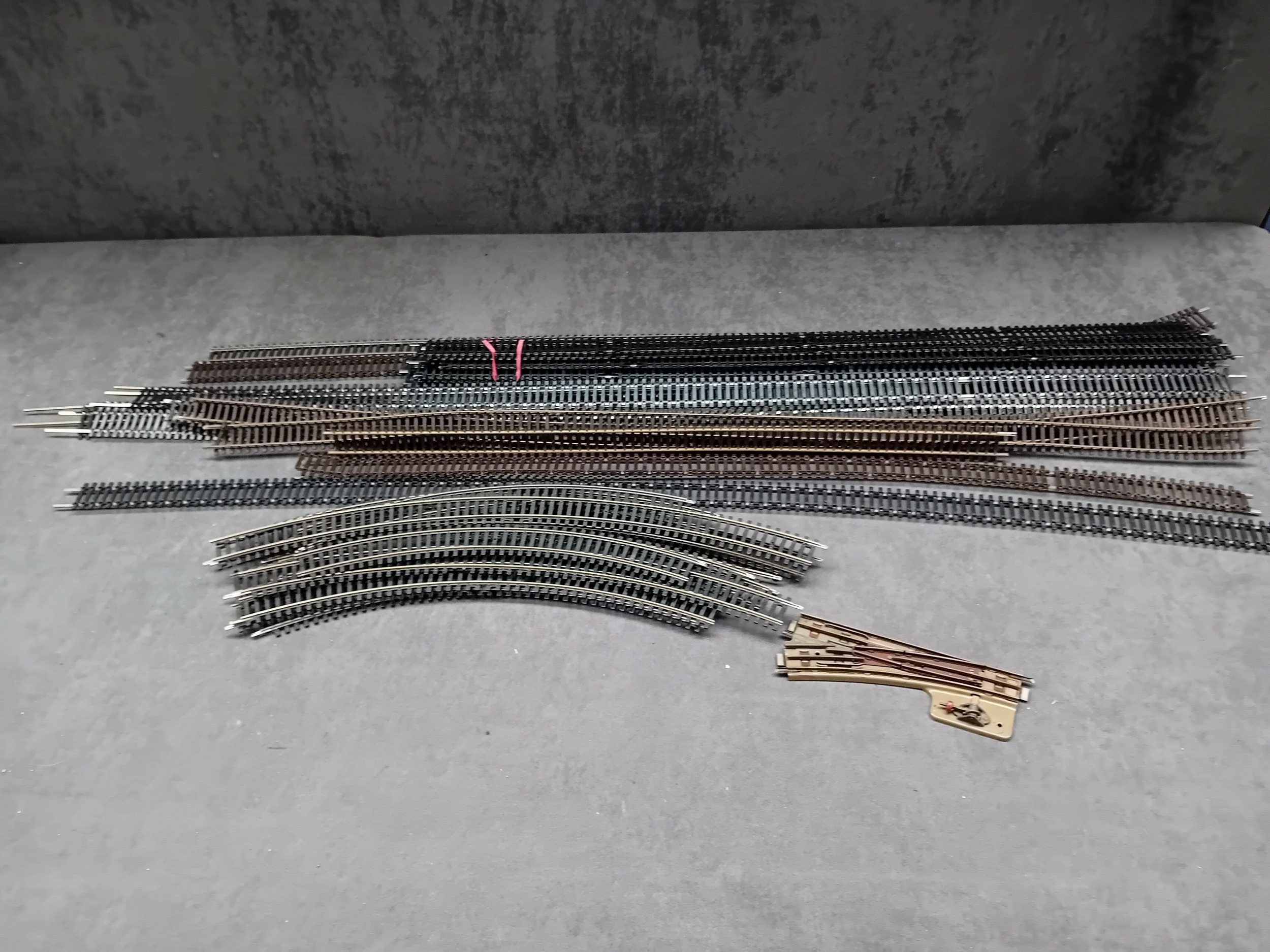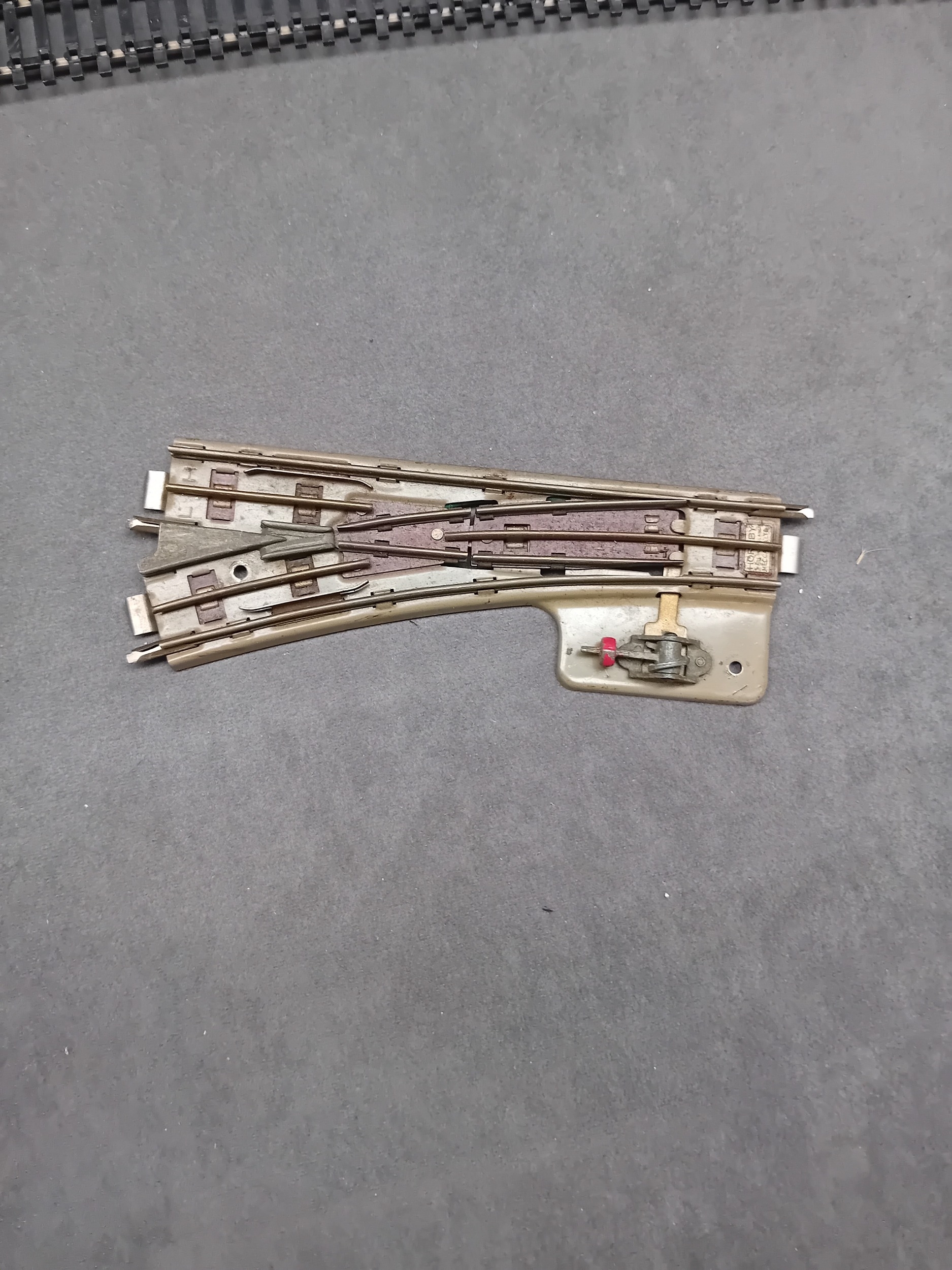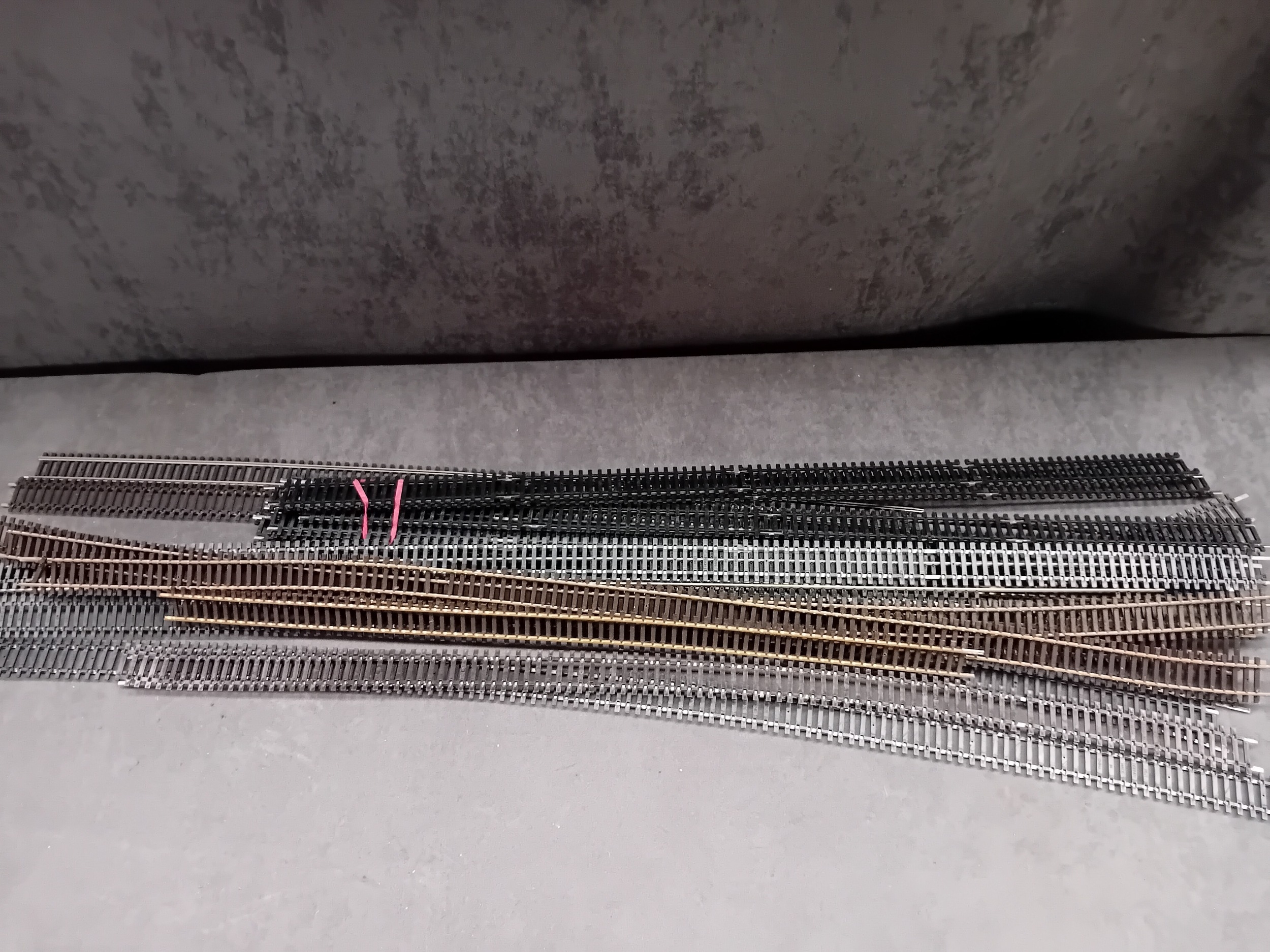 A collection of Hornby and Peco HO/OO gauge model railway track sections, comprising various straight and curved sections. The track sections are constructed with metal rails mounted on plastic ties, presenting in both dark grey/black and brown variations, consistent with Hornby R600 straight track and Peco ST-226 / Hornby R607 2nd radius curved track. Also included is a single Marklin right-hand turnout switch, featuring a plastic base, metal rails, and an integrated manual lever mechanism with a red control knob.