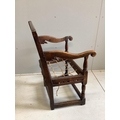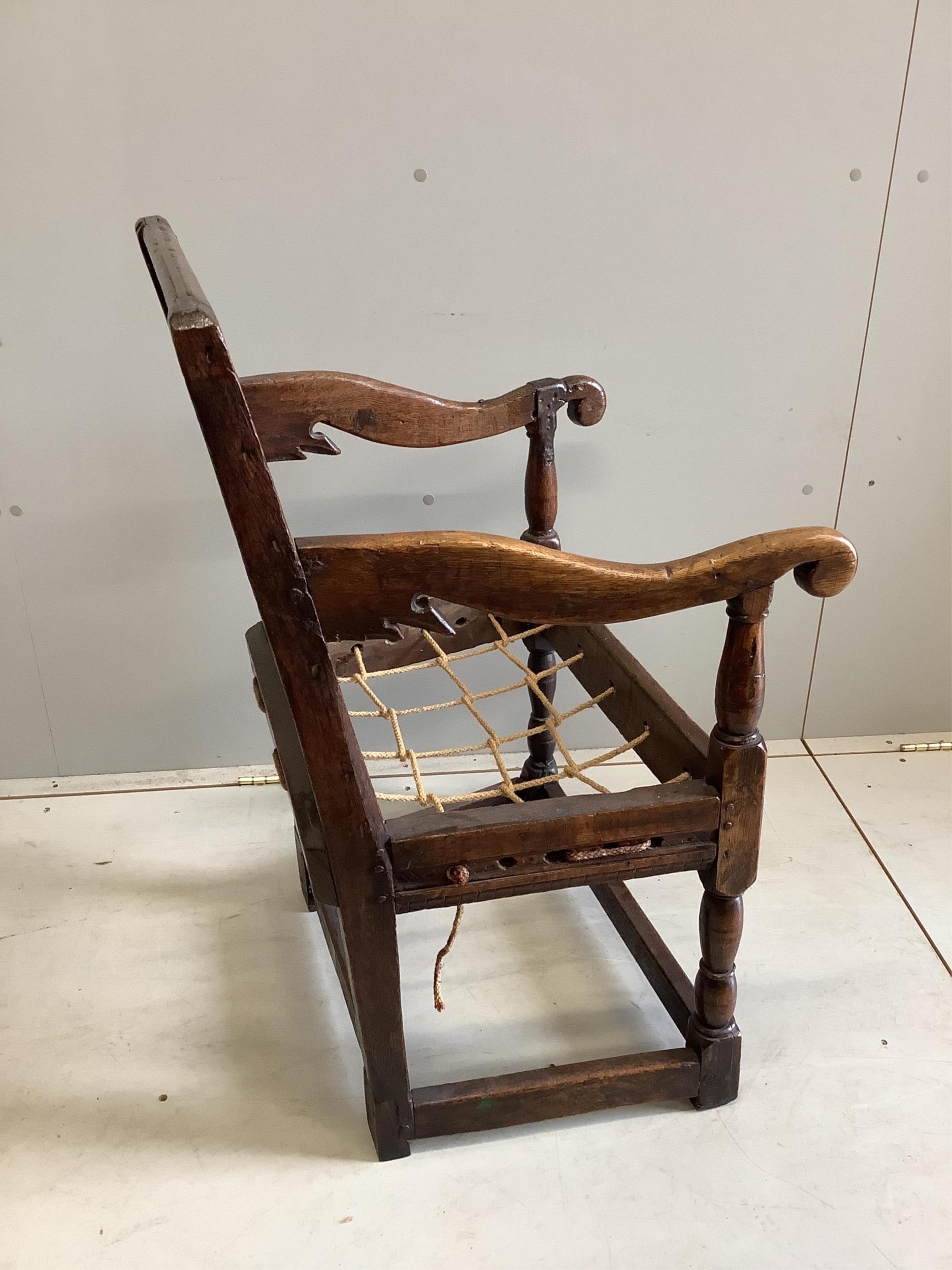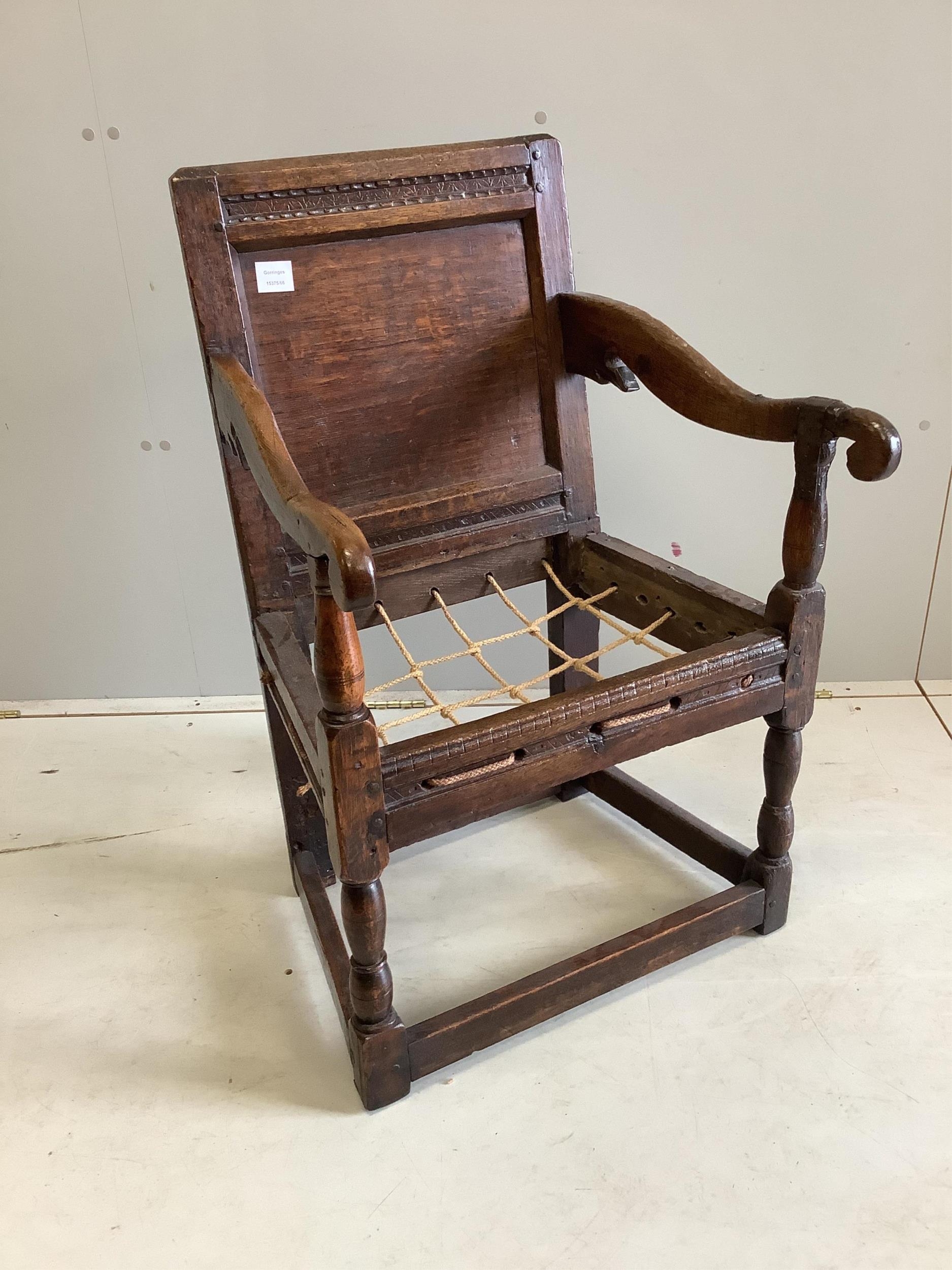 A 17th century oak wainscot elbow chair, width 56cm, depth 52cm, height 89cm. Condition - poor-fair