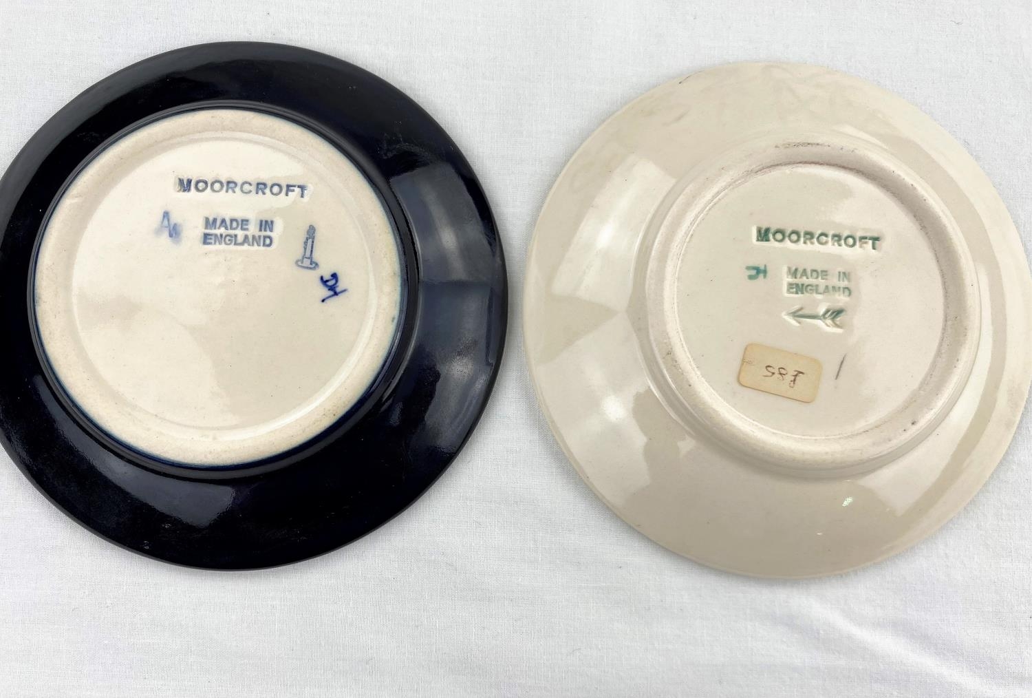 2 Moorcroft pin dishes one decorated with robin on holly twig, the other with a bird, leaves & plums (seconds line in silver) impressed & monogrammed diameter 11.5cm