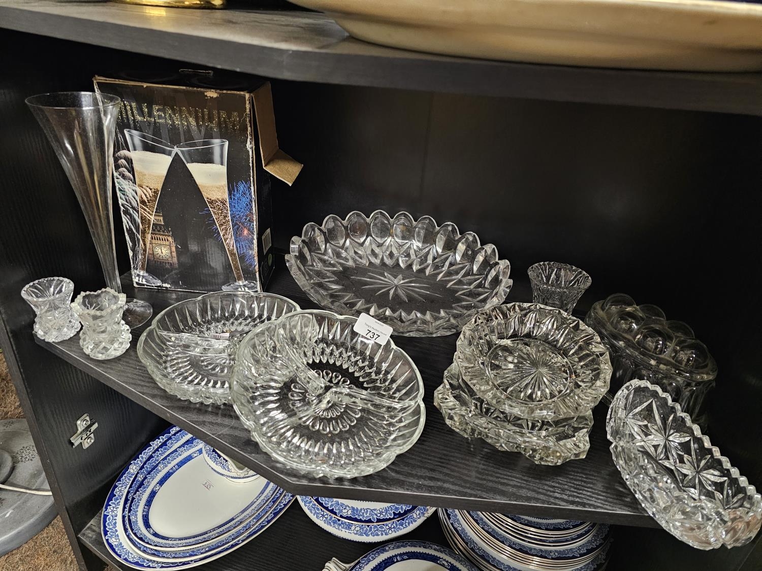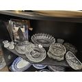 lot of mostly crystal cut glassware. Specifically, a Waterford Evie Lead Crystal Footed Bowl and various bowls, dishes, ashtrays, all made of cut glass or crystal.