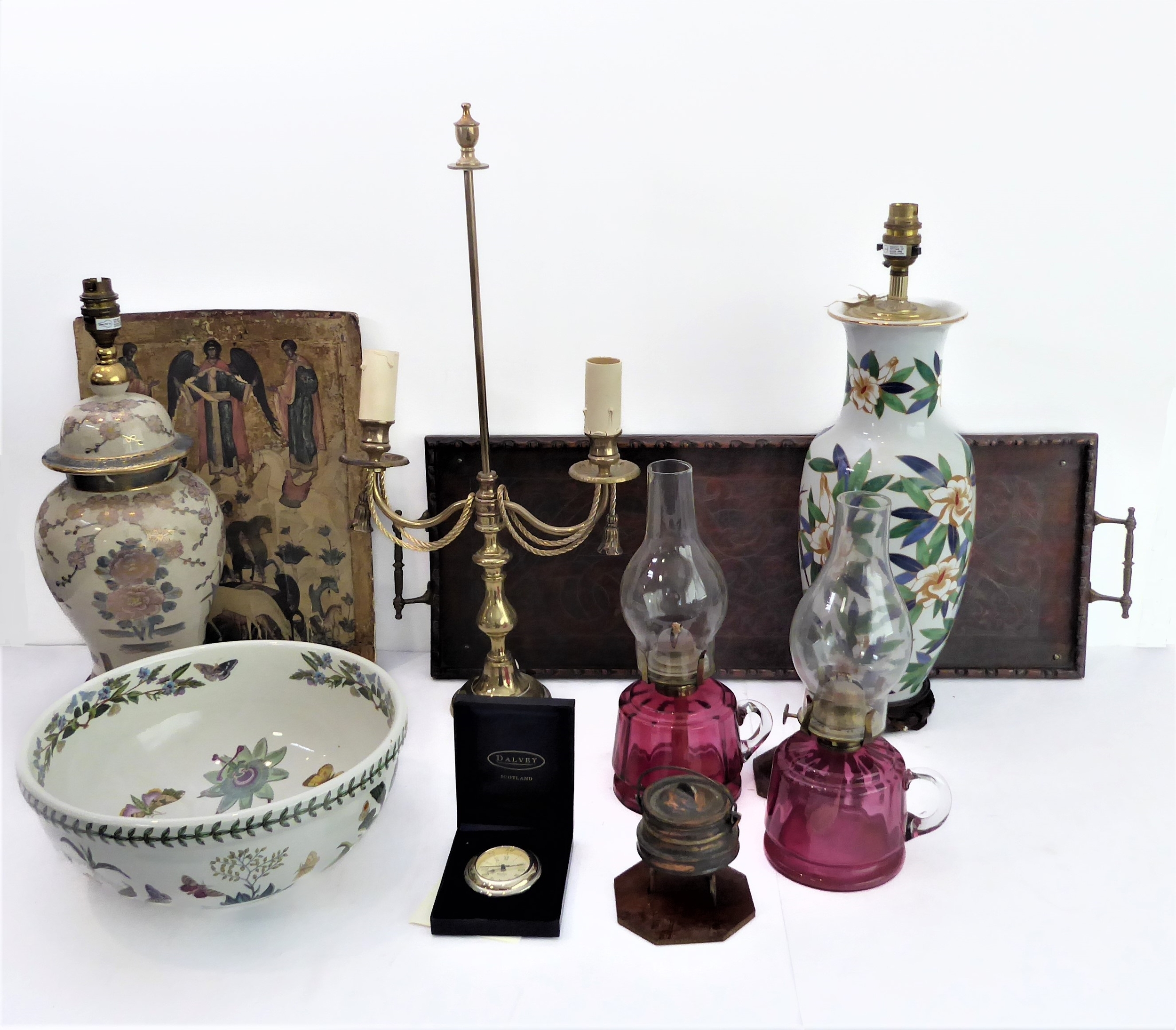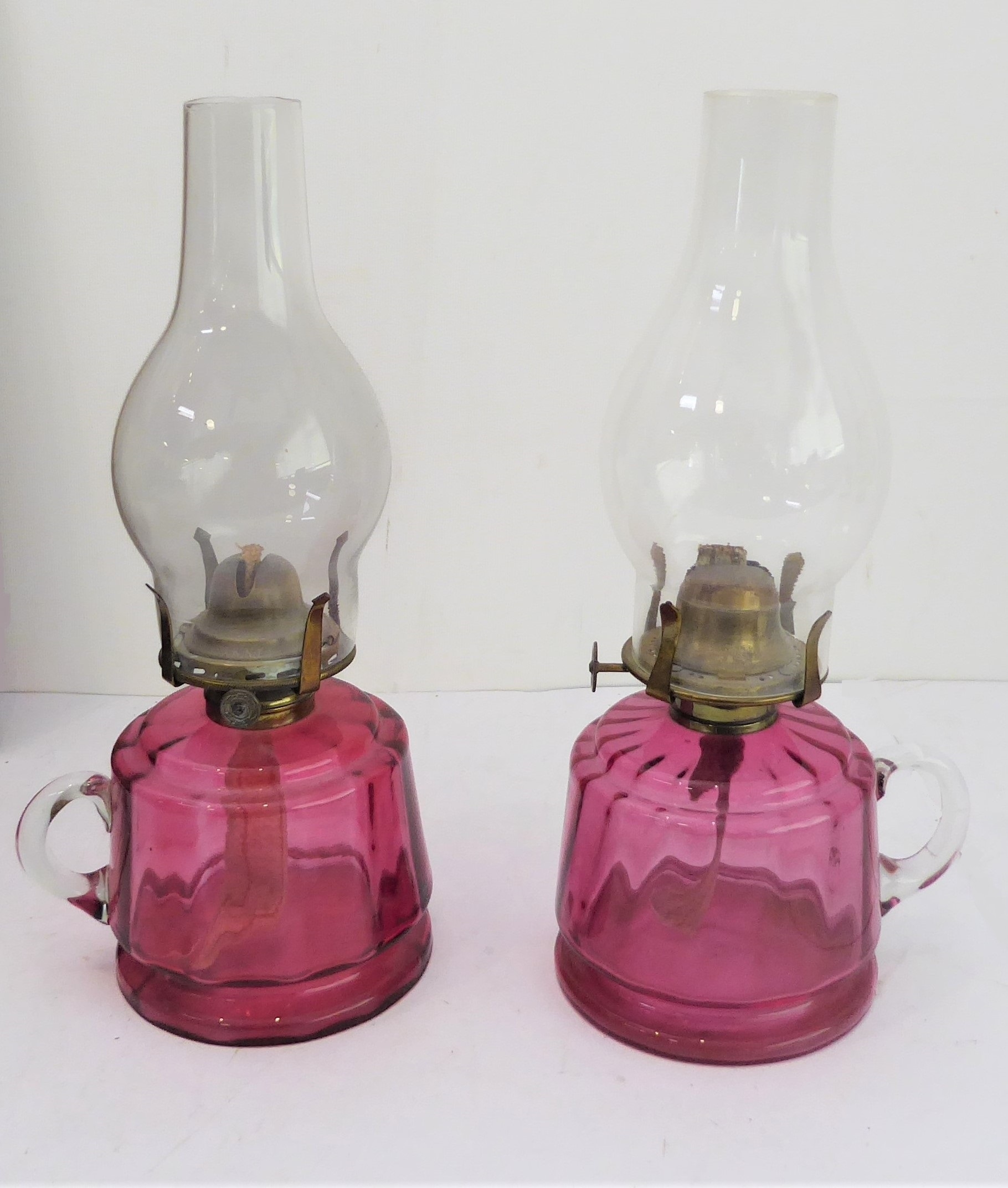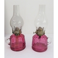 a pair of cranberry glass oil lamps;