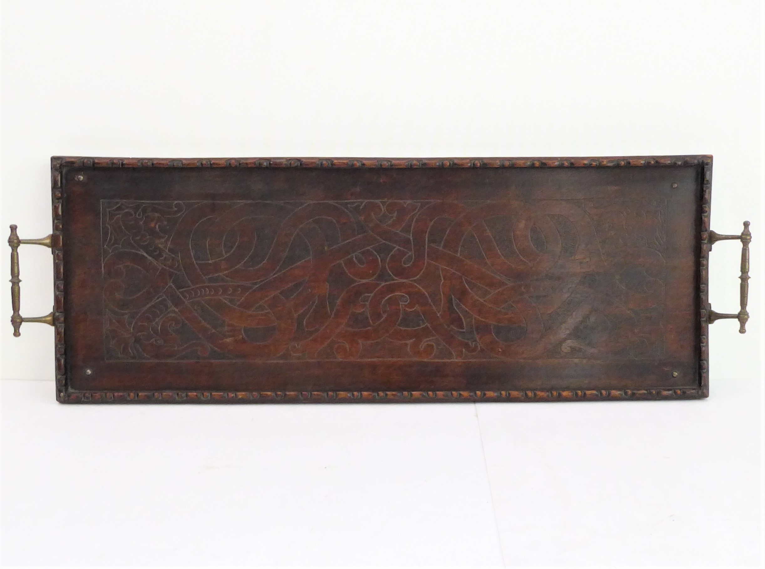 an early 20th century two-handled oak serving tray incised with a Celtic design;