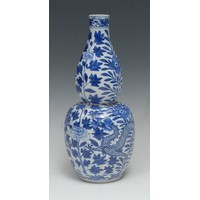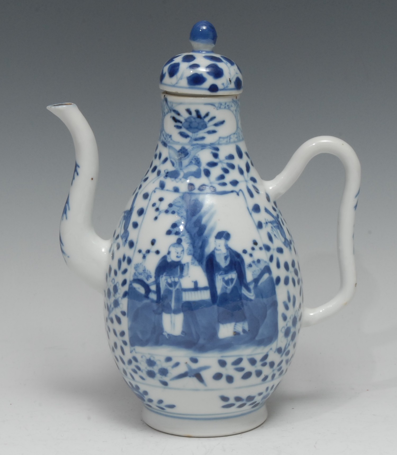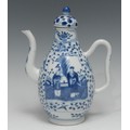A Chinese pear shaped wine pot painted in tones of underglaze blue with an official and attendant, within a reserve on a ground of birds, flowers, insects and leafy sprigs, shaped handle, 23cm high, 18th century