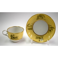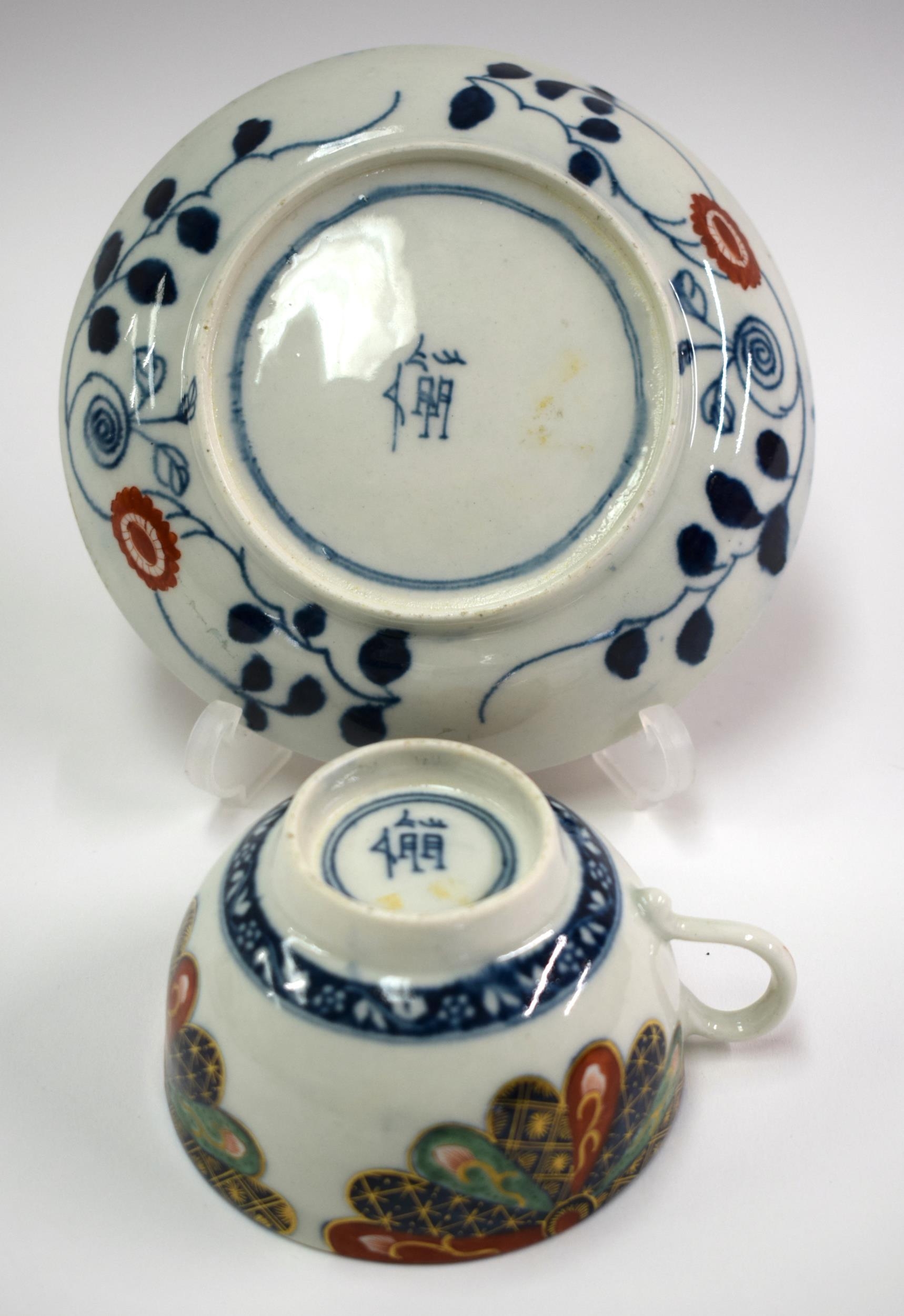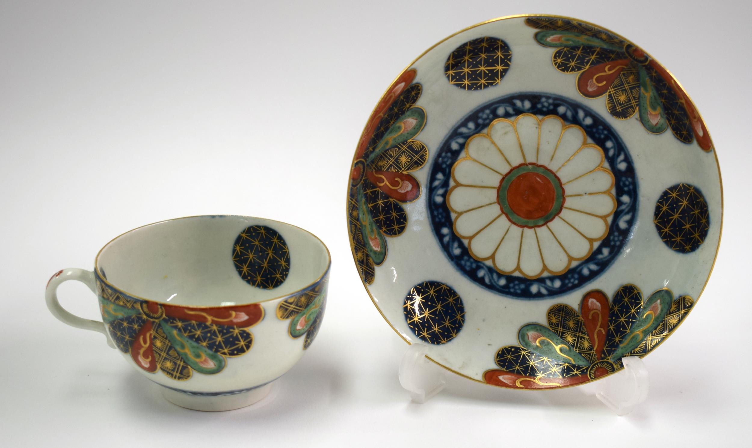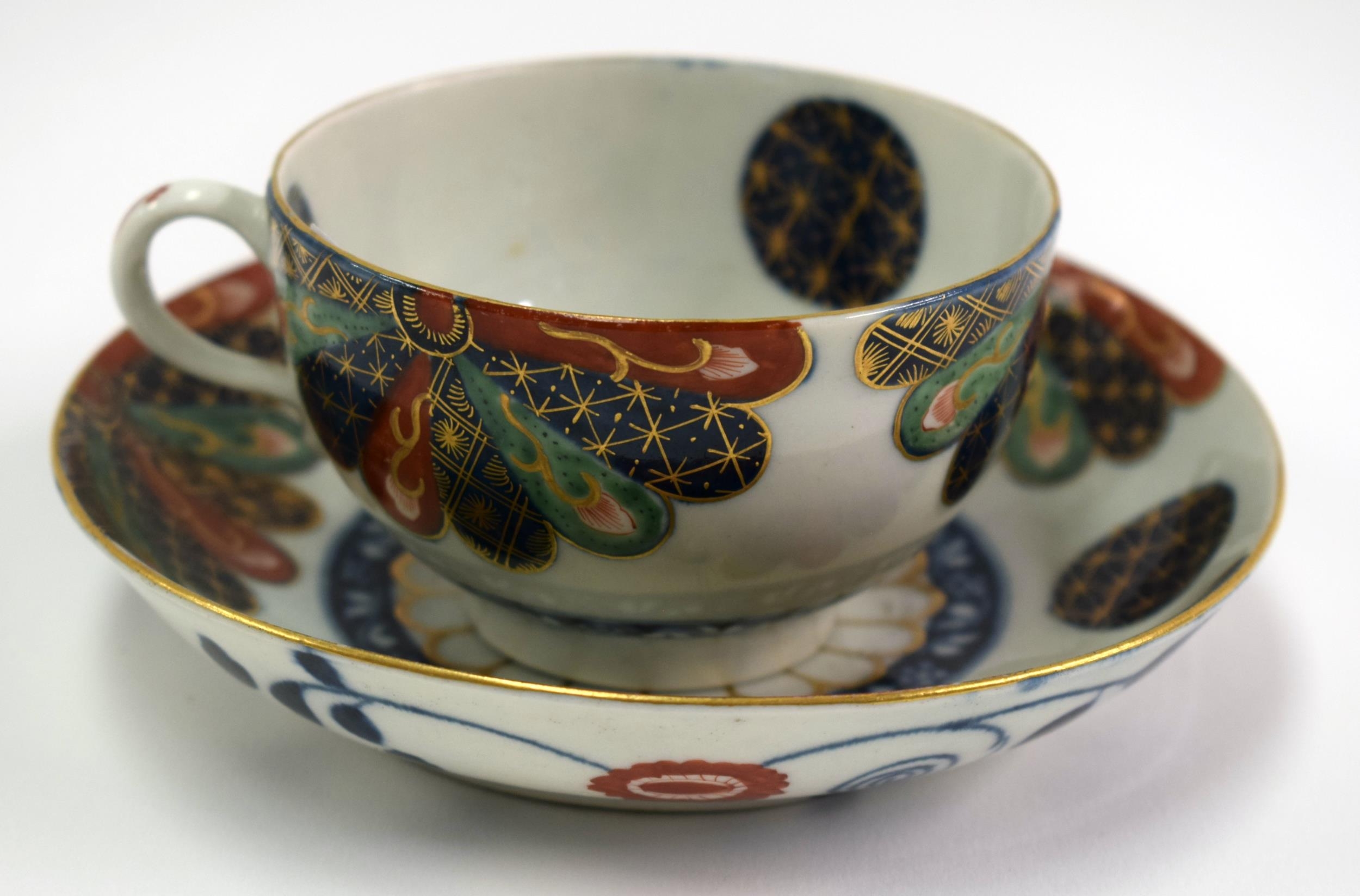 18th century Worcester tea up and saucer painted with Old Japan Fan pattern, Chinese character mark. Saucer 13 cm diameter. Cup 5cm high