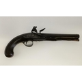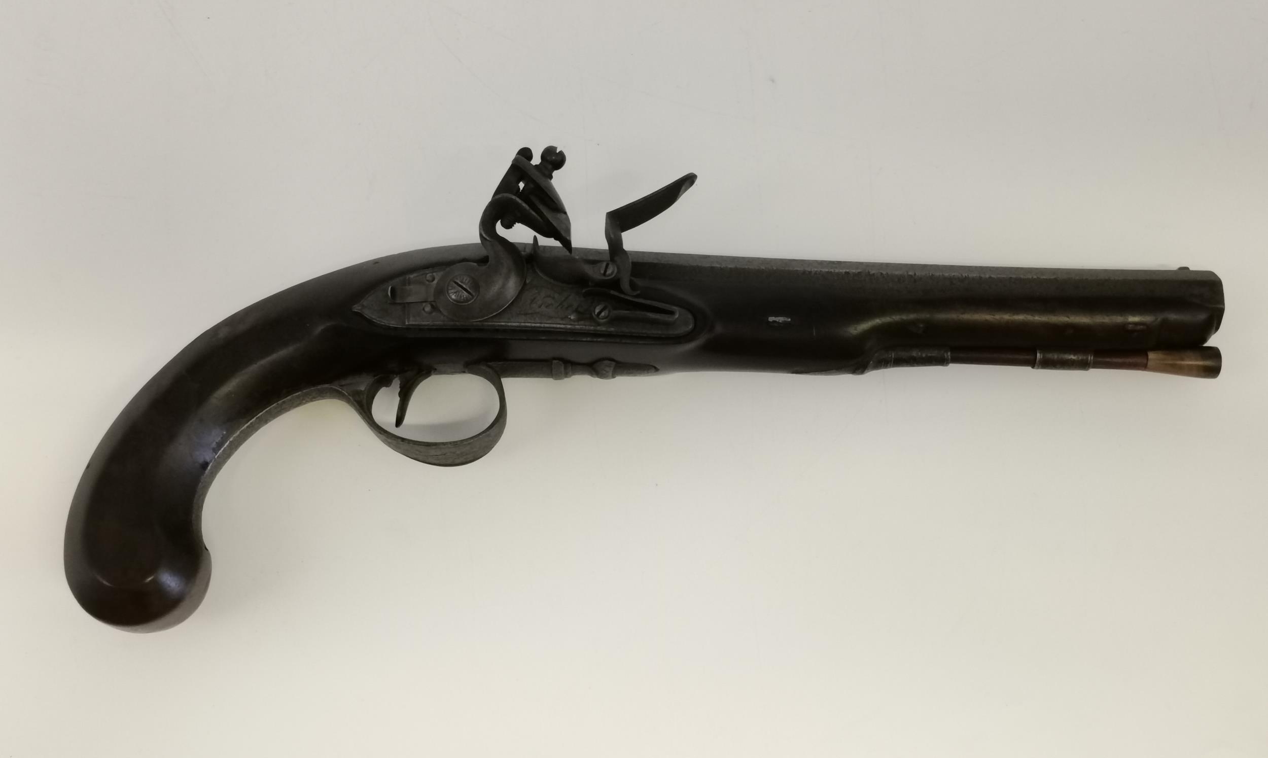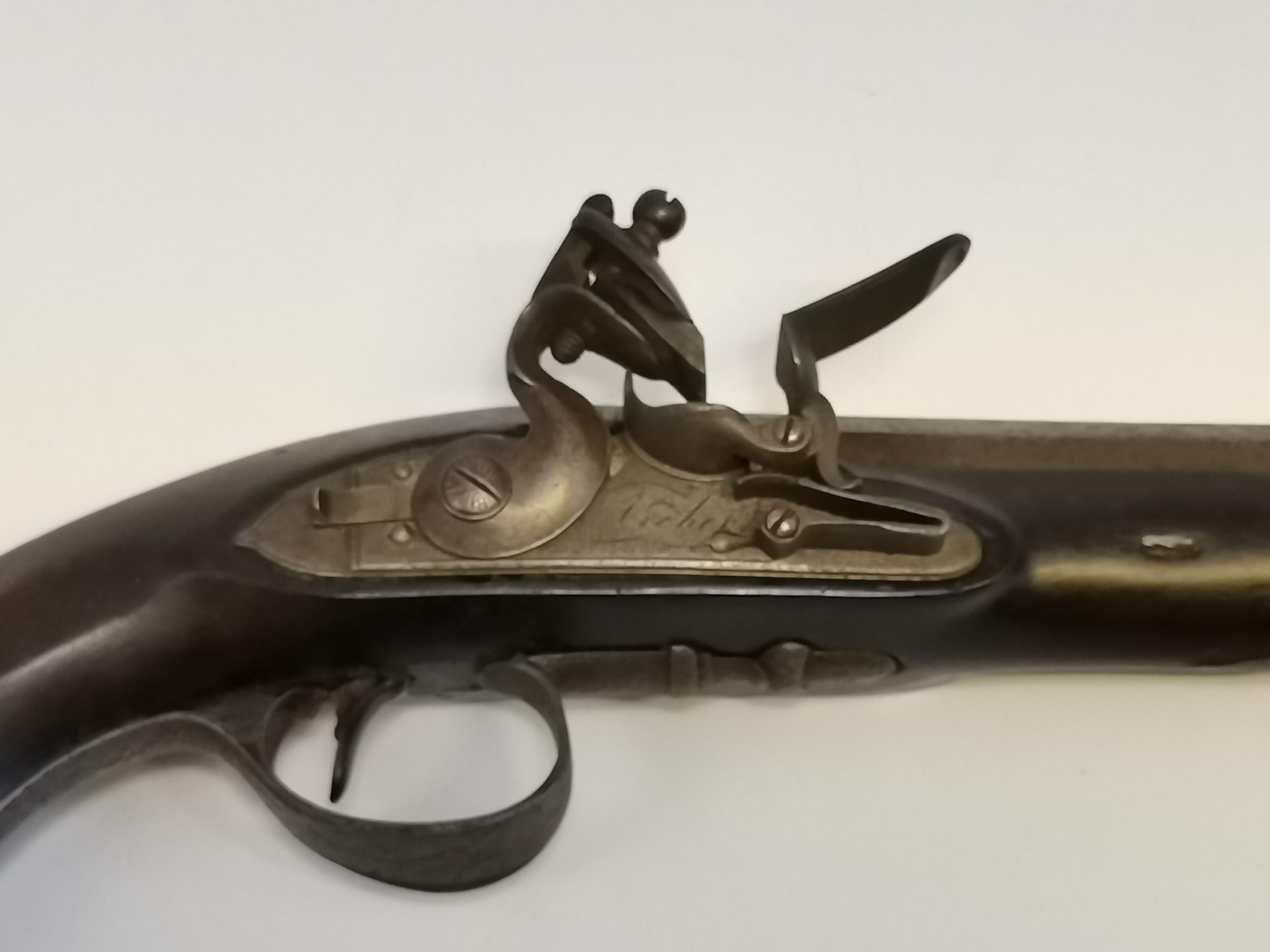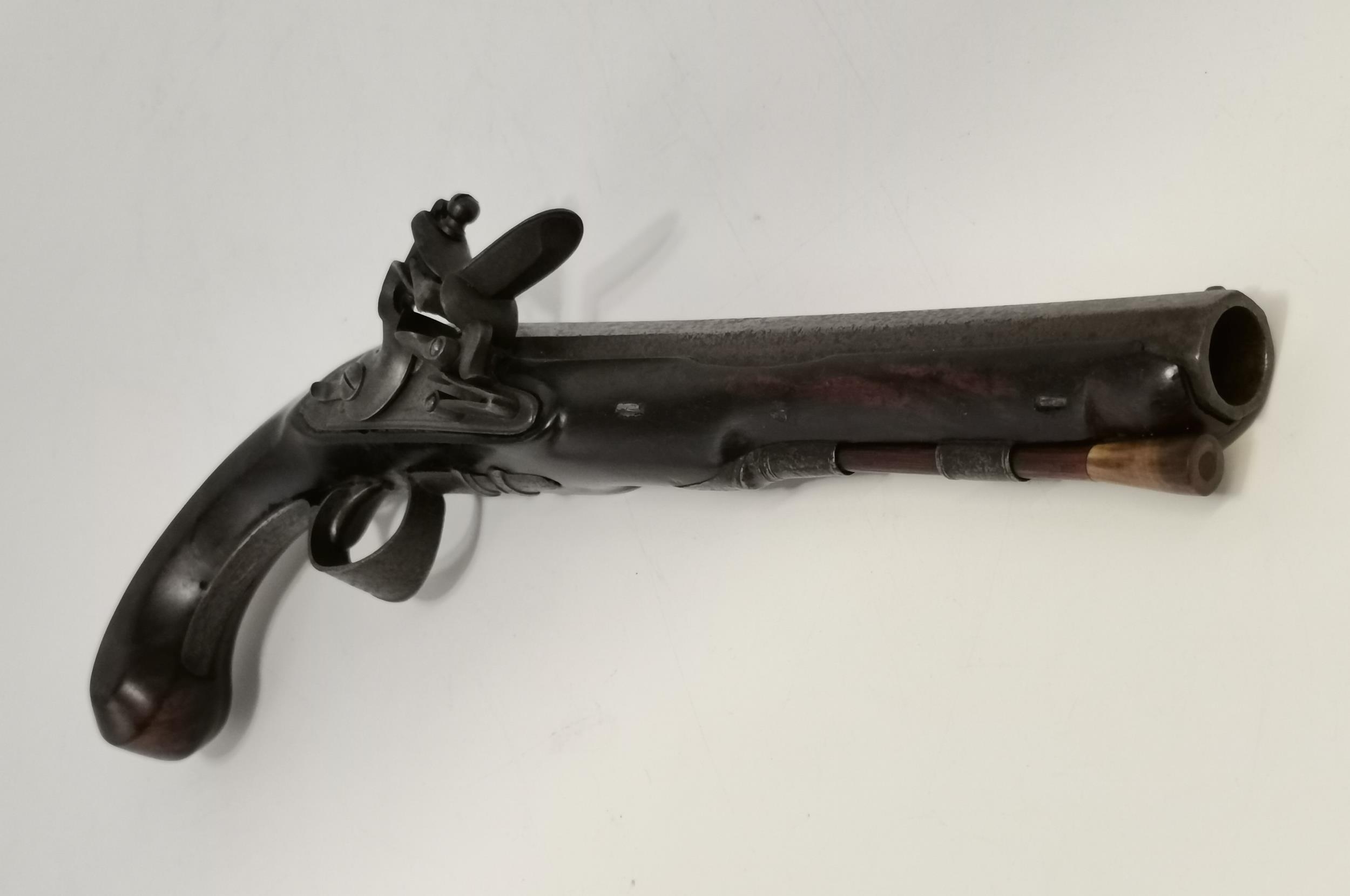 A late 18th Century flintlock pistol by Archer, London, with engraved steel fittings, the trigger guard with acorn finial, the lockplate signed 'Archer' and with slide safety, the 8⅛" (20.5cm) octagonal barrel with stamped proof marks and inscribed 'London' to top, with later replacement horn-tipped wooden ramrod. Approx. 33.5cm long overall