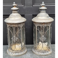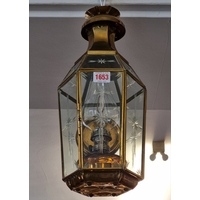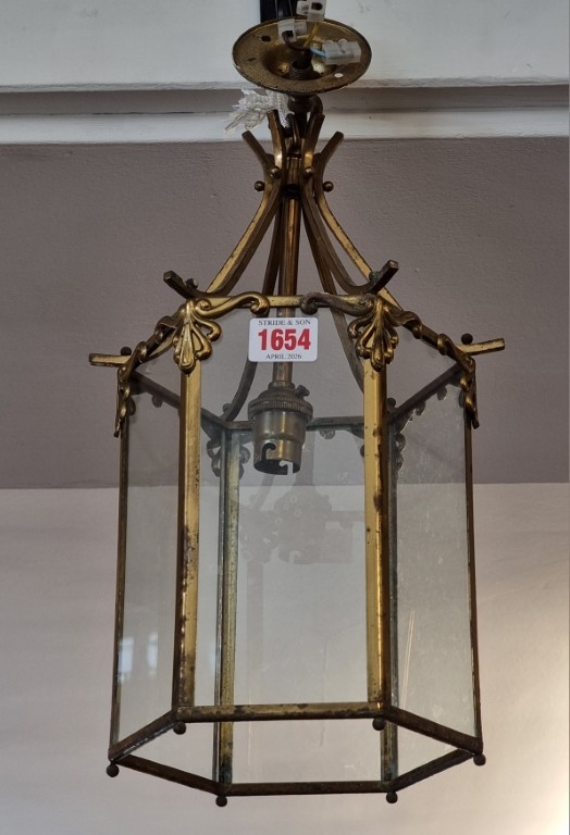 A brass and glass hexagonal hanging lantern, 34cm high.