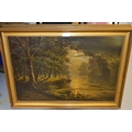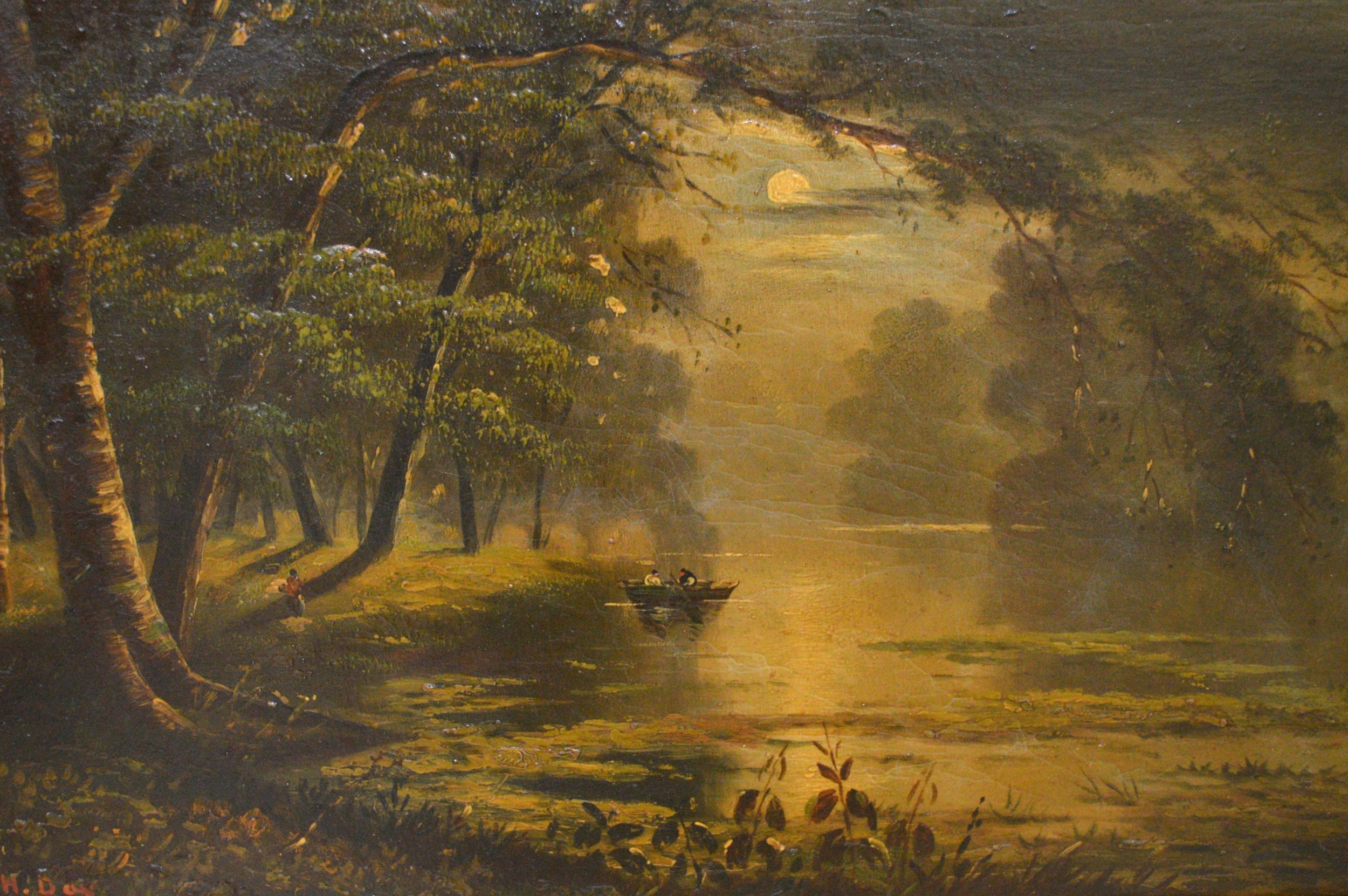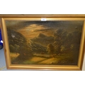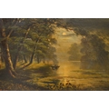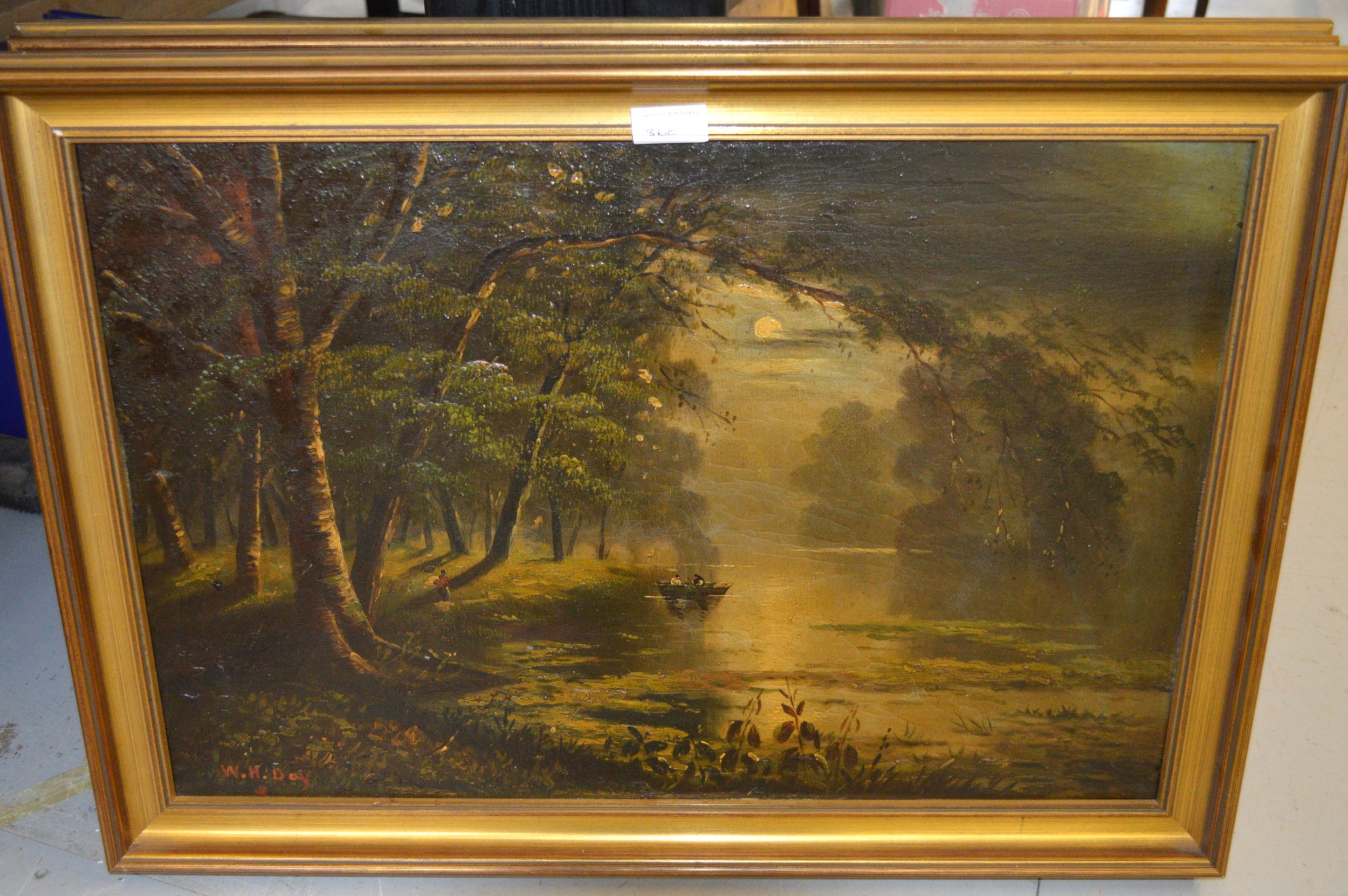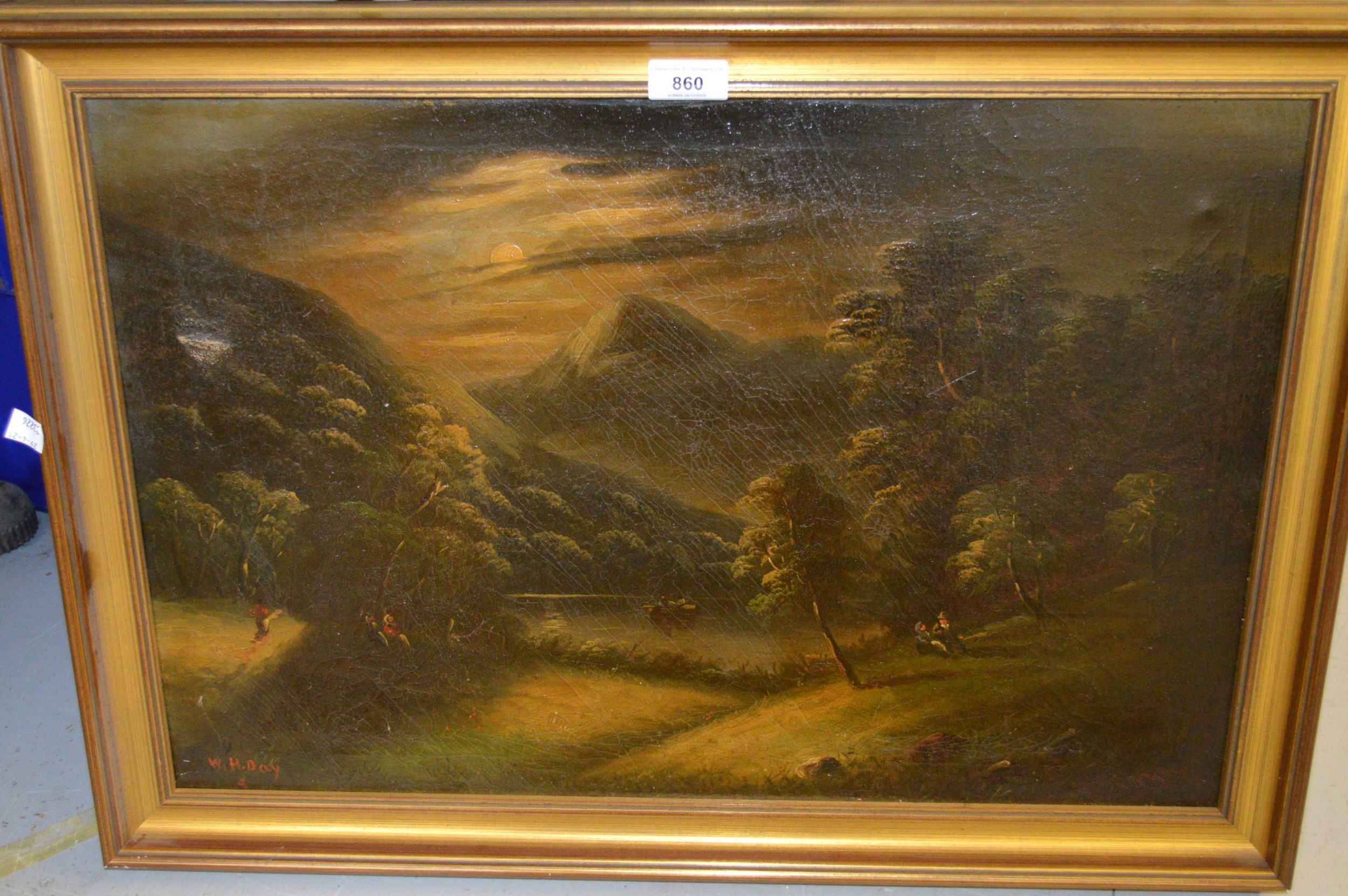 W.H. Day, pair of oil paintings on canvas, river scene and mountain scene by moonlight with figures and boats, signed, 41 x 61cm, gilt framed