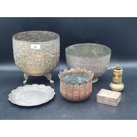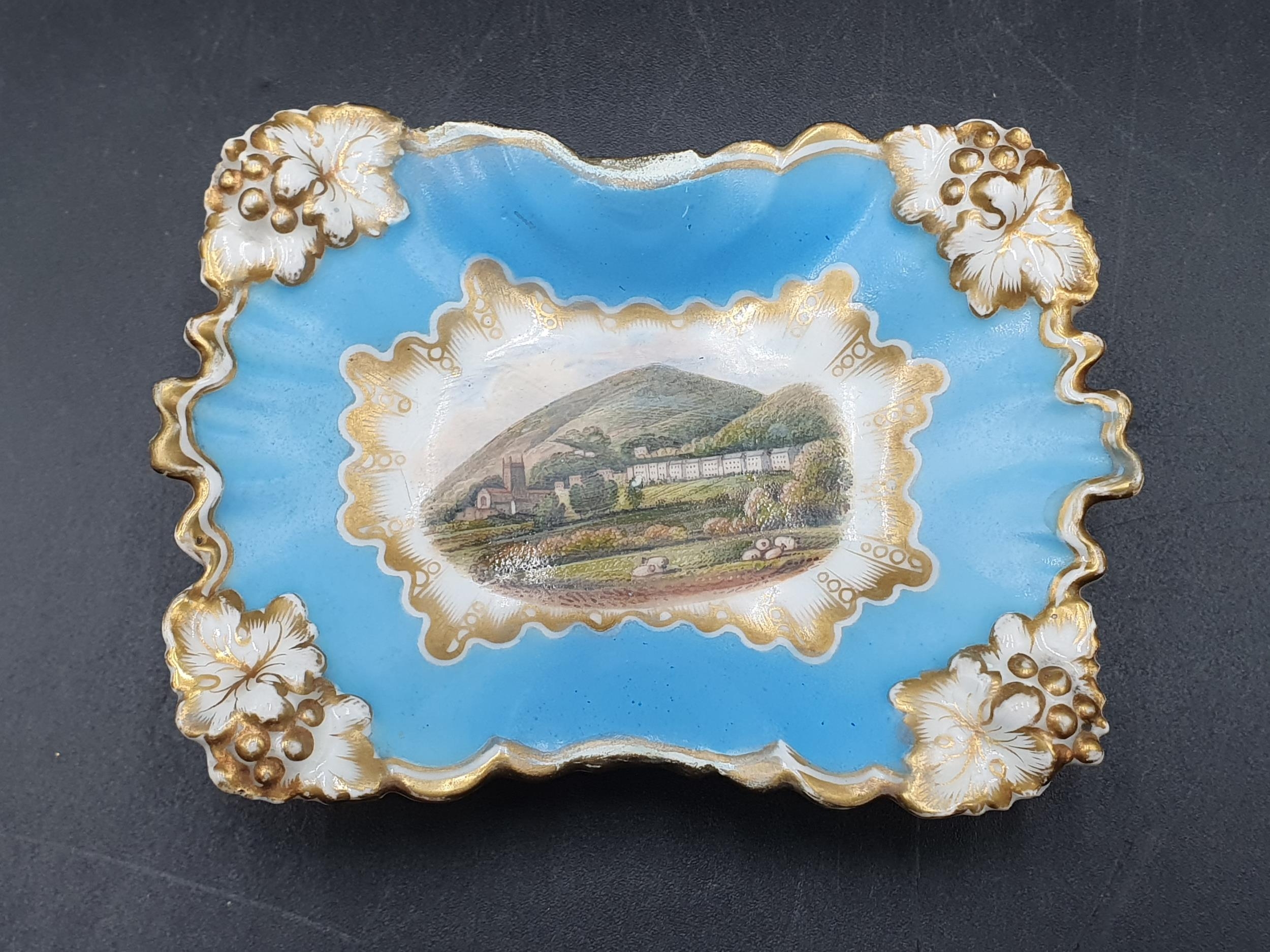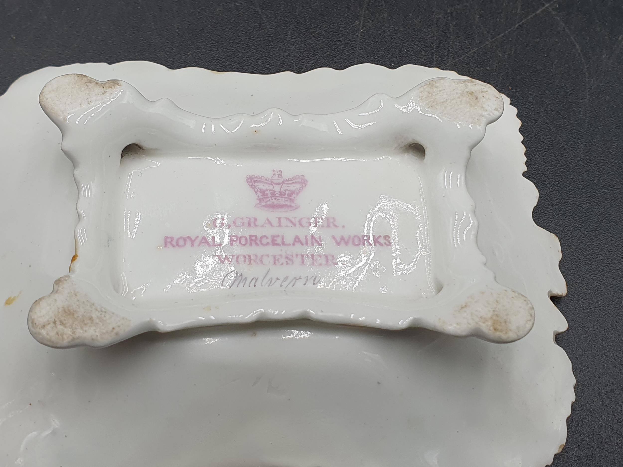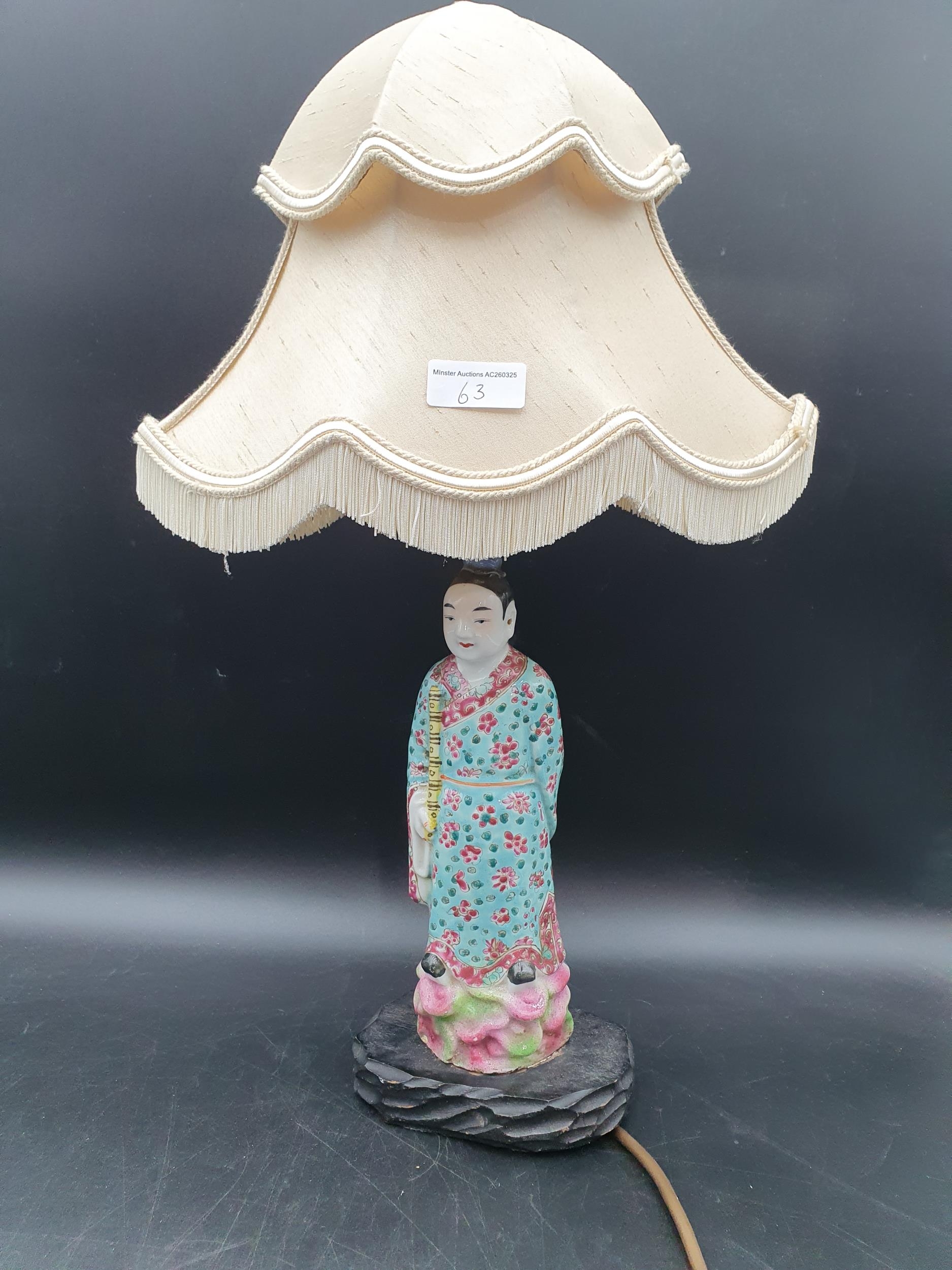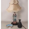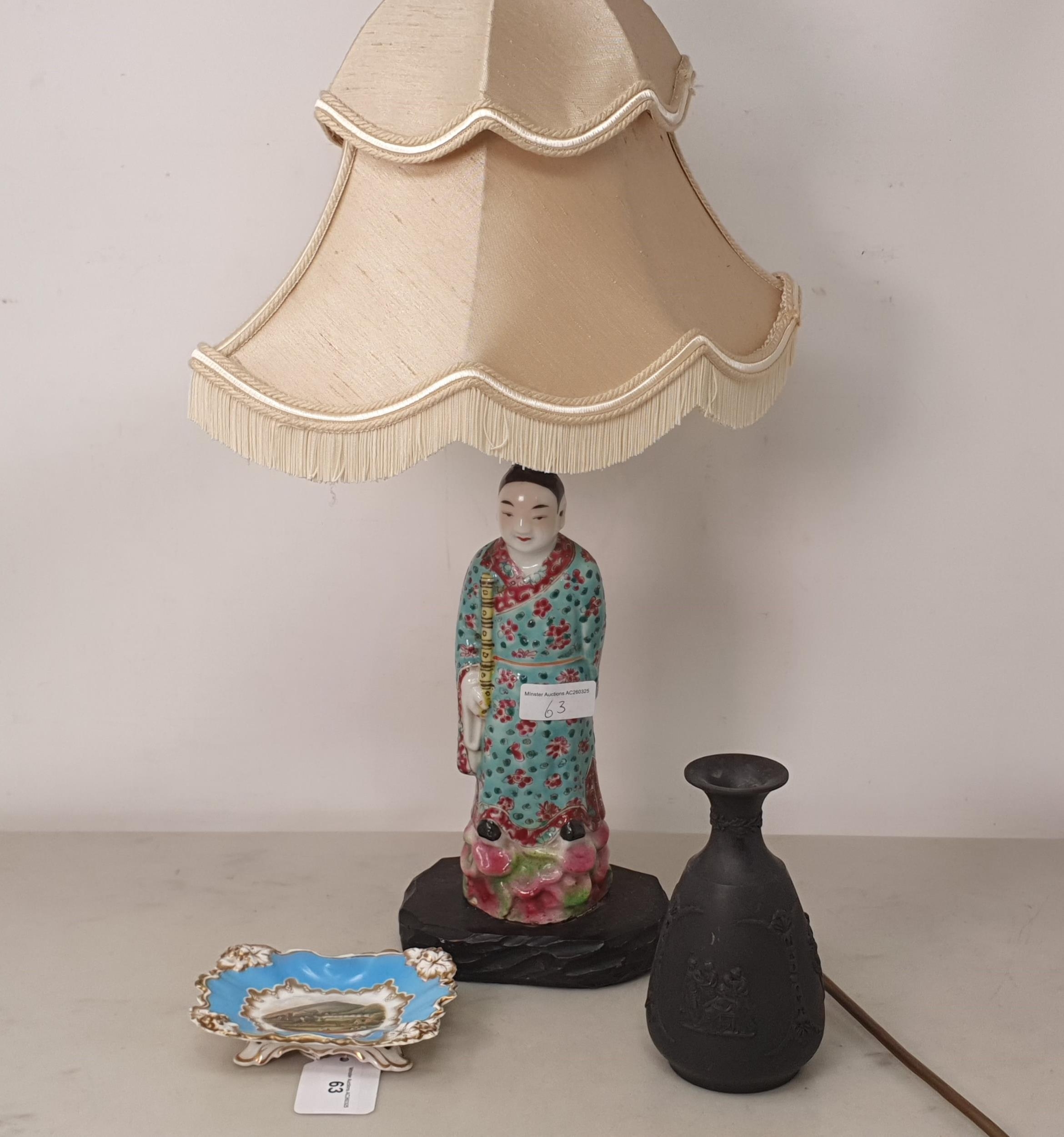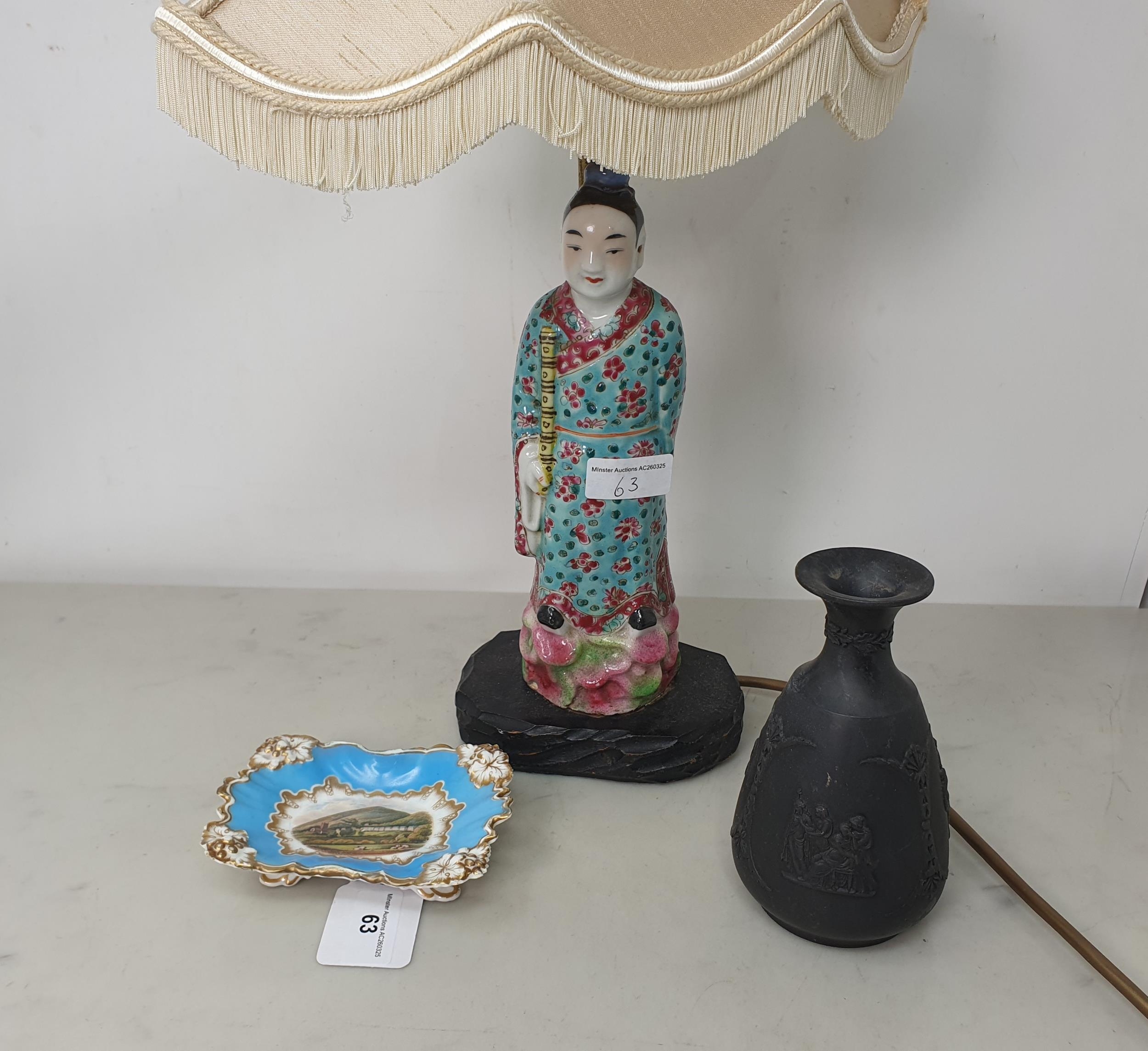 A Grainger Worcester Trinket Dish finely painted central reserve of Malvern, turquoise and gilt surround, approx 4 x 3in, a Wedgwood black basalt Vase, 5in, and a Chinese polychrome Figure, with lamp attachment, passed PAT (R1)