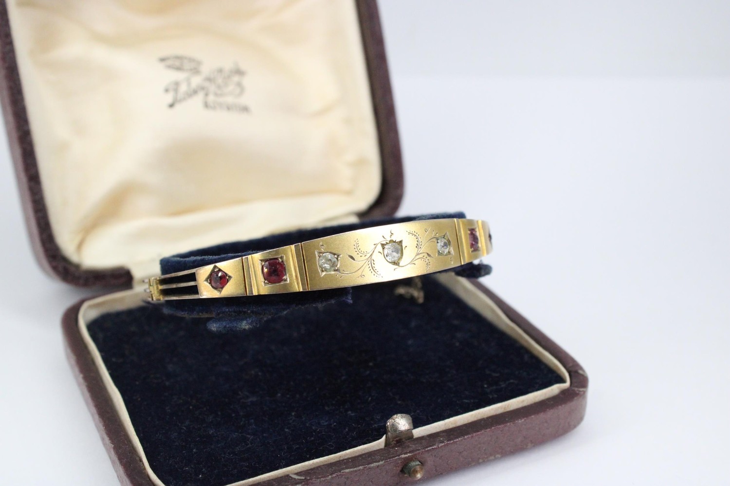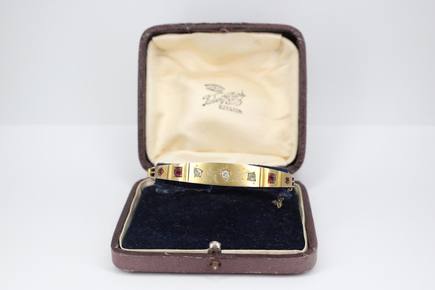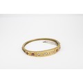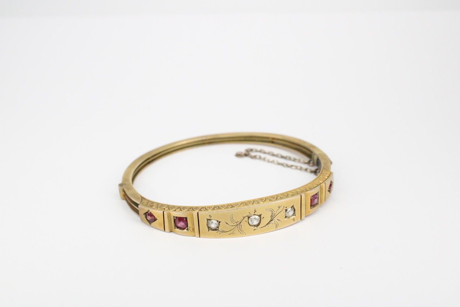 An early 20th century ruby and diamond hinged bangle. Tests 8/9ct. Weight 11.70 grams