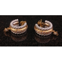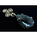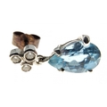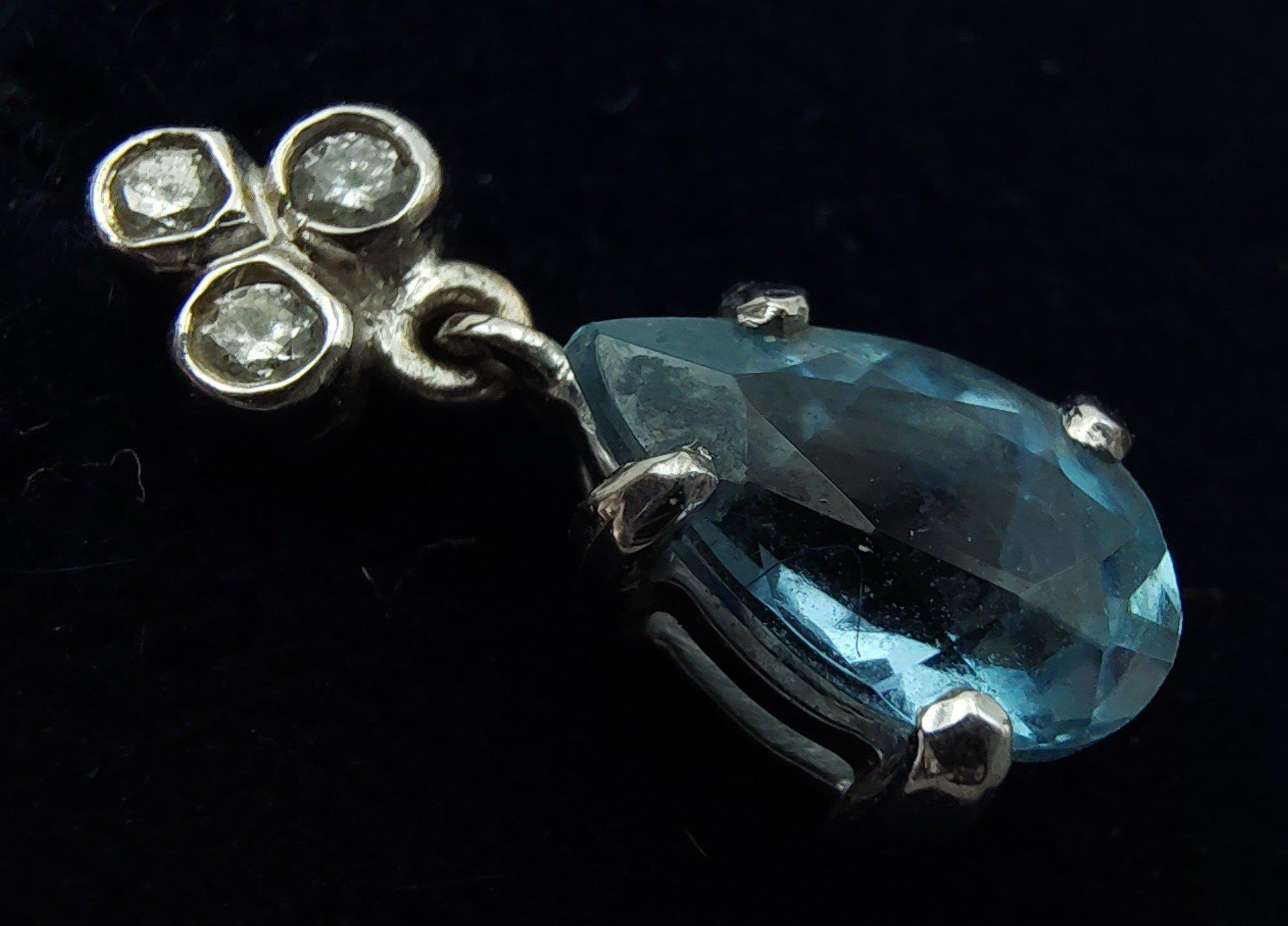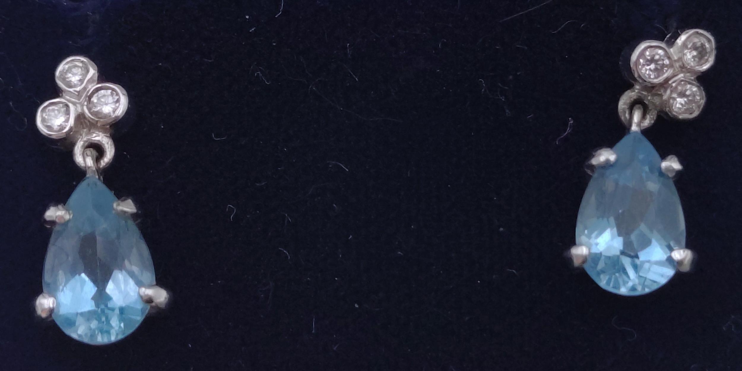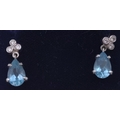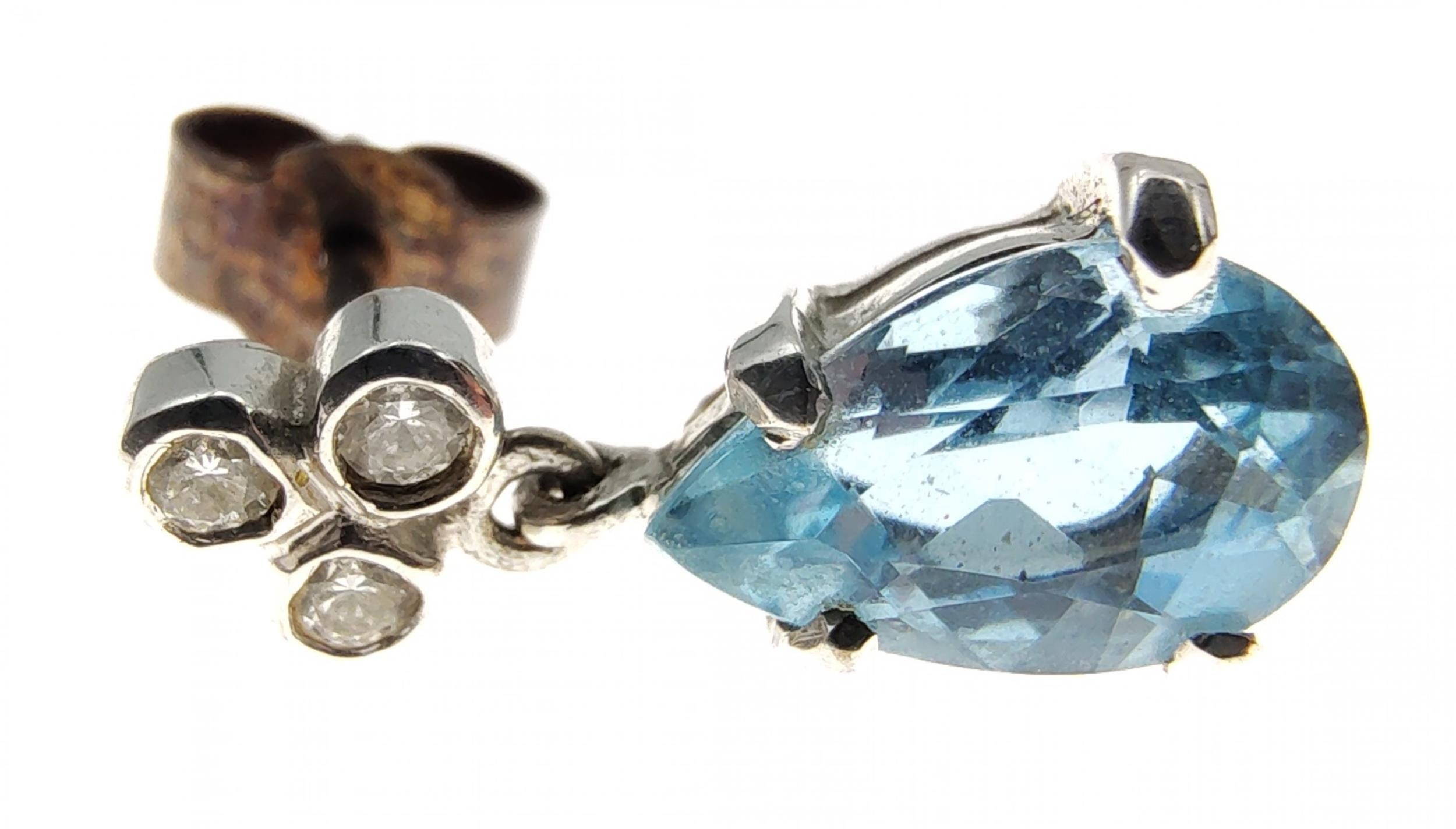 A pair of 750 stamped earrings with blue tear-drop sapphires and diamonds - weight 2g approx
