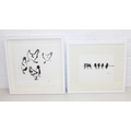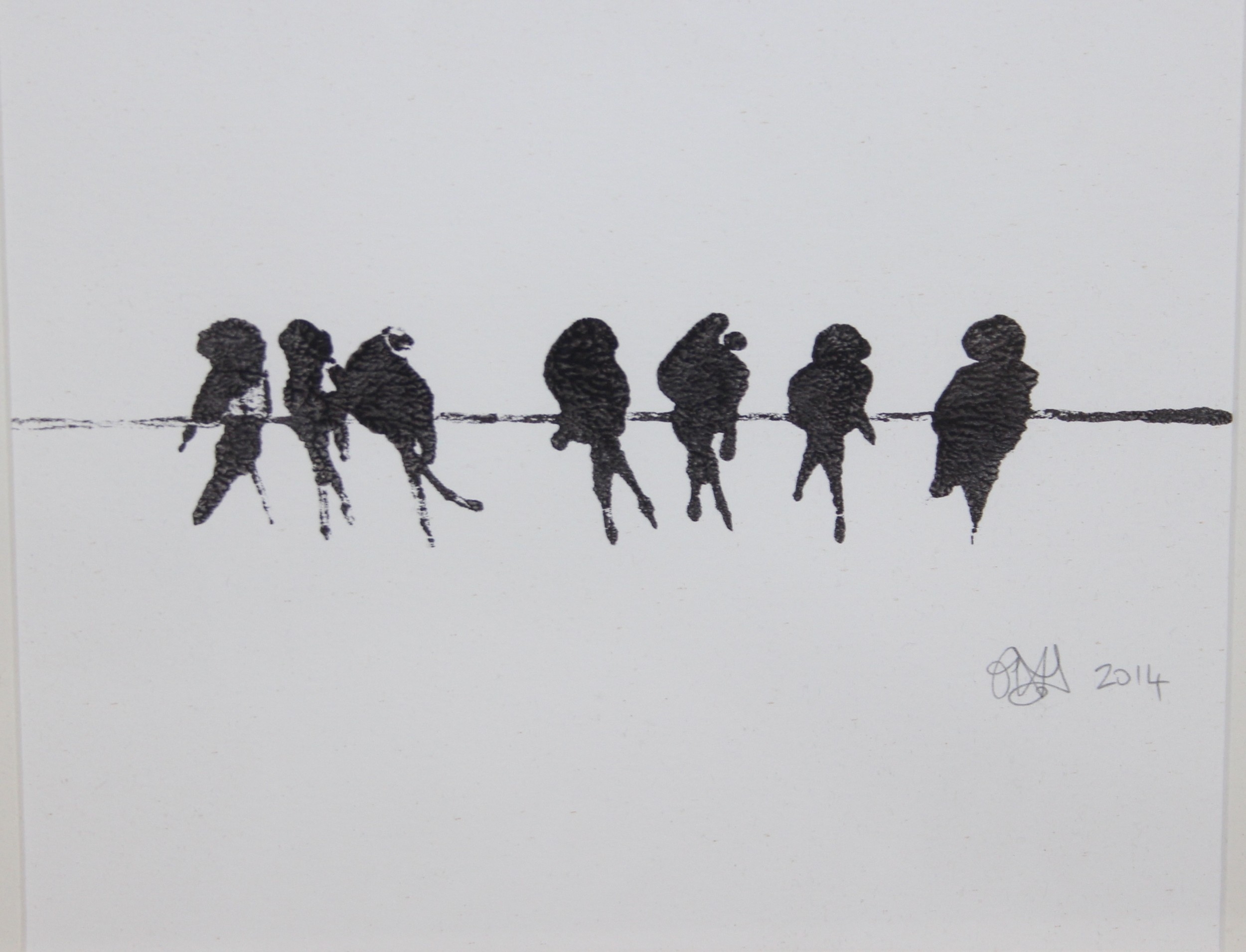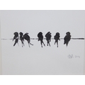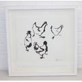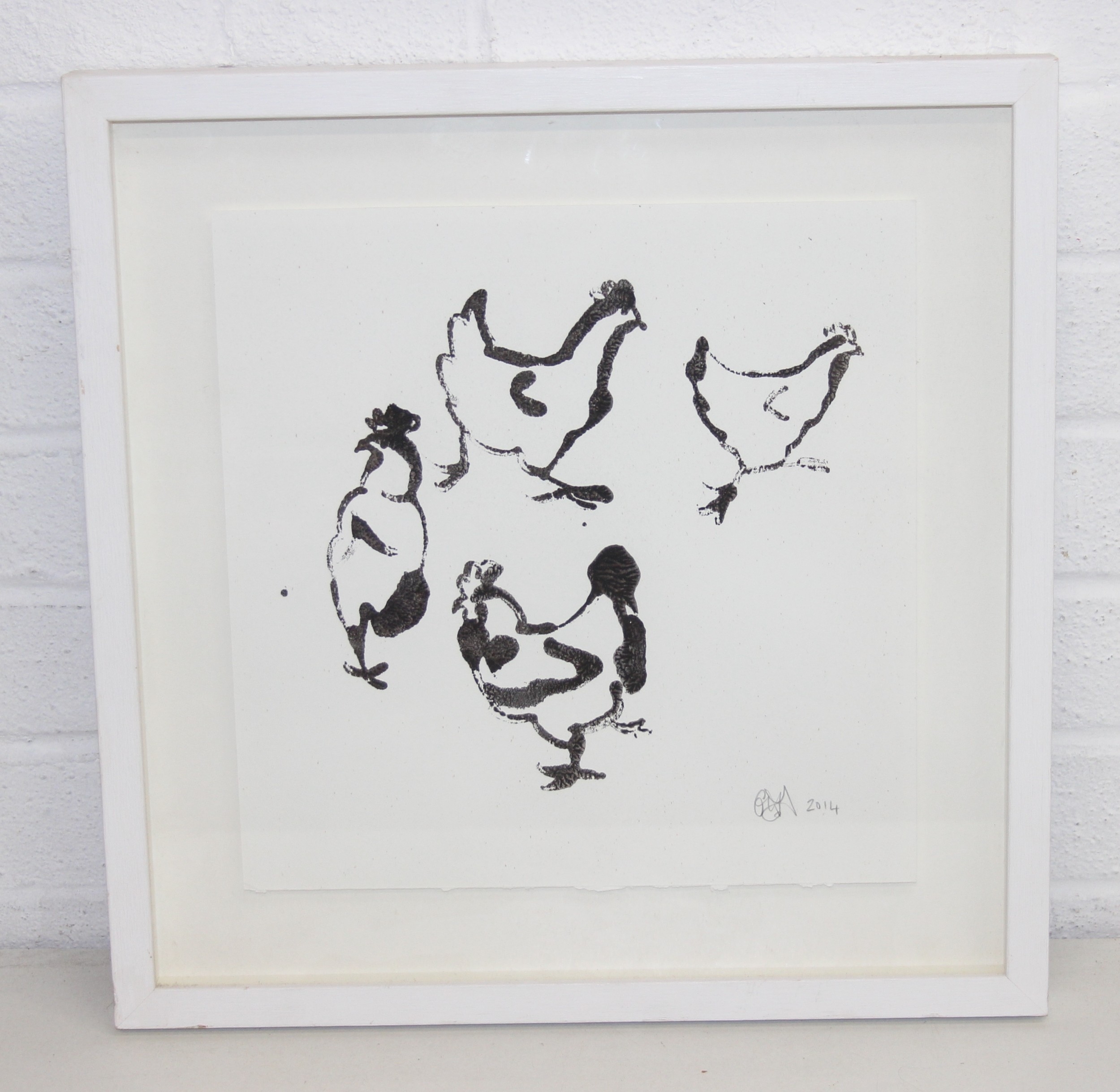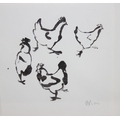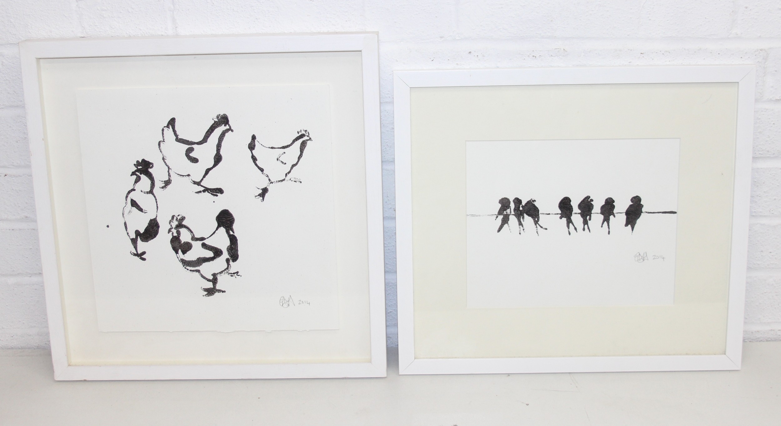 Camilla Dowse (British, Contemporary), two monochrome slightly abstract prints one depicting chickens and the other depicting Swifts or Swallows on a wire, both signed and dated in pencil, label verso to one, the largest 44cm square [2]