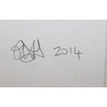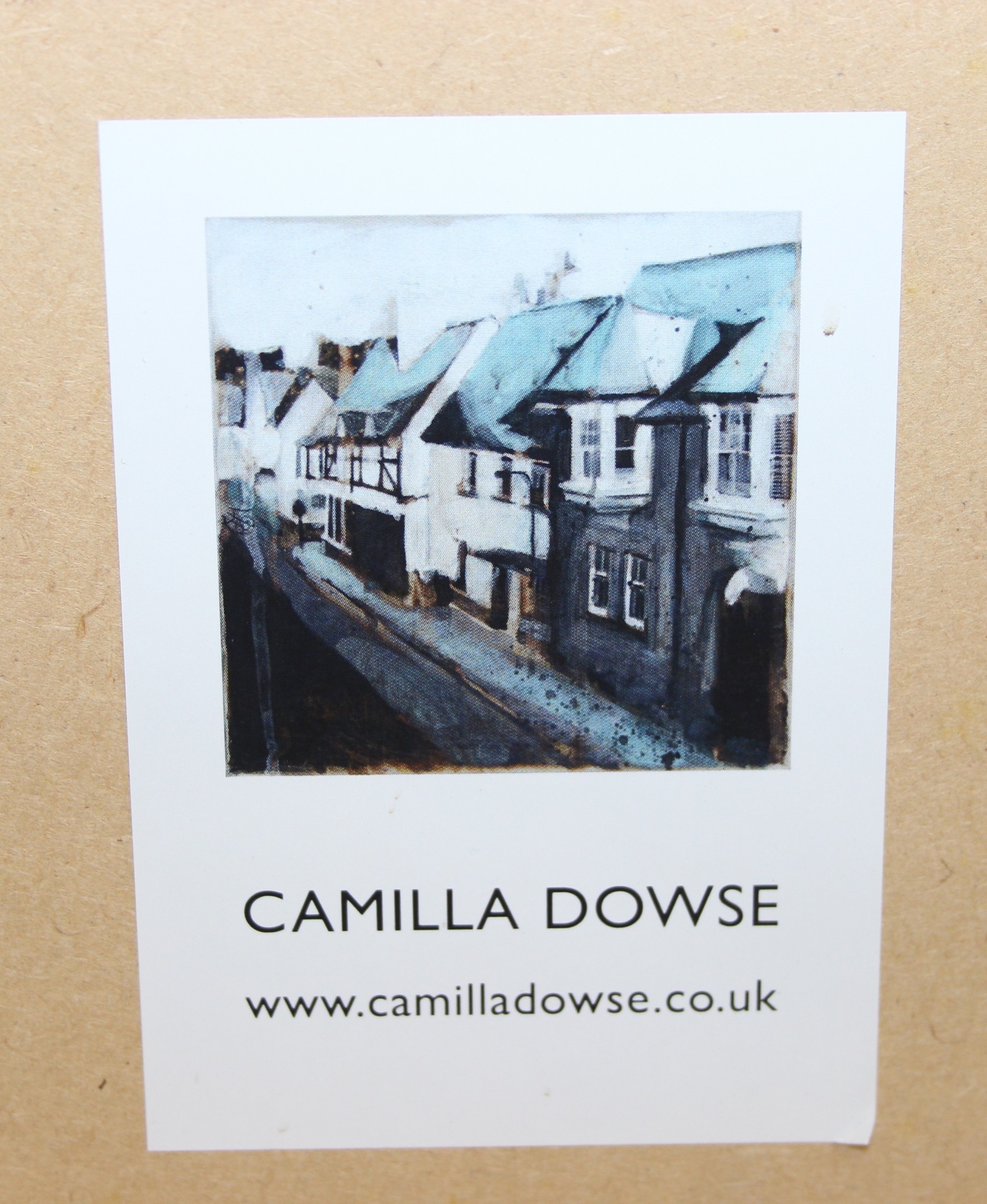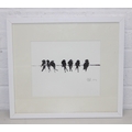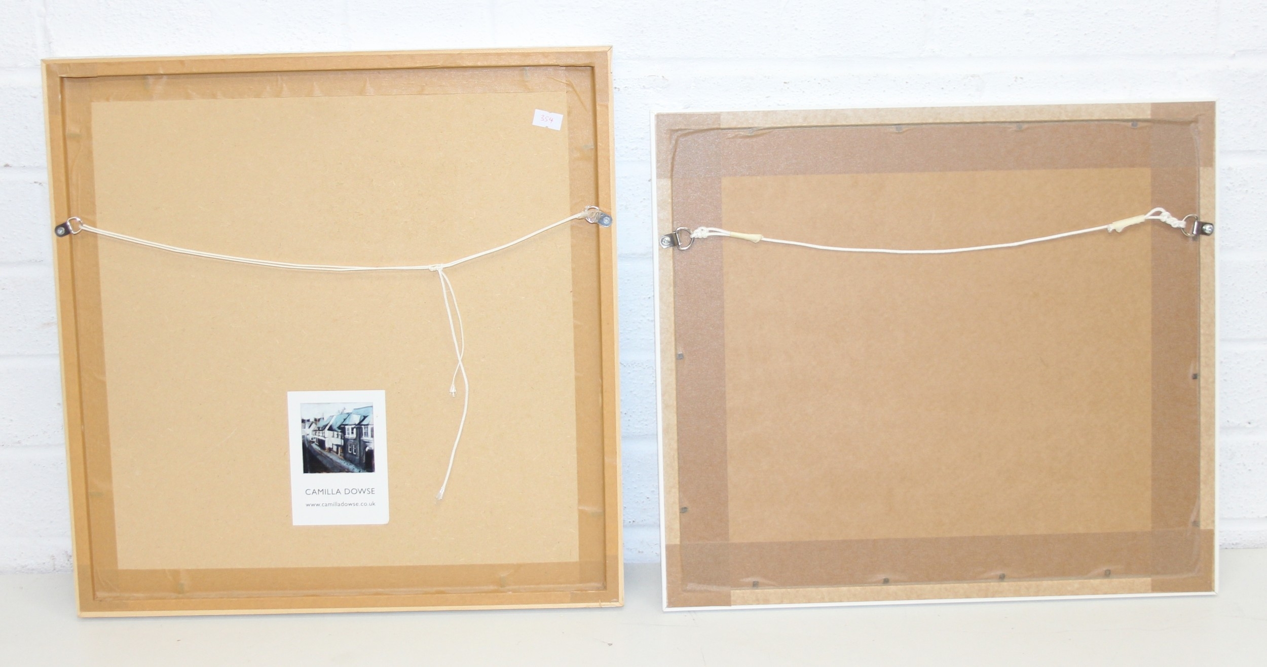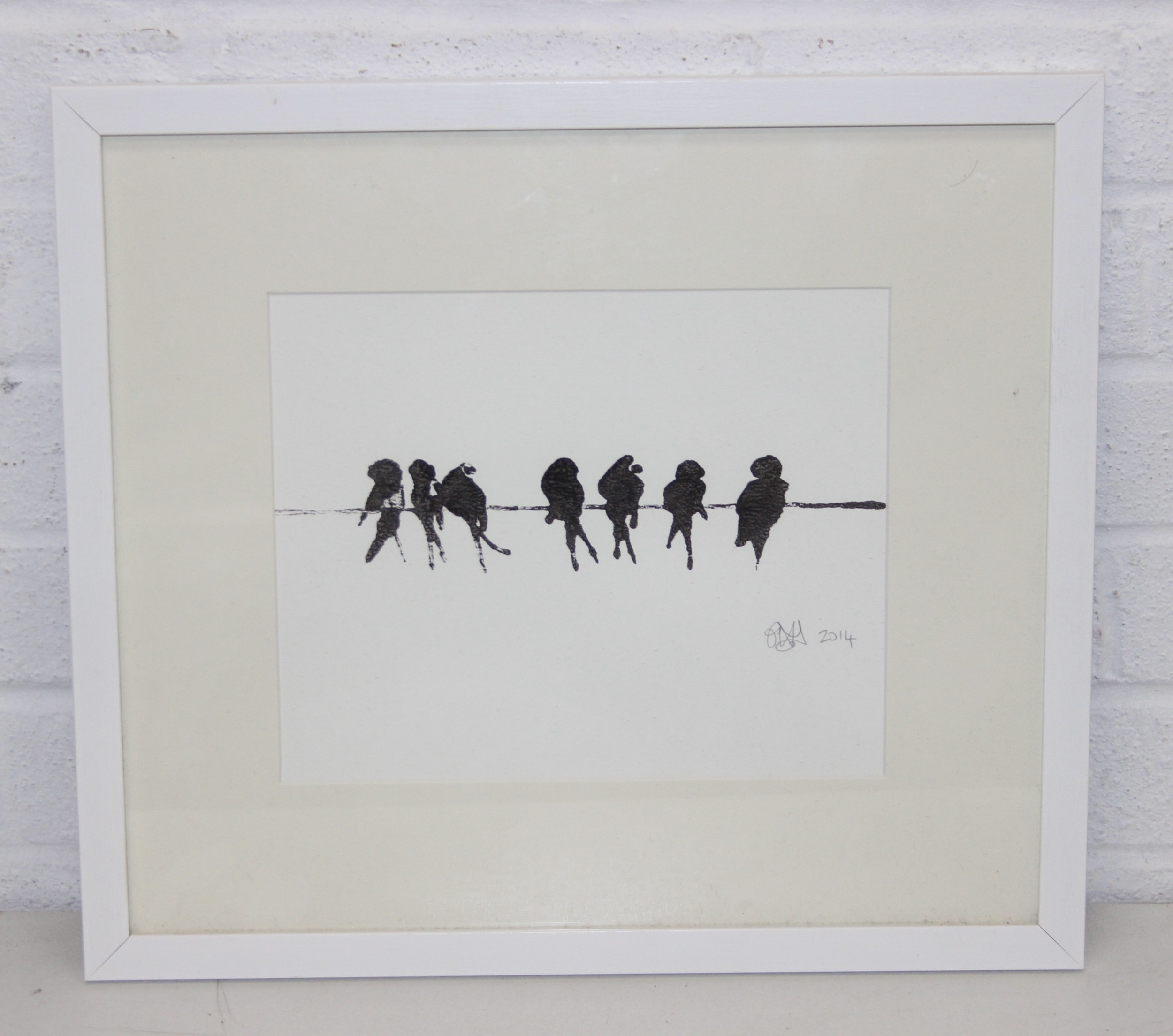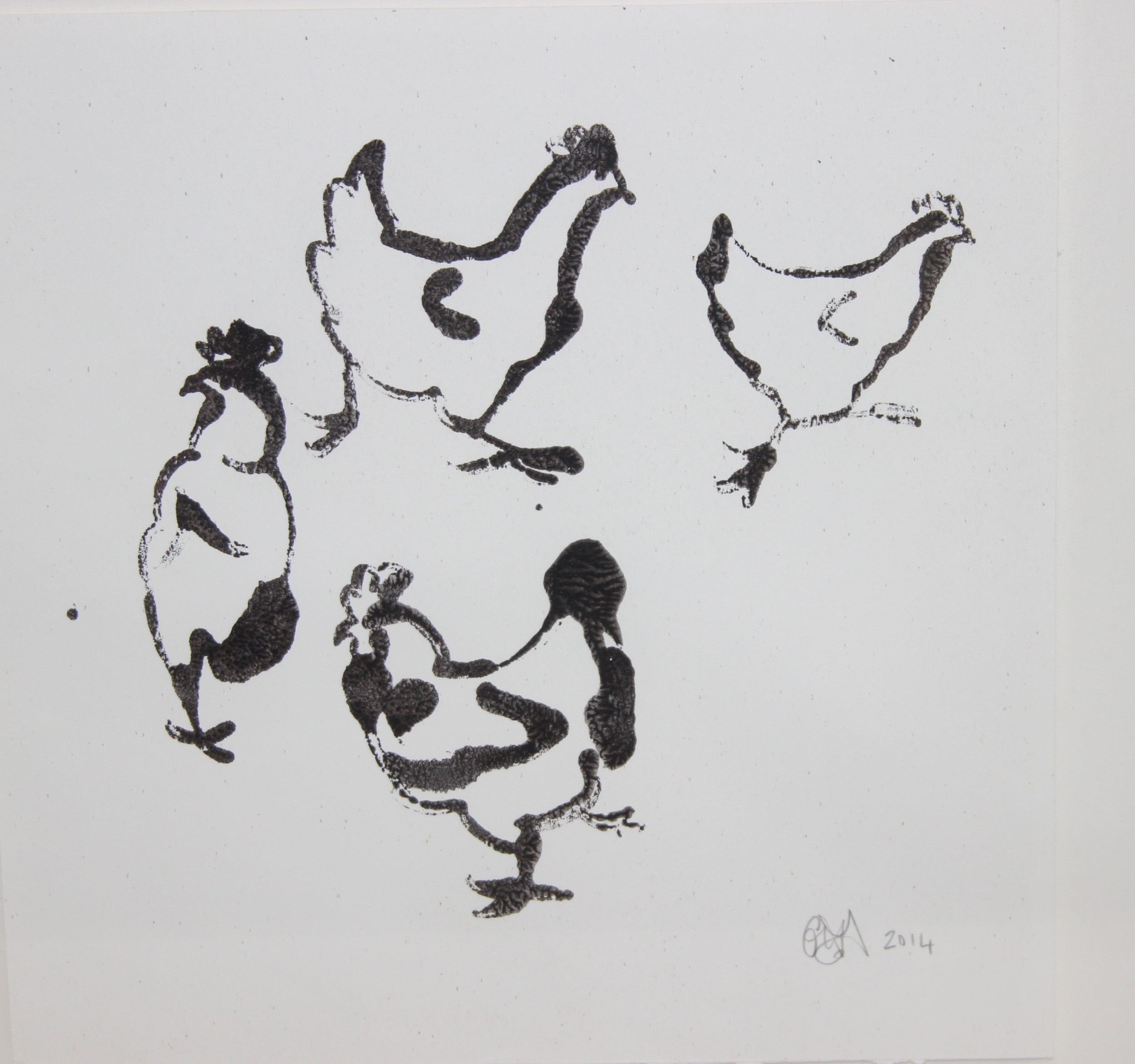 Camilla Dowse (British, Contemporary), two monochrome slightly abstract prints one depicting chickens and the other depicting Swifts or Swallows on a wire, both signed and dated in pencil, label verso to one, the largest 44cm square [2]