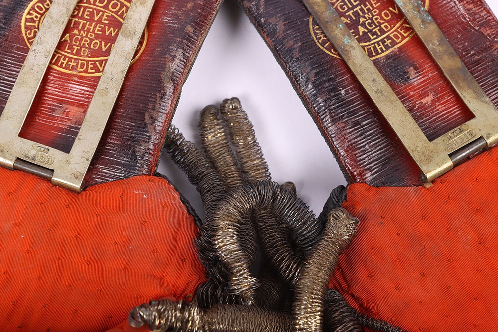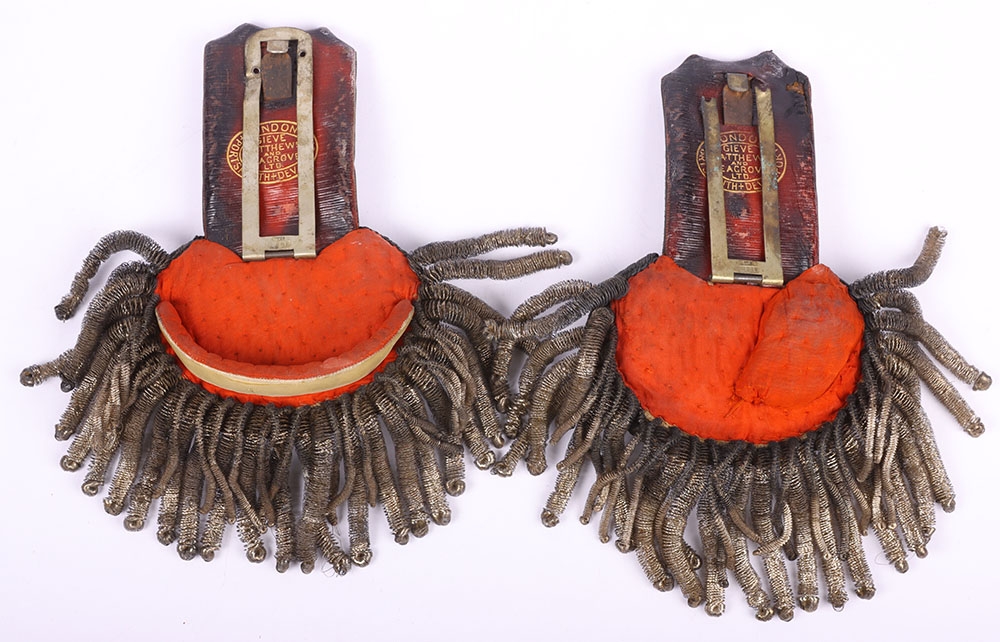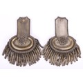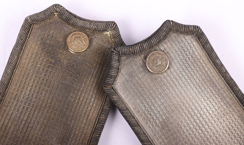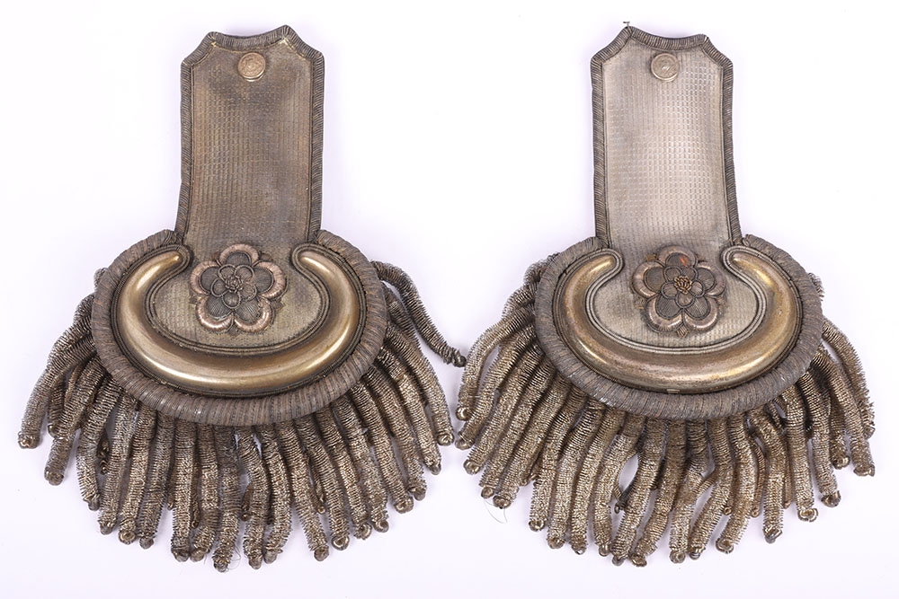 Pair of Deputy Lord Lieutenants Shoulder Boards, fine pair of post 1902 period shoulder boards with silver fittings, large bullion rose emblems to both boards, silver plated metal work, single buttons and silver wire fringe. Leather and cloth backing to the undersides with the metal fixing clips. One fixing clip damaged.