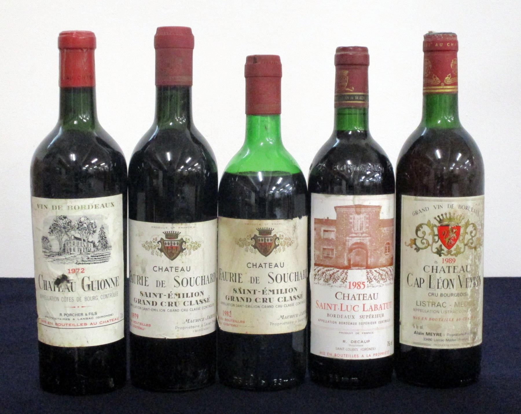 1 bt Ch. Guionne Côtes de Bourg 1972 us/ts, sl bs, vsl cdl 1 bt Ch. de Faurie de Souchard 1979 St-Émilion Grand Cru Classé us sl bs 1 bt Ch. de Faurie de Souchard 1982 St-Émilion Grand Cru Classé lms, sl bs/ sl stl 1 bt Ch. Saint-Luc Labatut 1985 Bordeaux Superieur i.n, vsl bs 1 bt Ch. Cap Léon Veyrin Listrac-Medoc Cru Bourgeois 1989 us/ts, bs, foil top removed Above five bottles