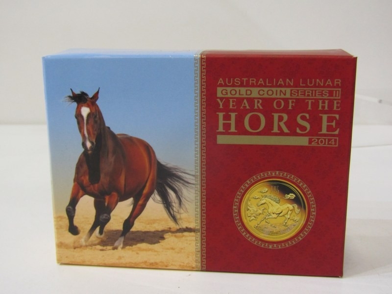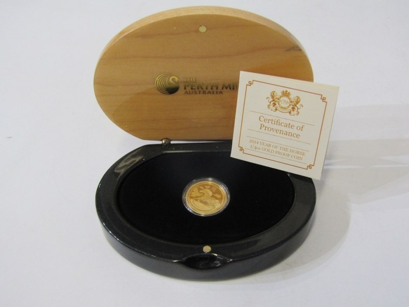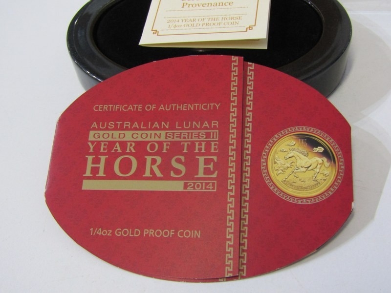 AUSTRALIAN 0.25 OZ GOLD PROOF COIN, 2014 Australian Lunar Series II gold coin "The Year of the Horse", 7.777grams of 99.99 purity, limited to 5000, double boxed with CoA