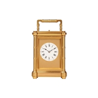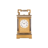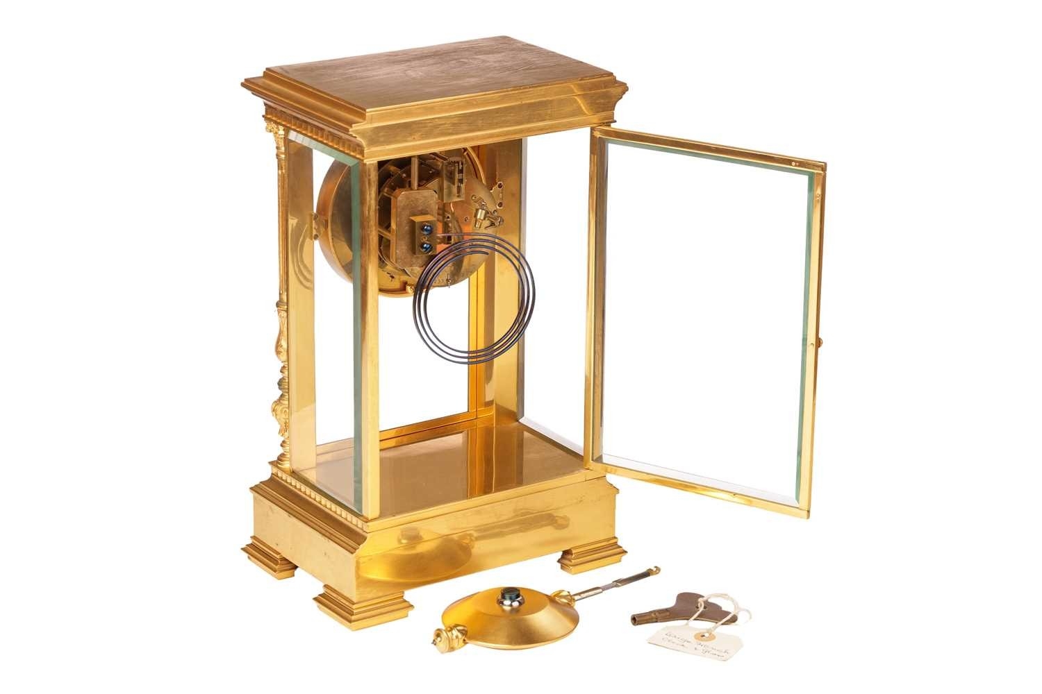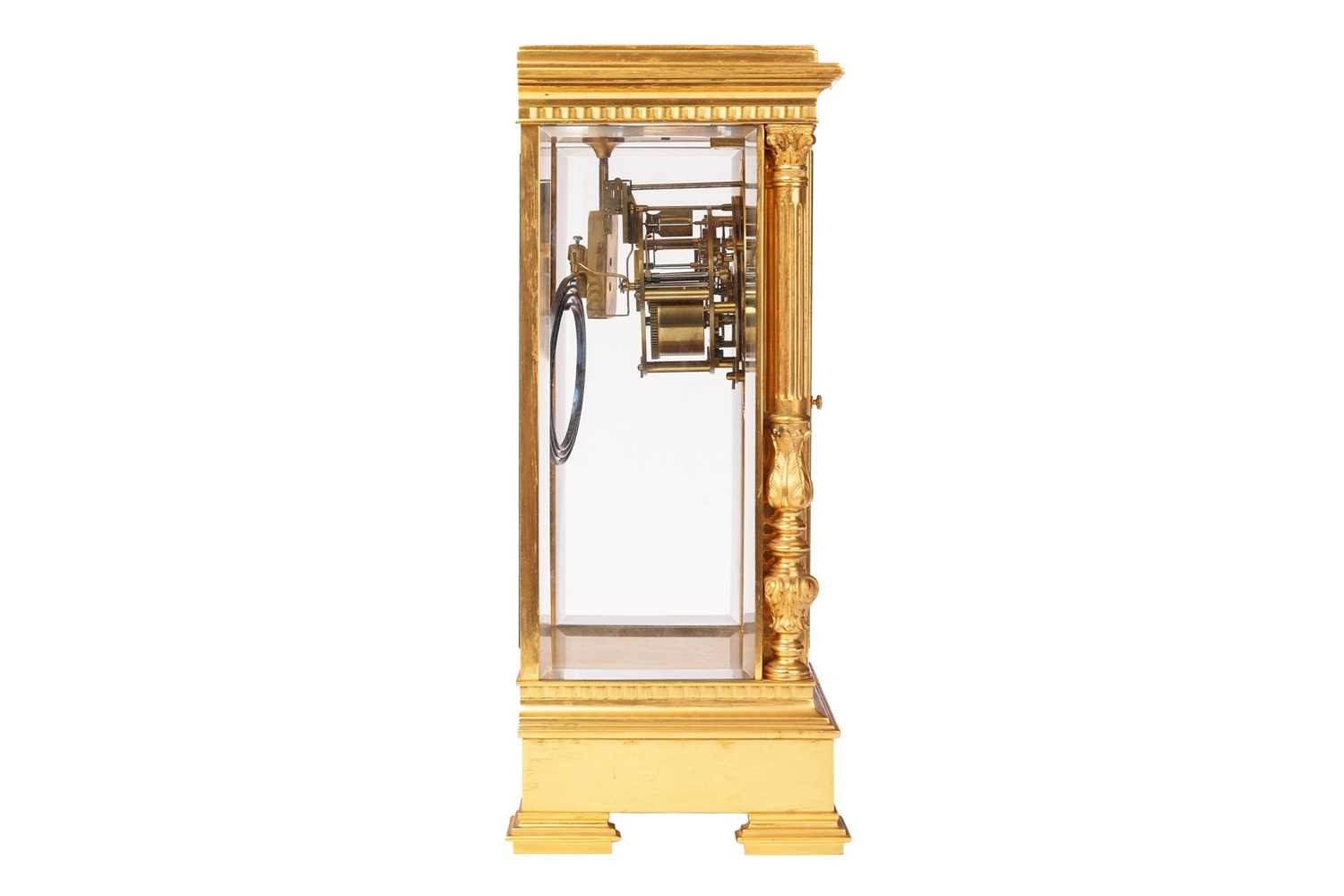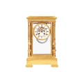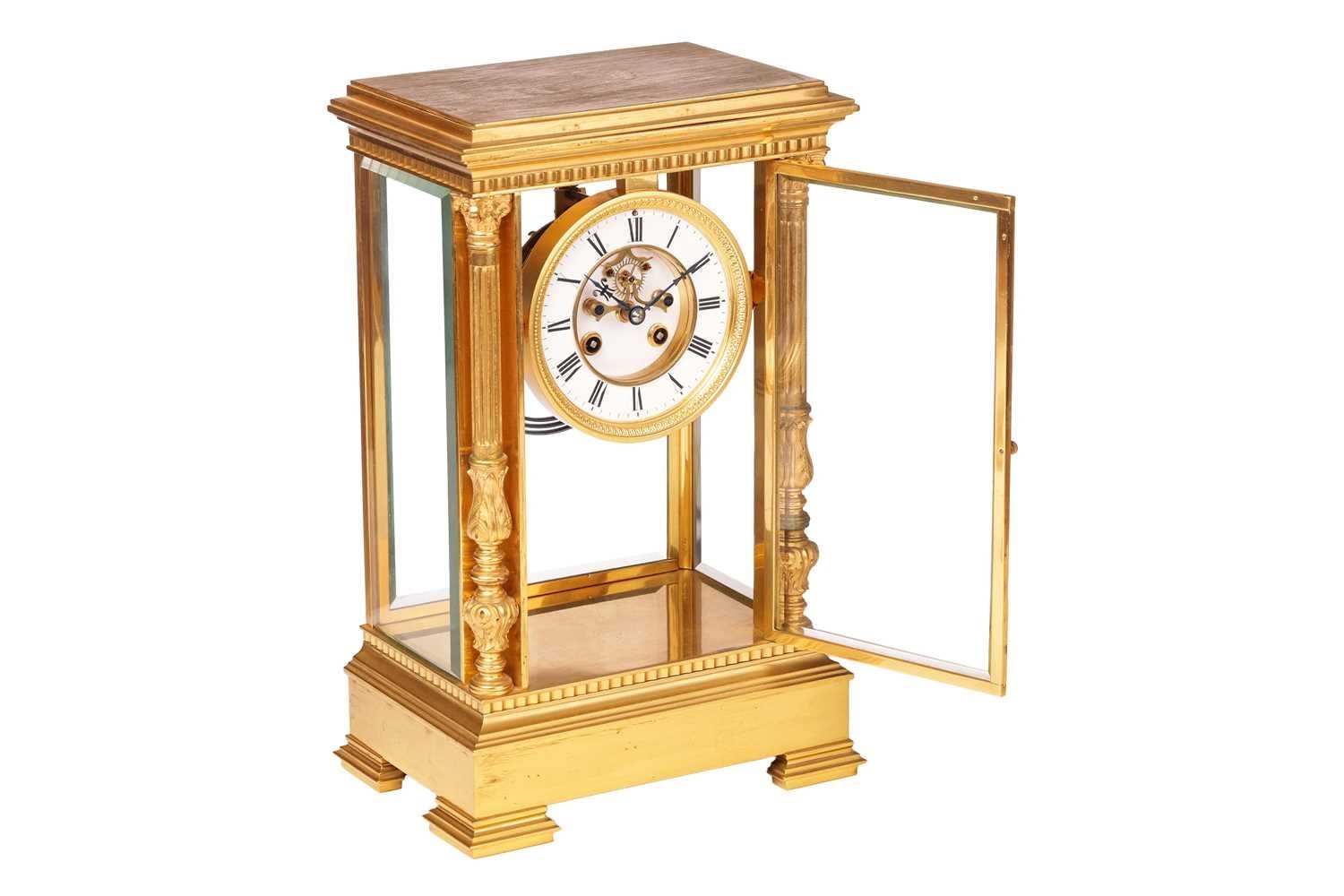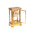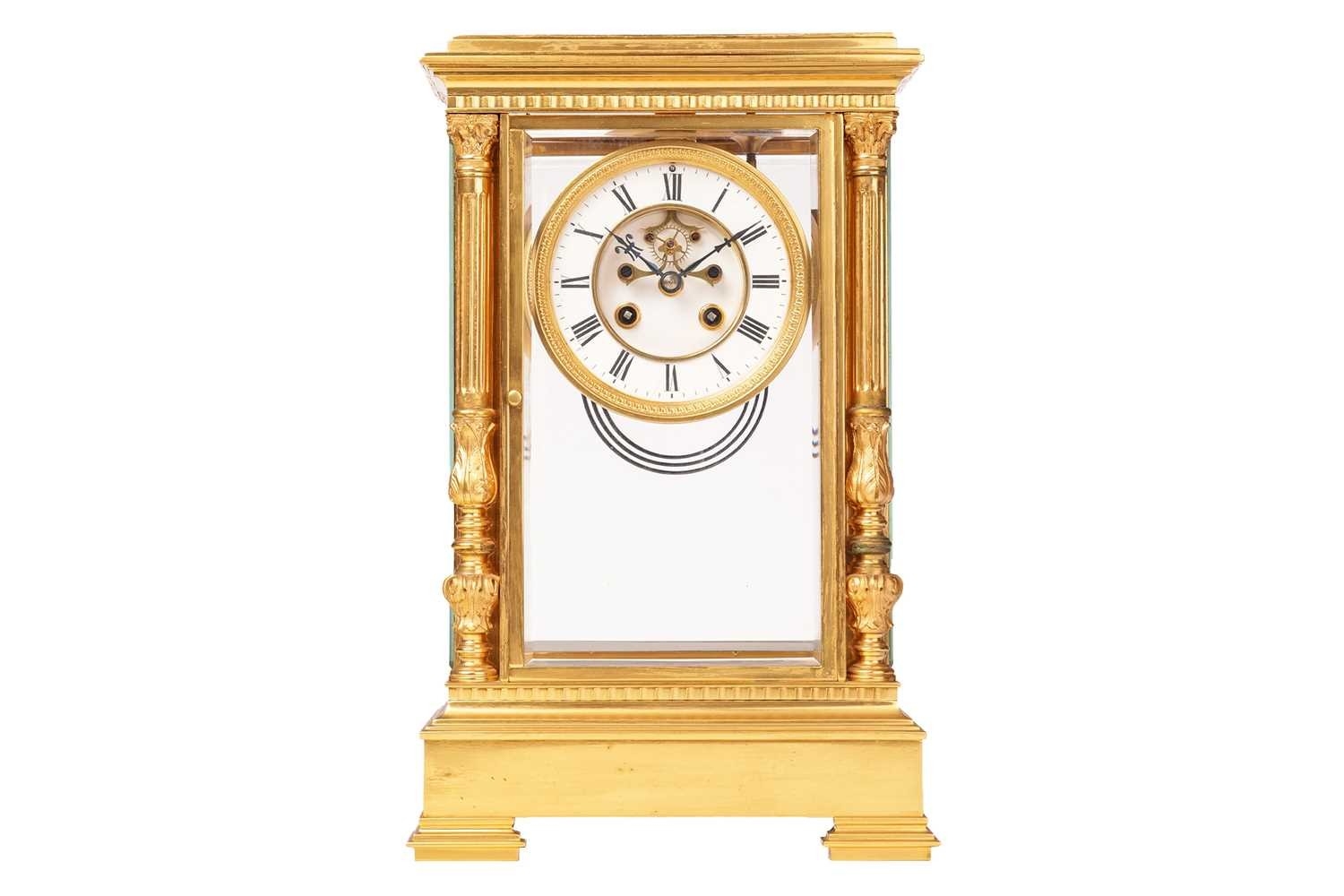 G Cheillier; a large French gilt-brass four-glass 8-day regulator (?) mantel clock, with circular enamel Roman dial, the recessed centre with visible brochot escapement with jewelled pin pallets, blued steel halberd hands, fitted with a large steel and gilt-brass pendulum. Chiming the hours and half as a passing strike on a coil gong, the movement numbered 17755 and bearing "CCH" maker's mark, the case with turned and chased quarter columns, 37 cm overall height. Both trains wind well Chiming as expected All lenses good Escape activates when the crutch is moved