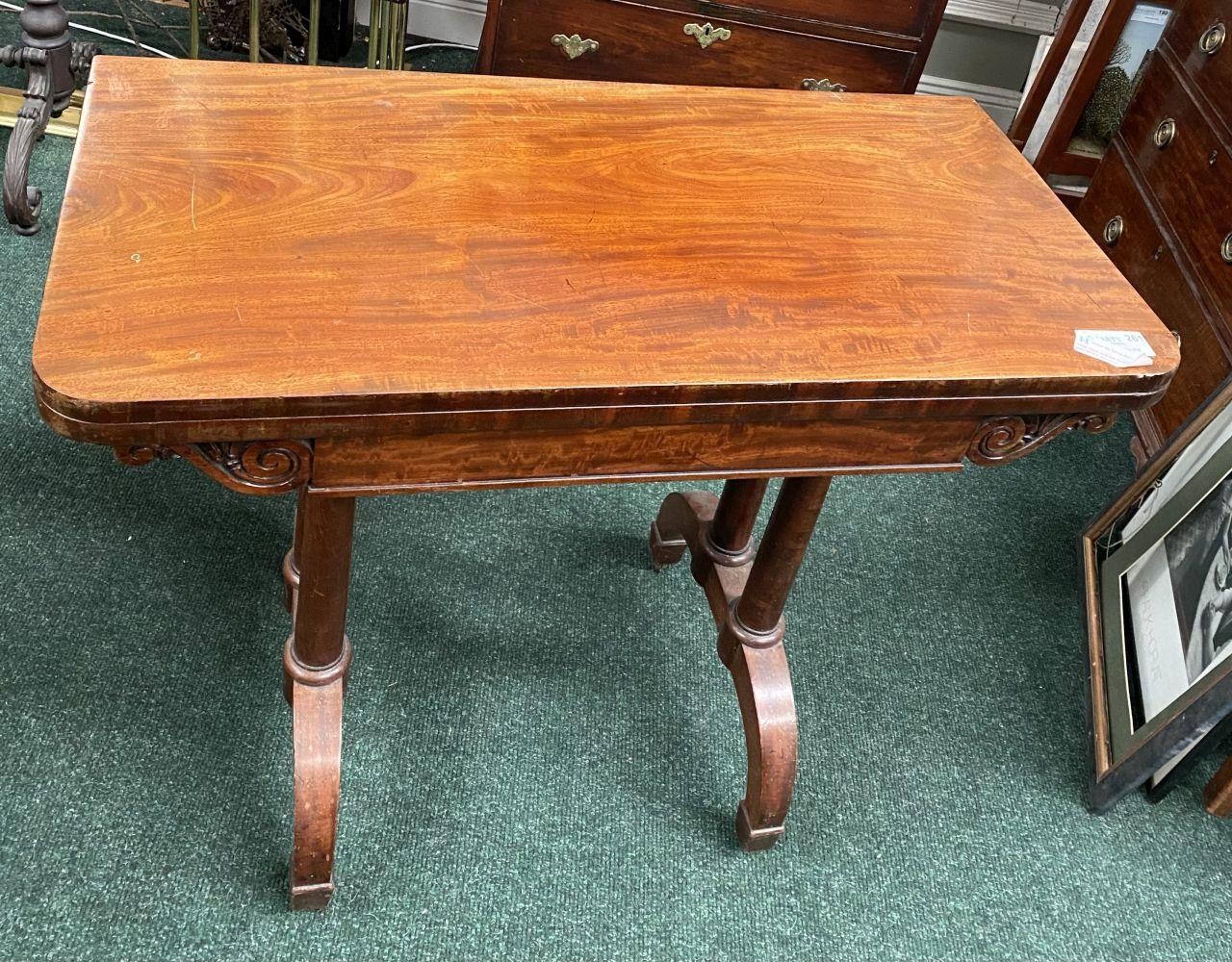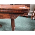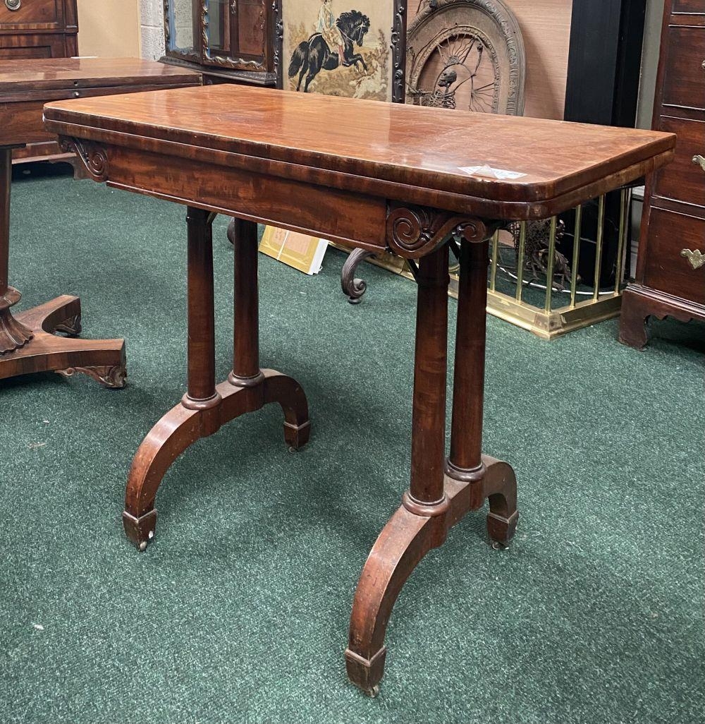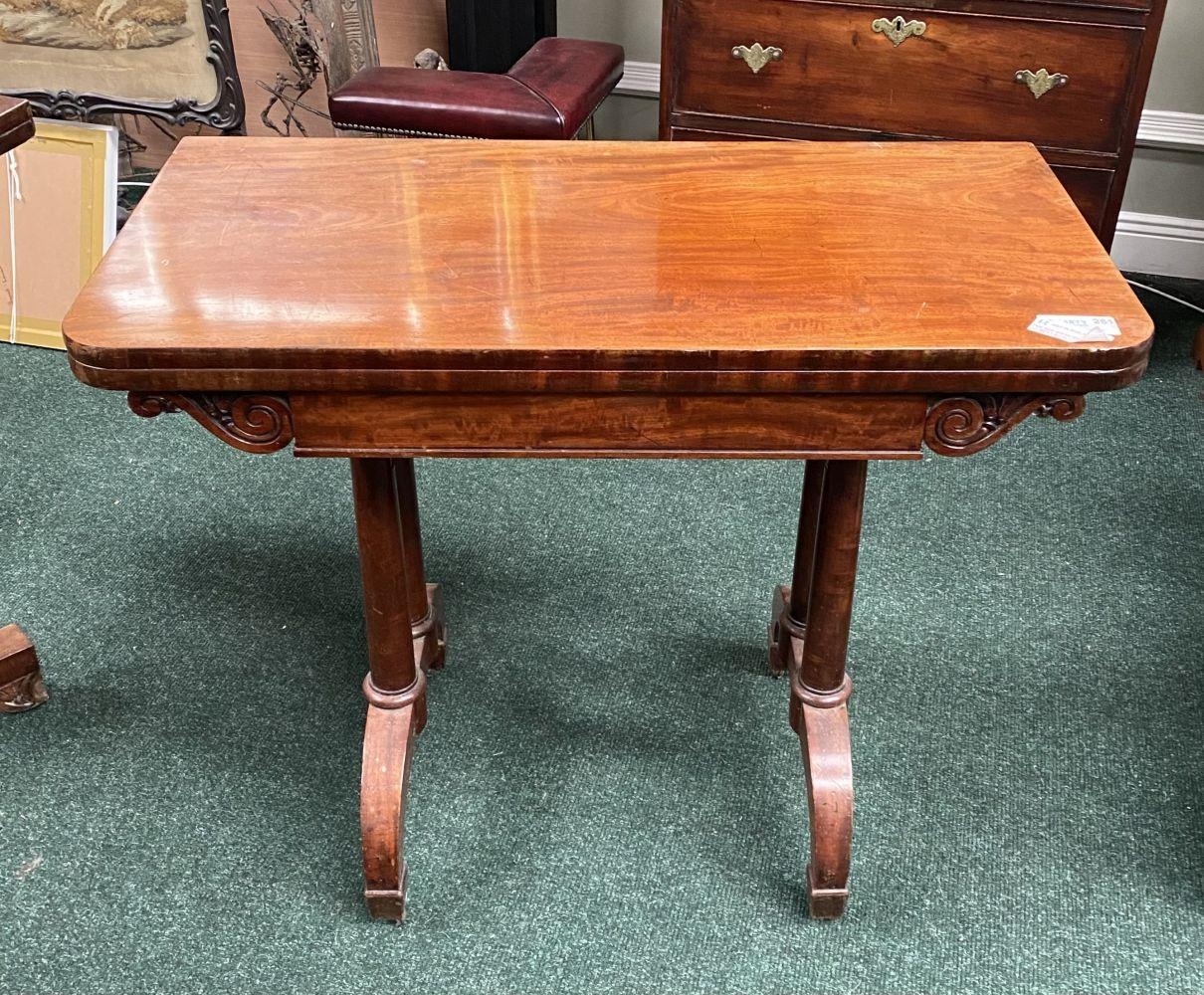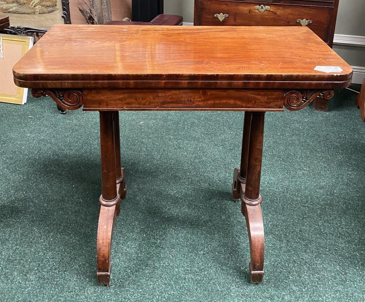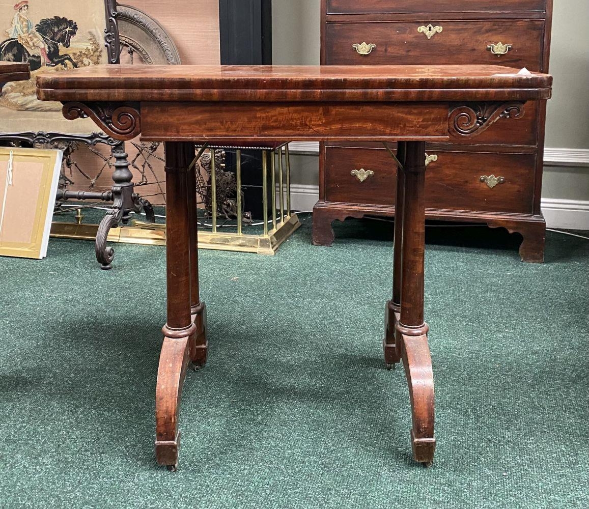 AN ATTRACTIVE MAHOGANY FOLD OVER CARD TABLE, with carved frieze, raised on a pair of side pods, each with a pair of tapered turned supports sitting on down turned curved spade feet, on castors. Dimensions: 36in x 29.5in x 17.5in approx. closed
