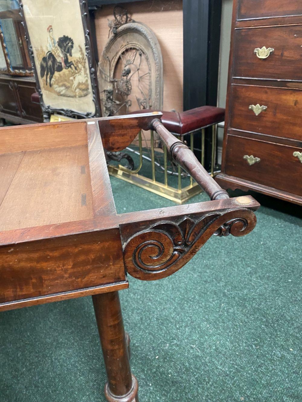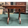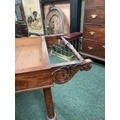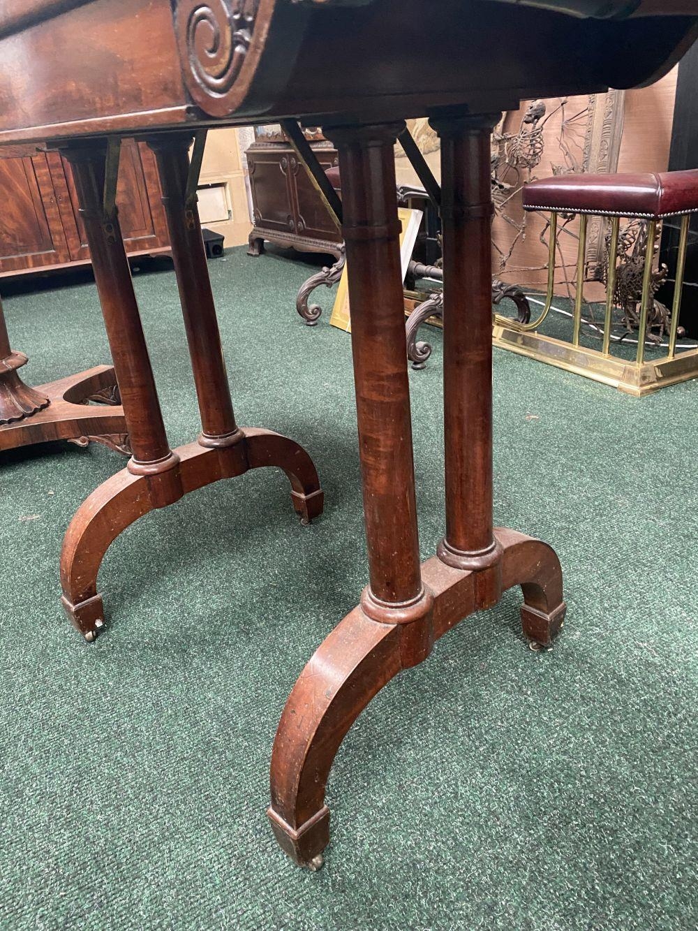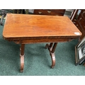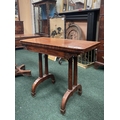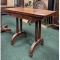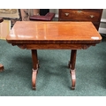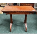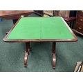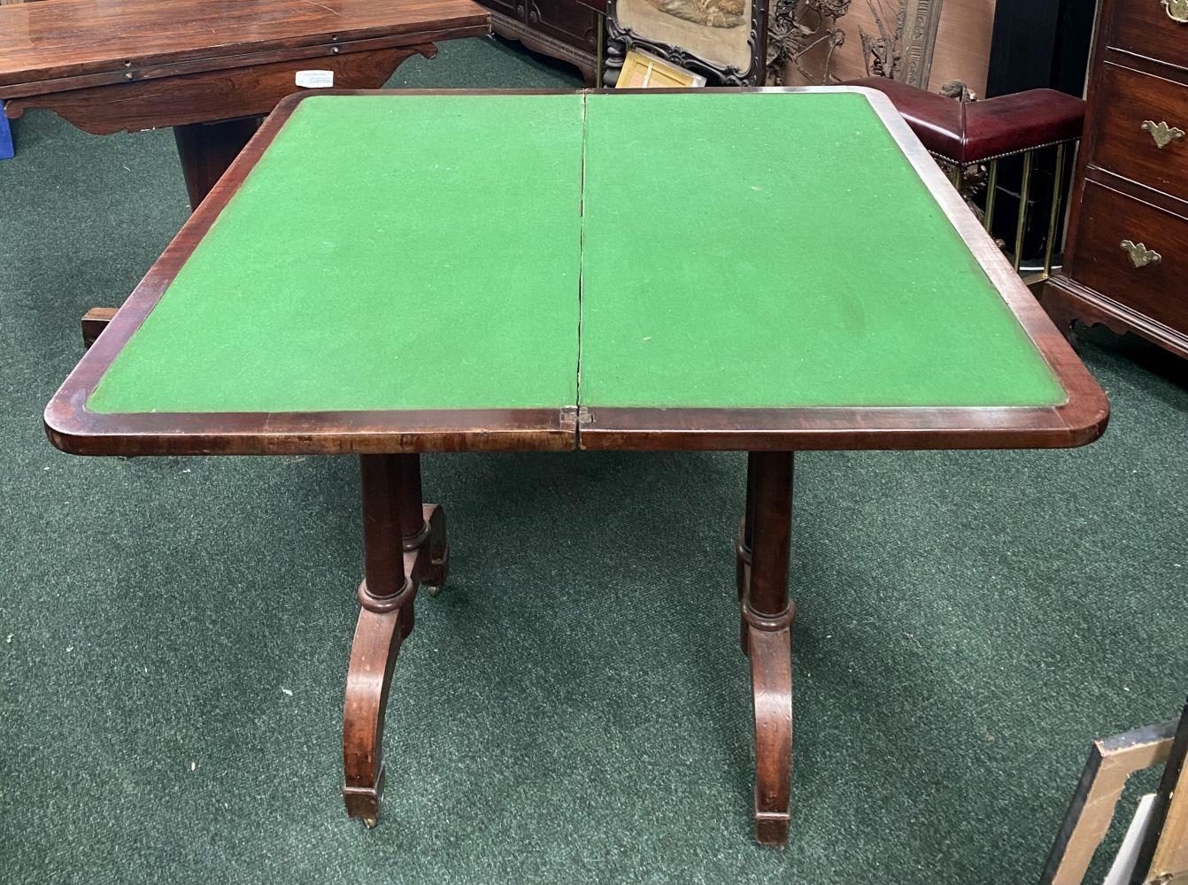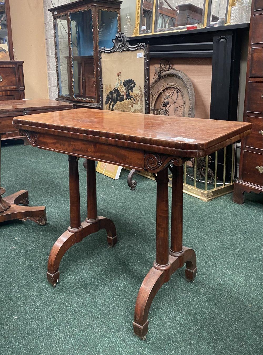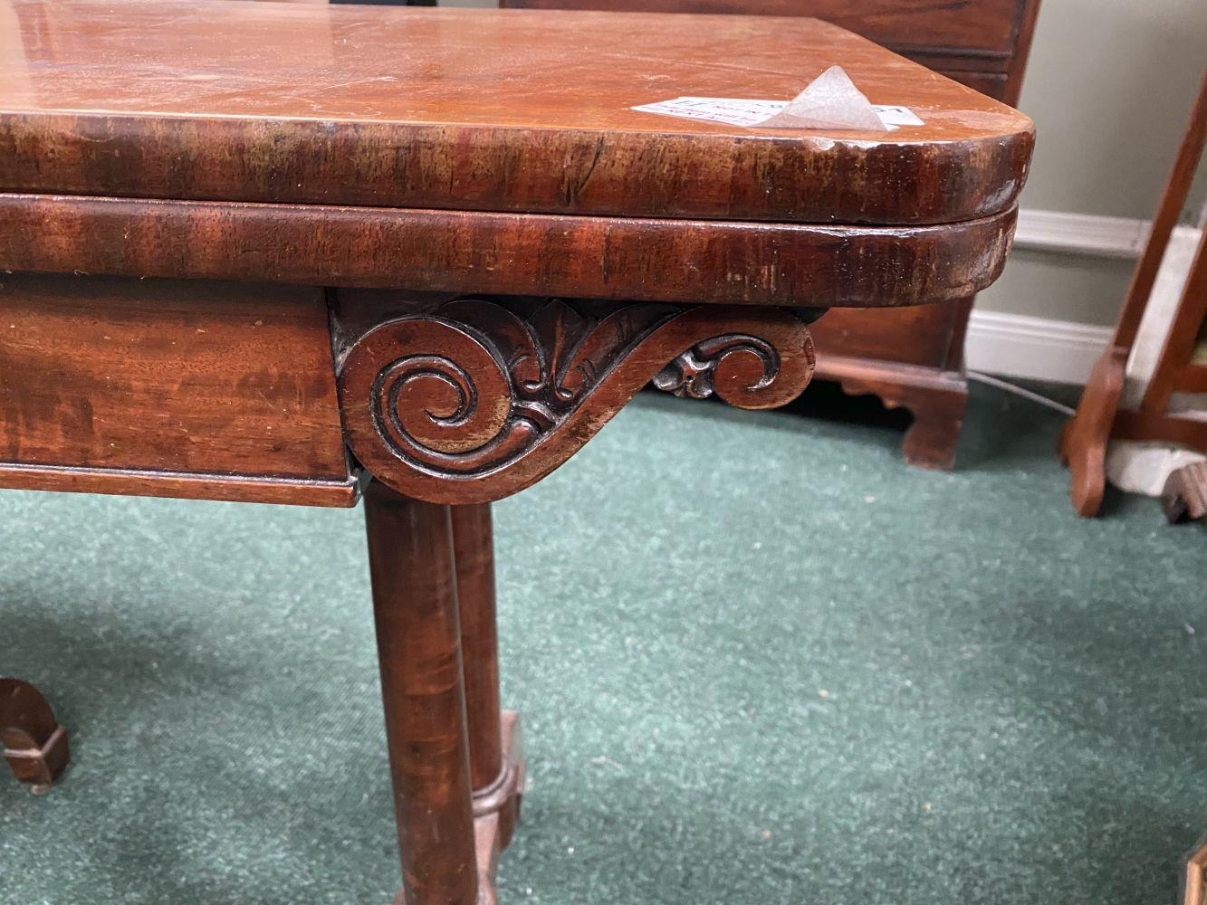 AN ATTRACTIVE MAHOGANY FOLD OVER CARD TABLE, with carved frieze, raised on a pair of side pods, each with a pair of tapered turned supports sitting on down turned curved spade feet, on castors. Dimensions: 36in x 29.5in x 17.5in approx. closed