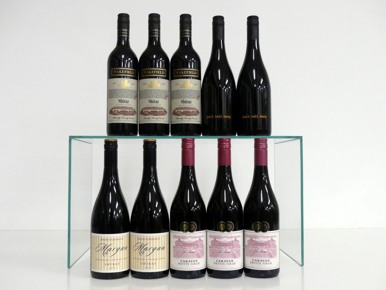 3 bts Wakefield Shiraz 2017 Clare Valley 2 bts McPherson 'Don't tell Gary' Shiraz 2018 Victoria 2 bts Broke Fordwich Margan Shiraz 2019 Hunter Valley sl ntl 3 bts Caravan Petite Syrah 2019 S E Australia vsl ntl Above 10 bottles