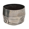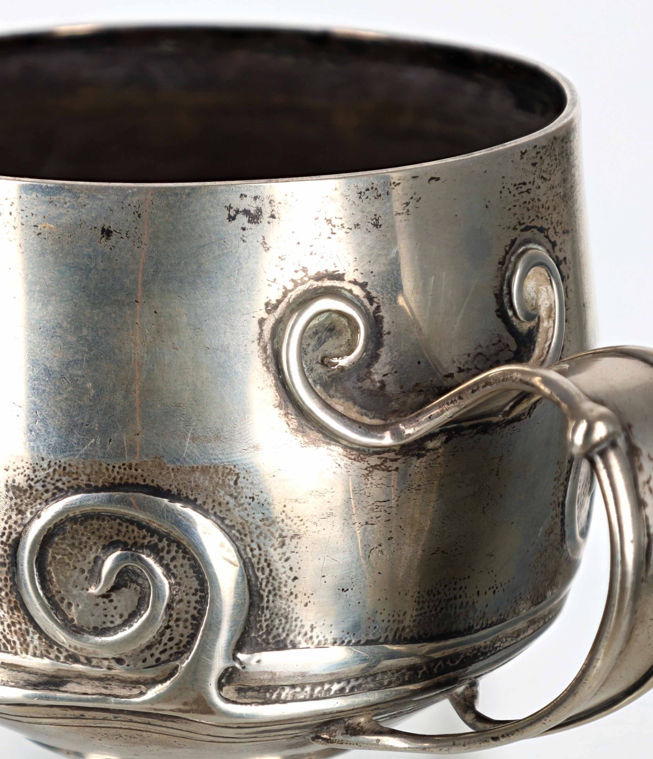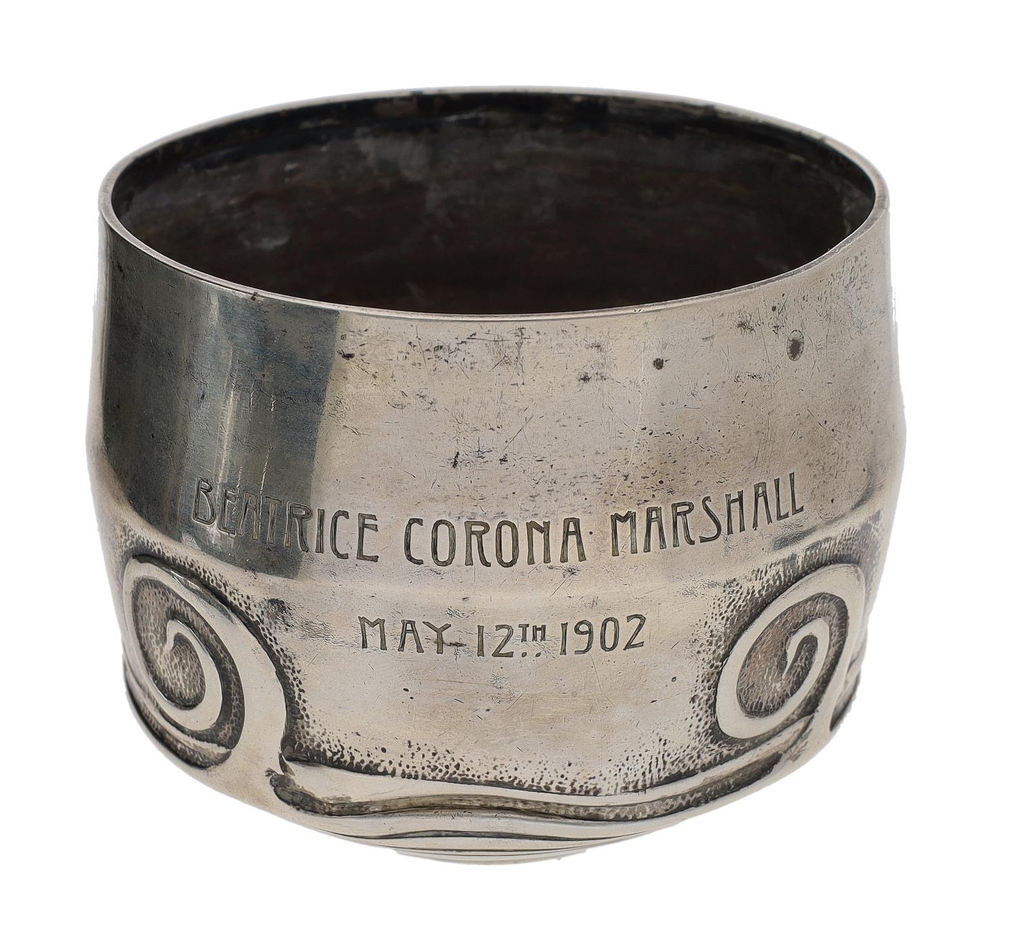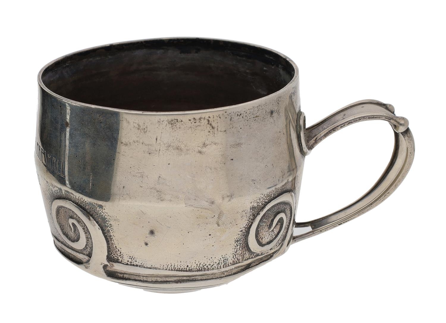 Liberty & Co. Art Nouveau silver mug, with scroll ornament to the sides and handle, presentation inscription Beatrice Corona Marshall, May 12th 1902, by Liberty & Co, Birmingham 1900, 3" high, 168gm