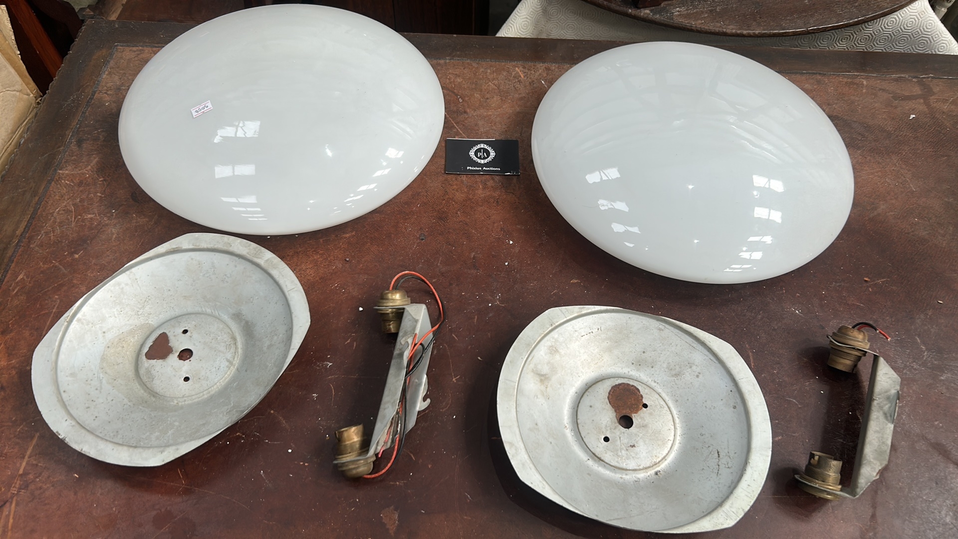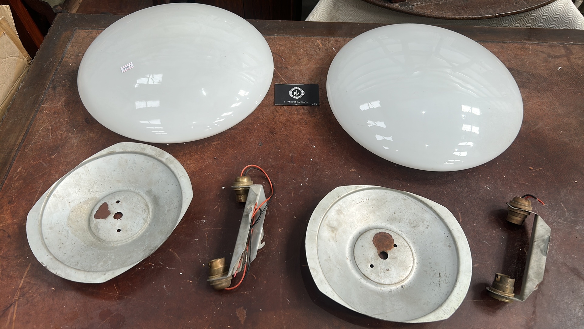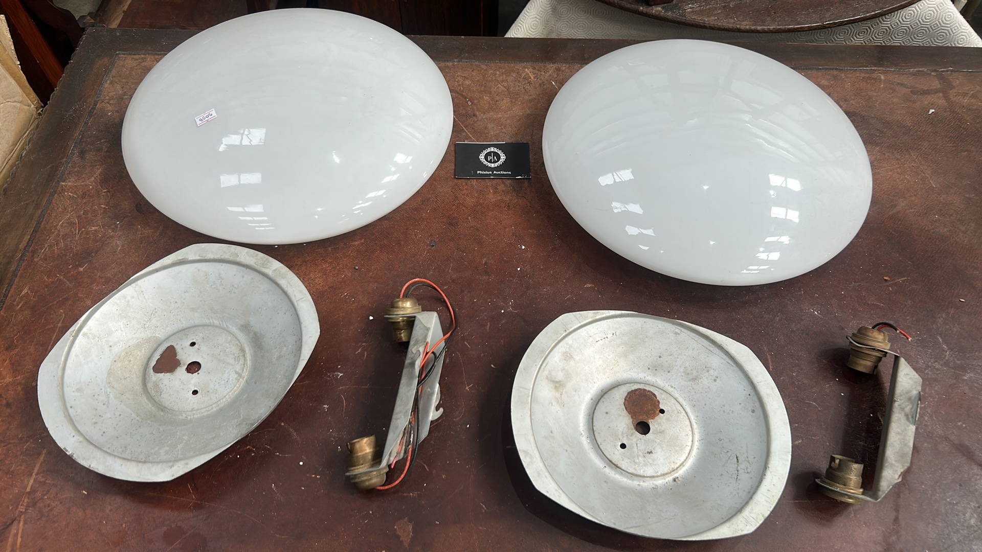 Pair of white opaline glass dome shades with aluminium backplates and twin bulb holders for flush ceiling mounting.
