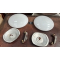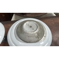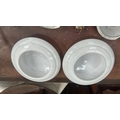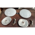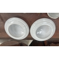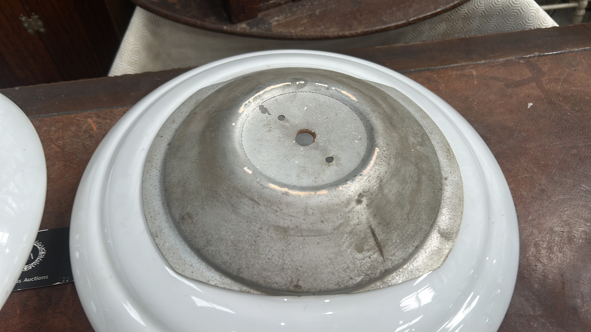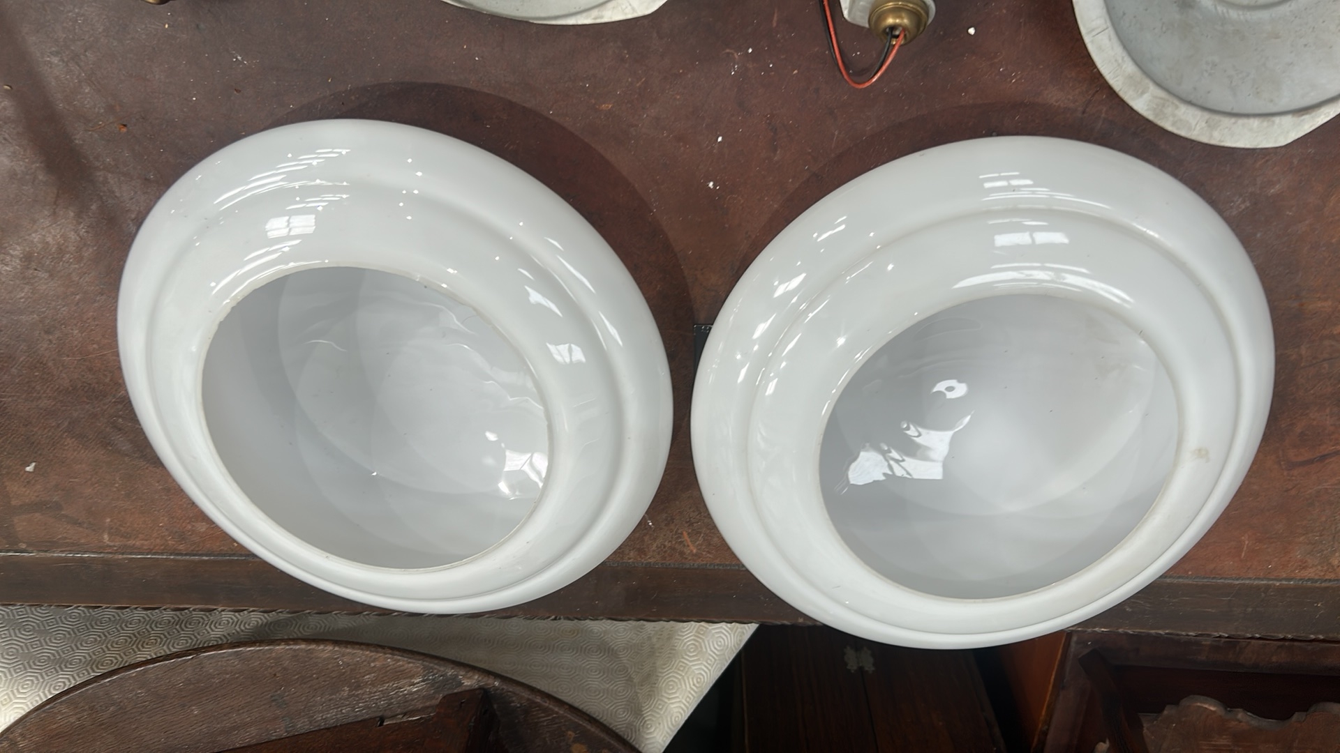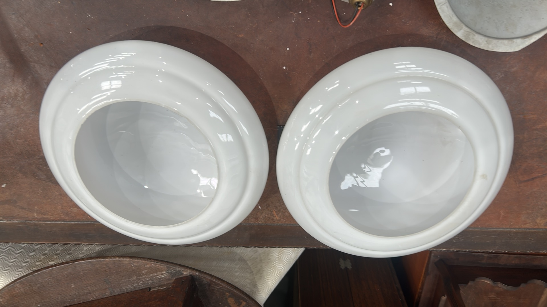 Pair of white opaline glass dome shades with aluminium backplates and twin bulb holders for flush ceiling mounting.