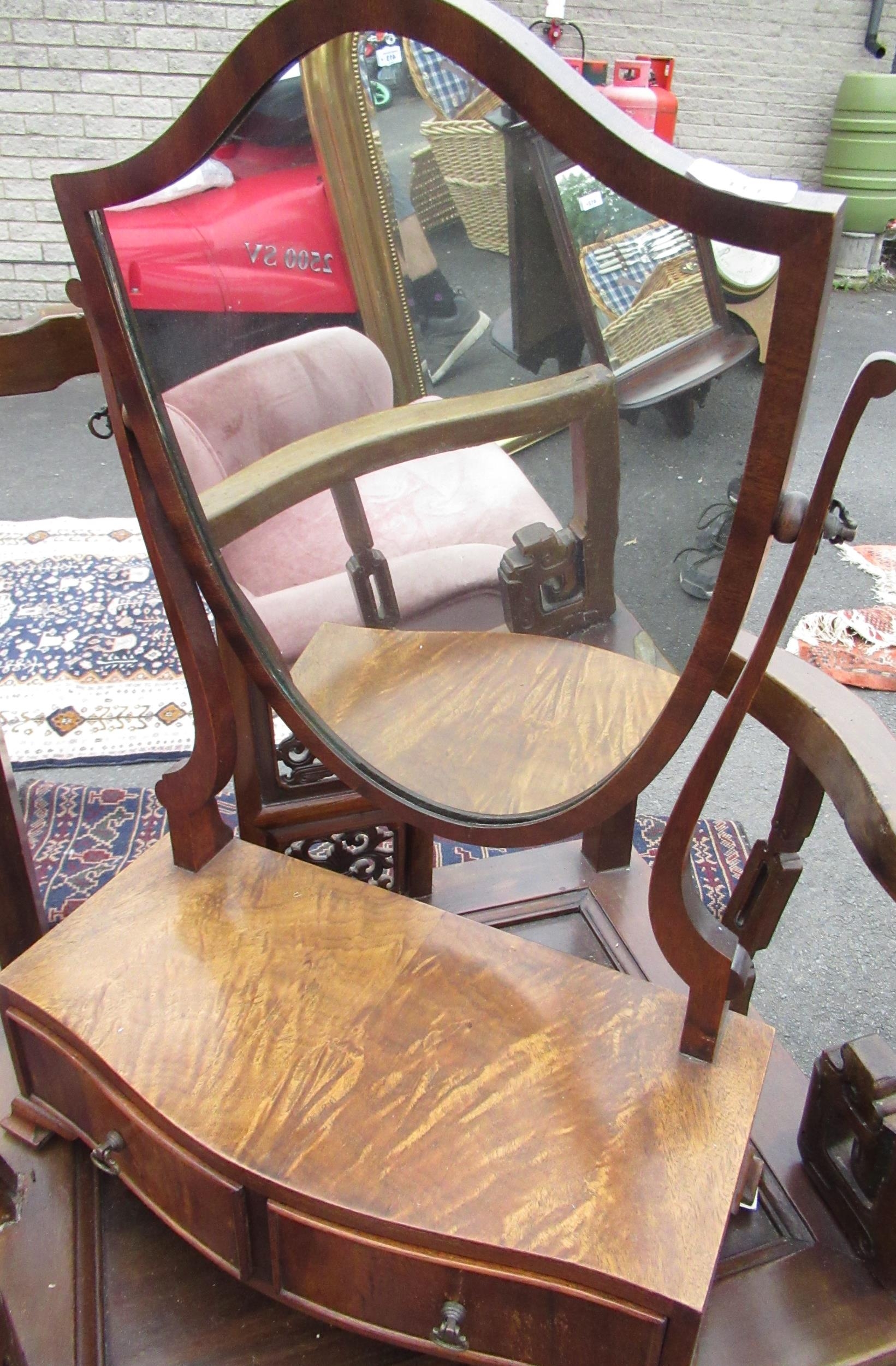 Mahogany free standing dressing table mirror with shaped mirror above two drawers to the base W43.5cm