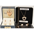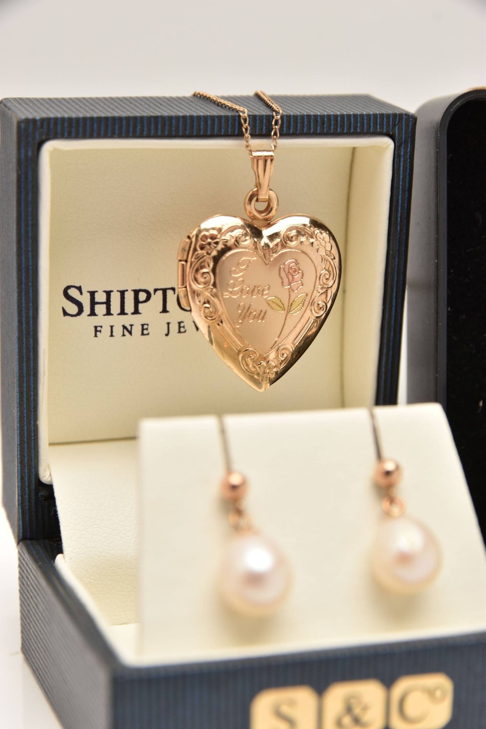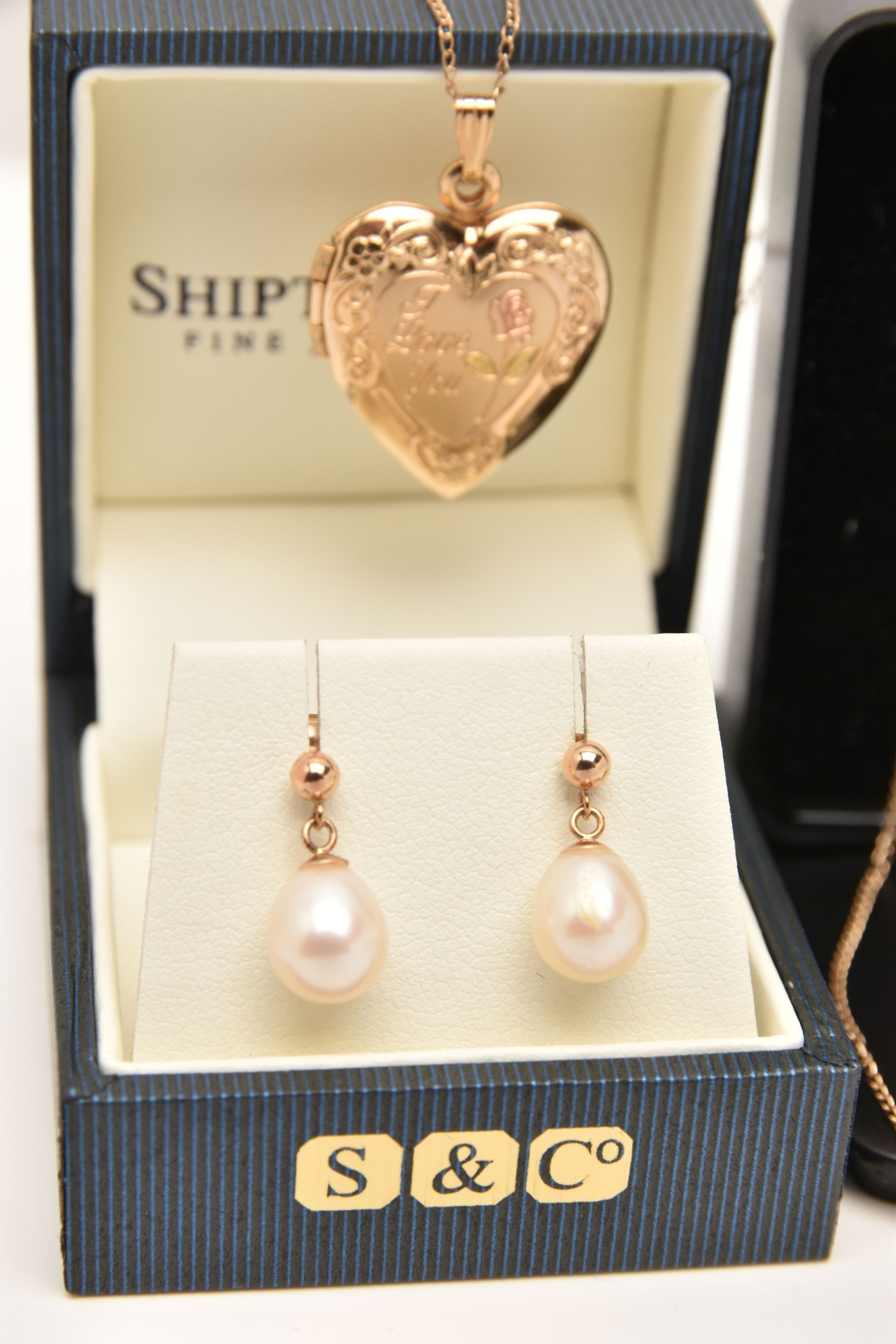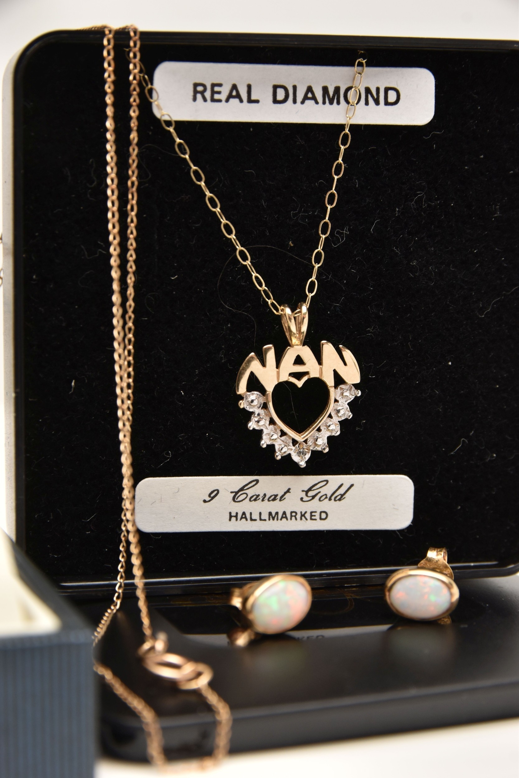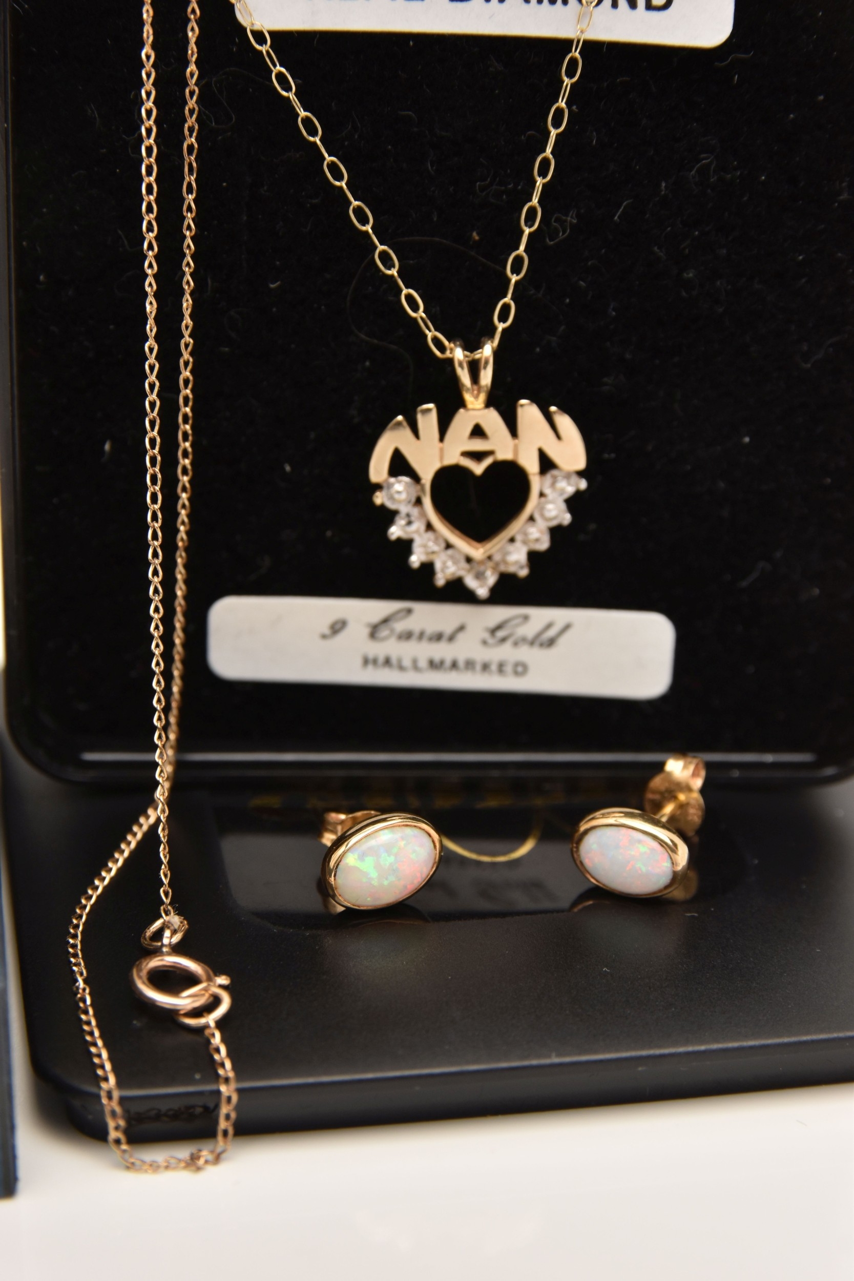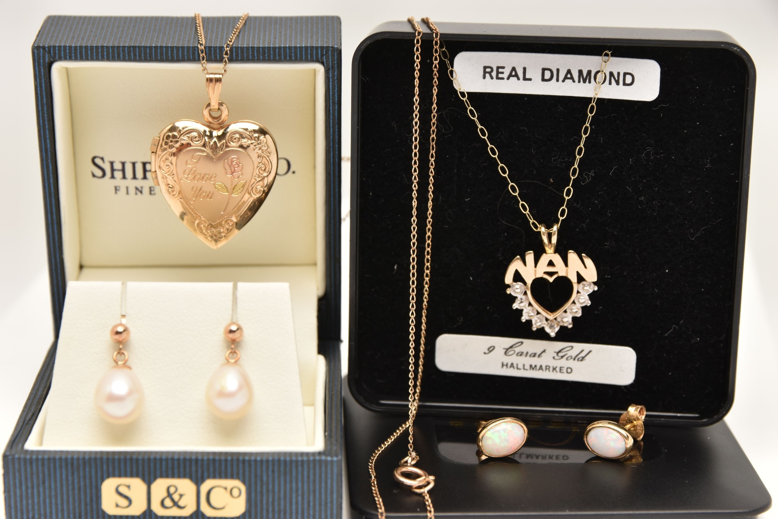 A SMALL ASSORTMENT OF JEWELLERY, to include a pair of 9ct gold opal stud earrings, post and scroll fittings stamped 18k, approximate gross weight 1.4 grams, together with a pair of yellow metal cultured pearl drop earrings, post and scroll fittings, stamped 375, a yellow metal 'Nan' pendant suspended from a fine trace chain with spring clasp stamped 375, approximate gross weight 2.7 grams, a gold front and back heart padlock clasp, stamped 14k with a fine curb link chain and spring clasp stamped 14k GF